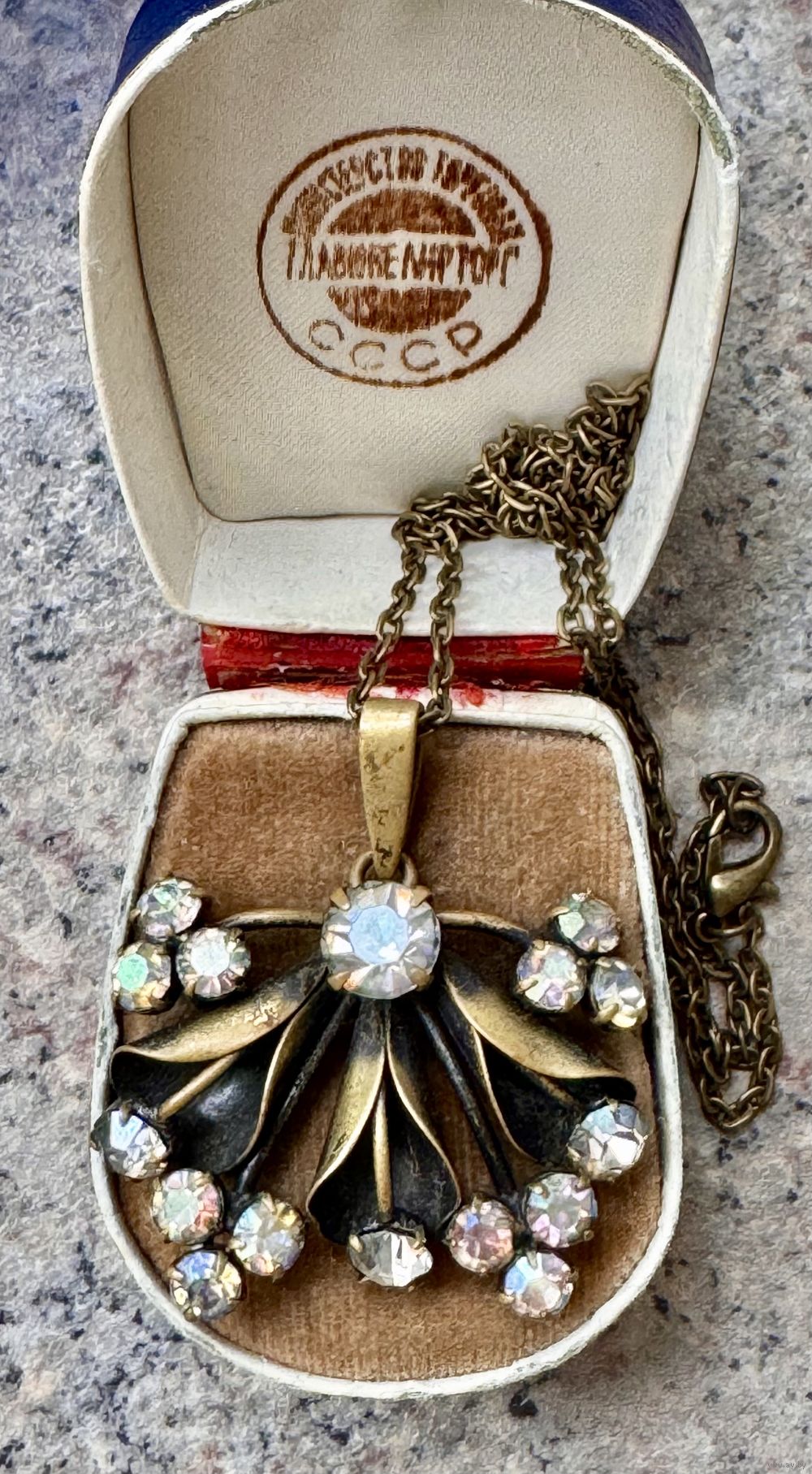 Винтажный кулон из латуни со вставками из стекла с покрытием AB. Высота с петлей 4,5см., ширина 4см. Длина цепочки 45 см. Состояние хорошее.