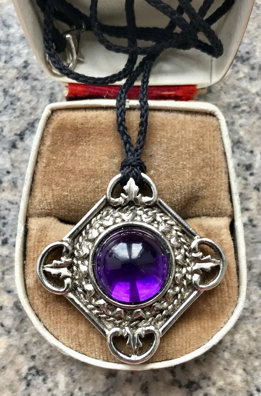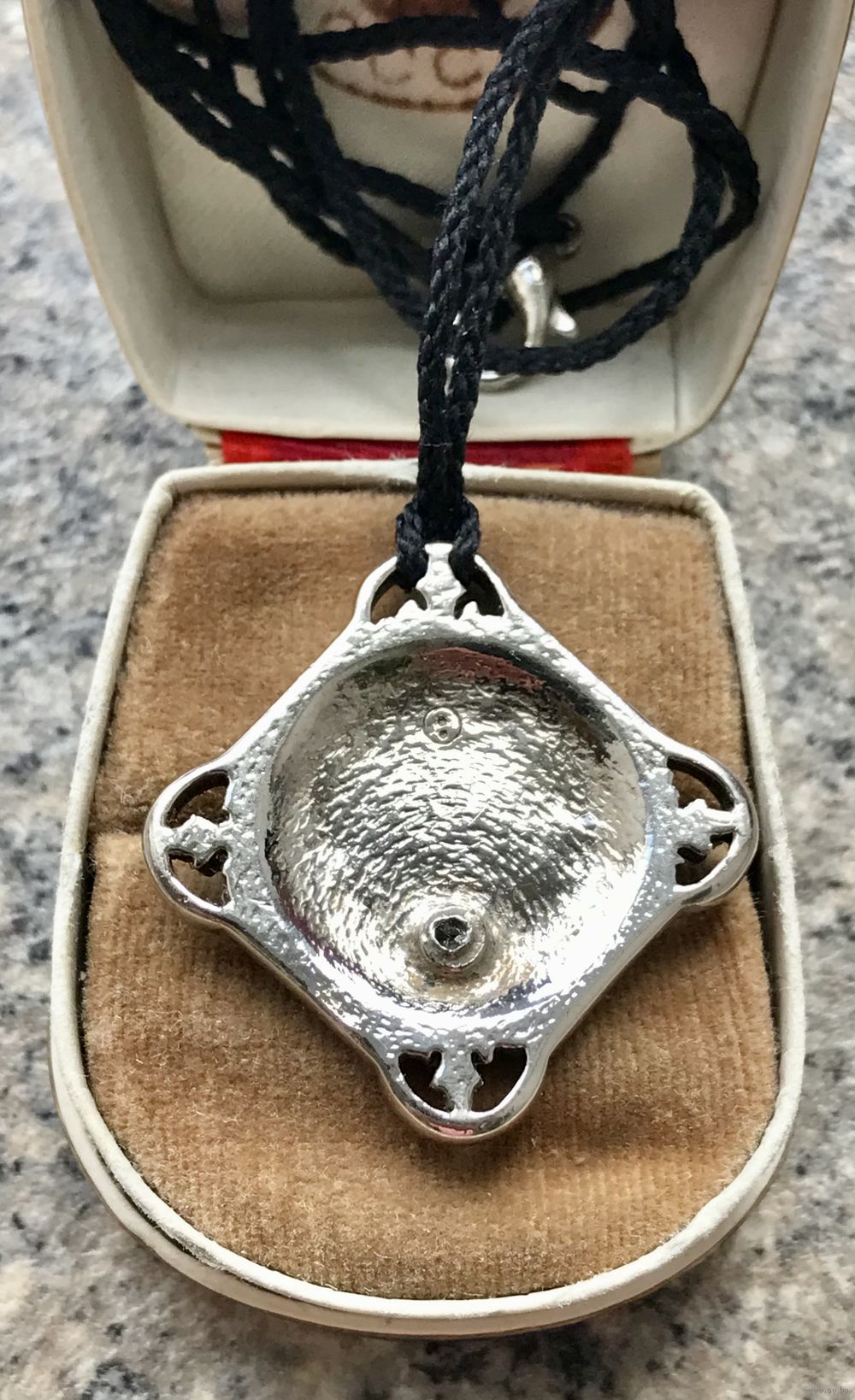Кулон, сделаный из винтажной серьги Avon из металла серебристого тона и вставкой из стекла, на текстильном шнурке. Размер кулона 2,5х2,5см., диаметр вставки 1,2см. Длина шнурка 62см. Маркирован. Состояние хорошее.
