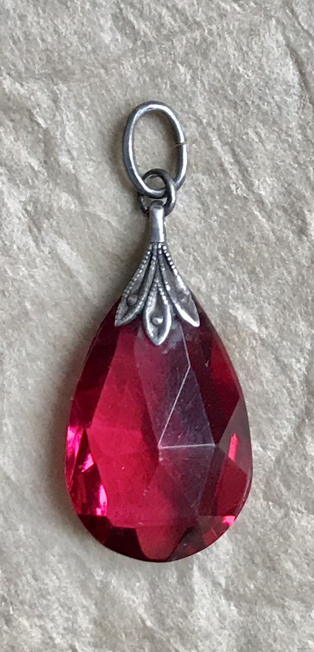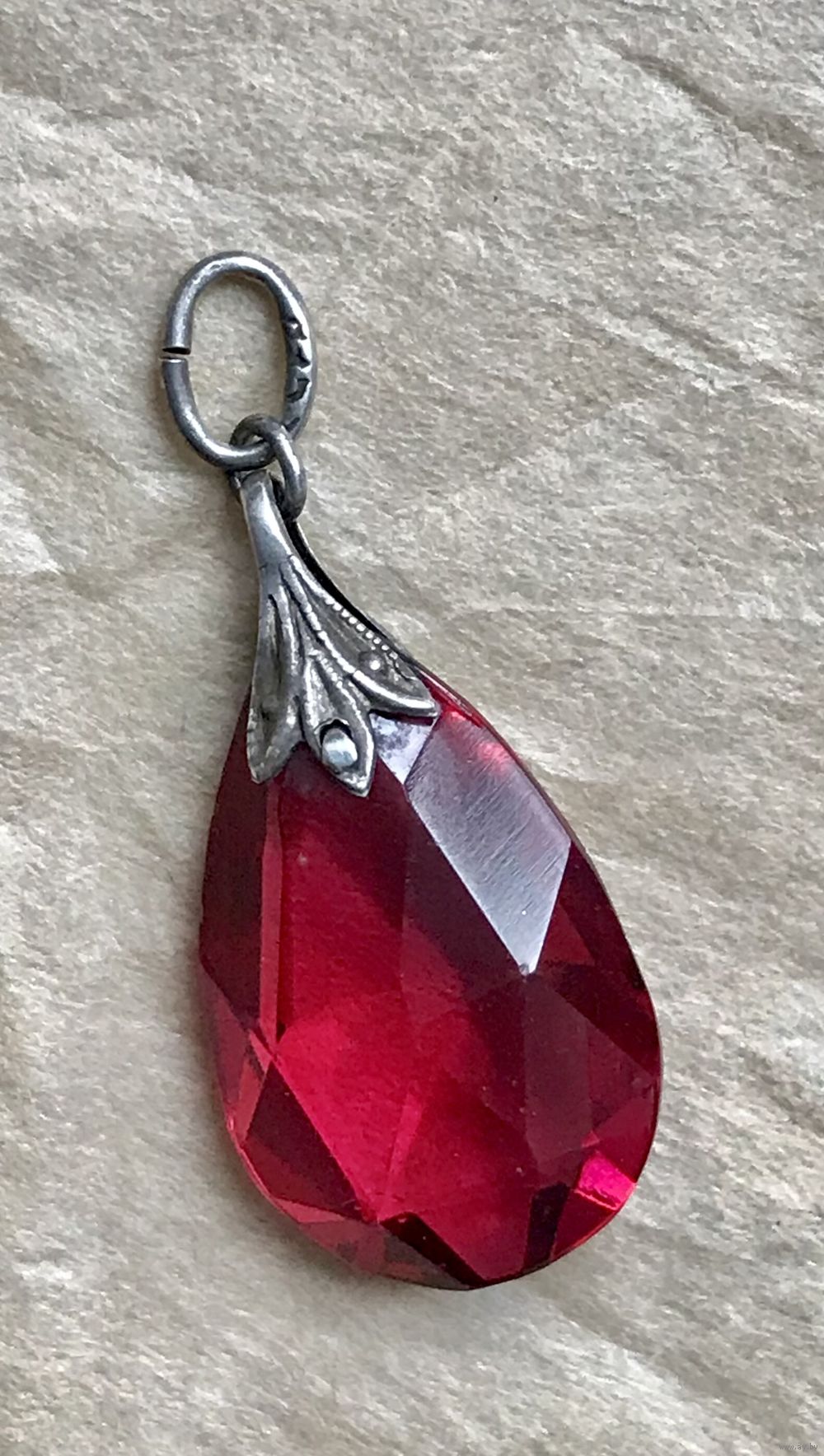 Винтажный кулон, привезён из Европы. Серебро и кристалл малинового цвета. На колечке стоит отметка, атрибутировать не удалось, металл проверен в юв. мастерской. Высота кулона с петлей 2,8см., размер вставки 1,8х1,2см. Состояние хорошее.
