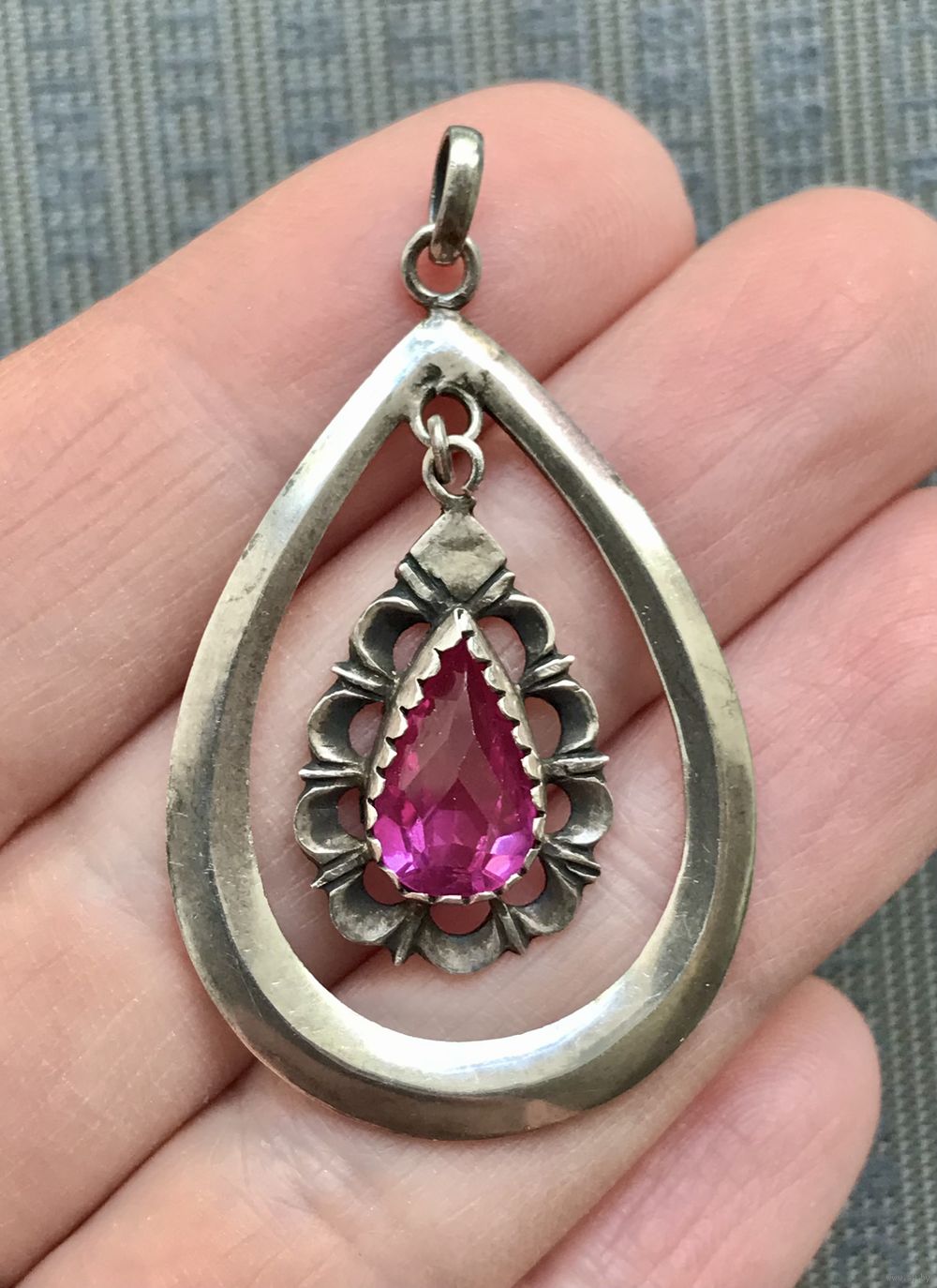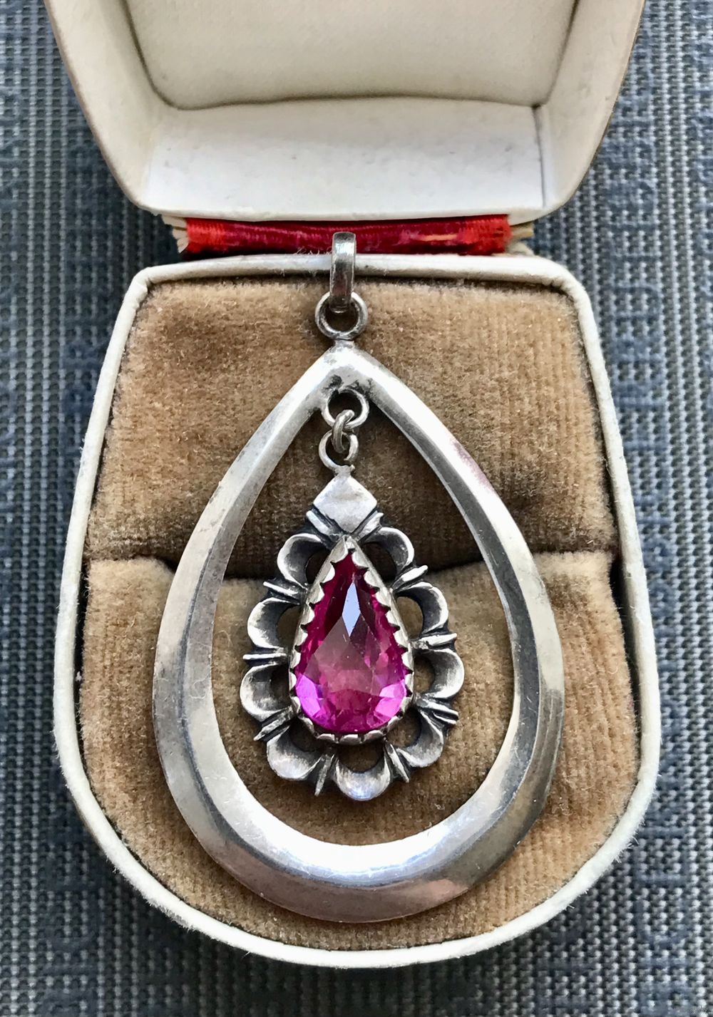 Крупный кулон из серебра 900 пр. со вставкой из стекла. Предположительно Германия, первая половина ХХв. Высота кулона с петлей 4,6см., размер подвески 4,2х2,7см. Элемент со вставкой подвижный. Состояние хорошее.