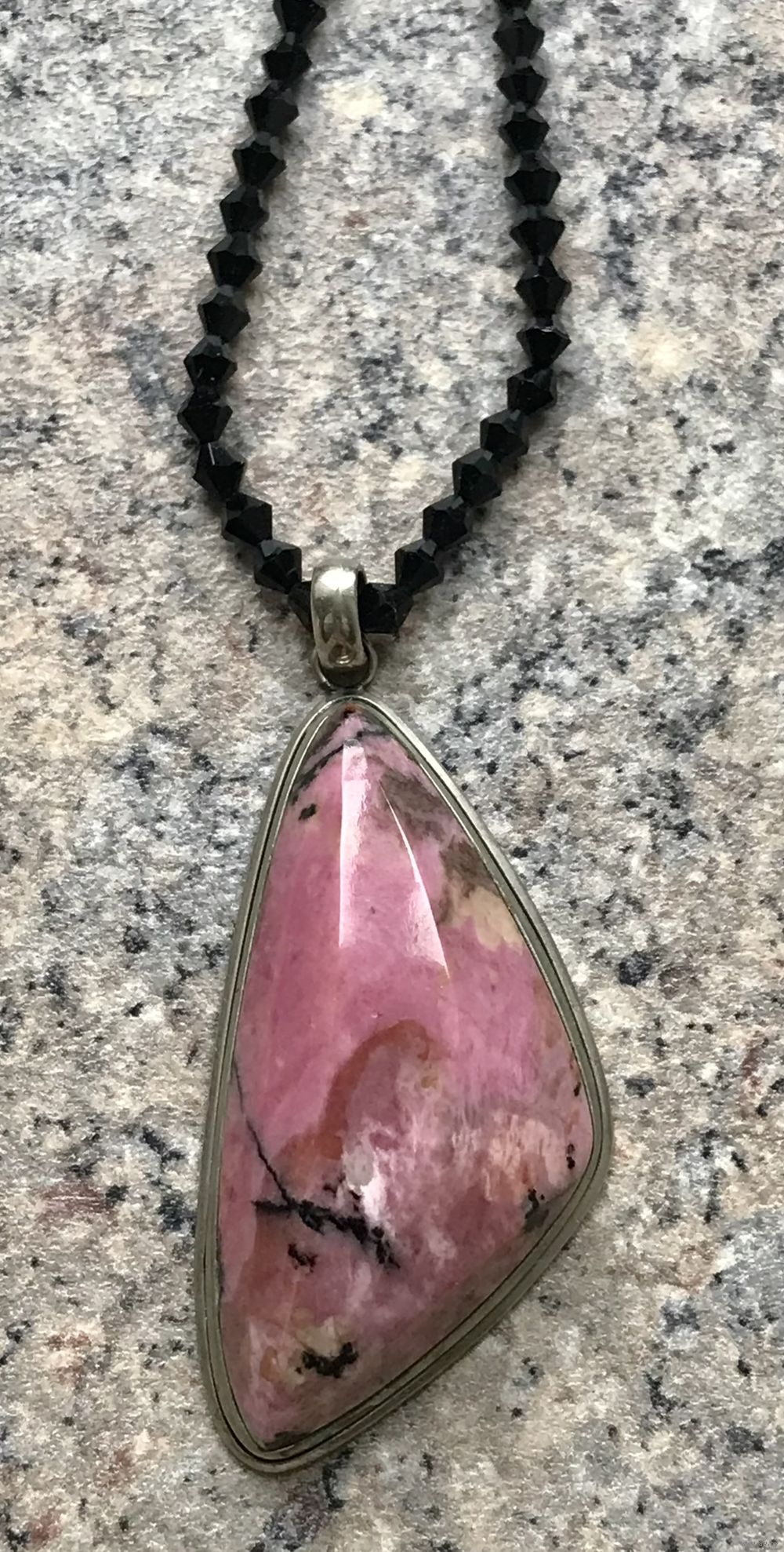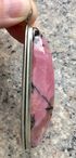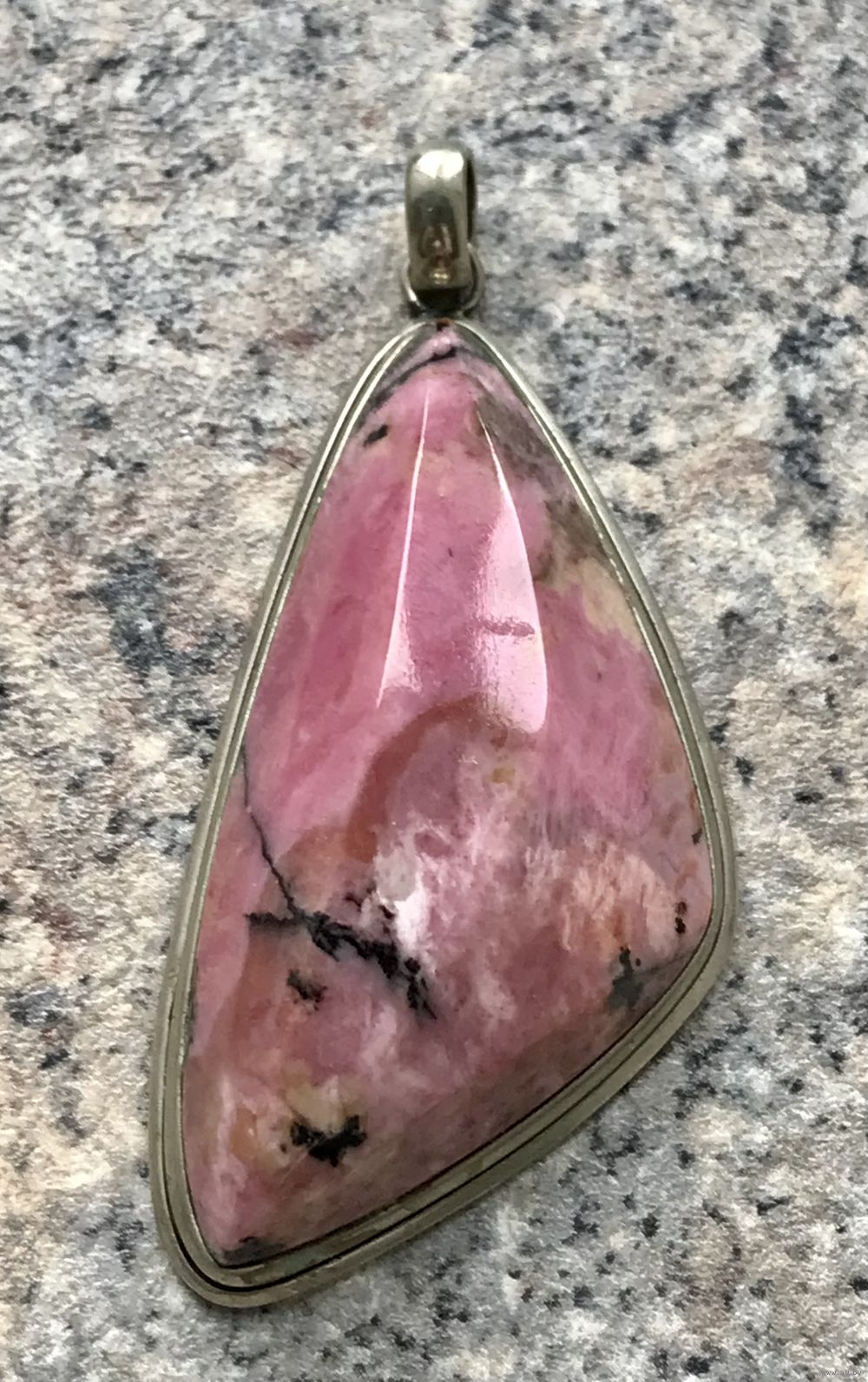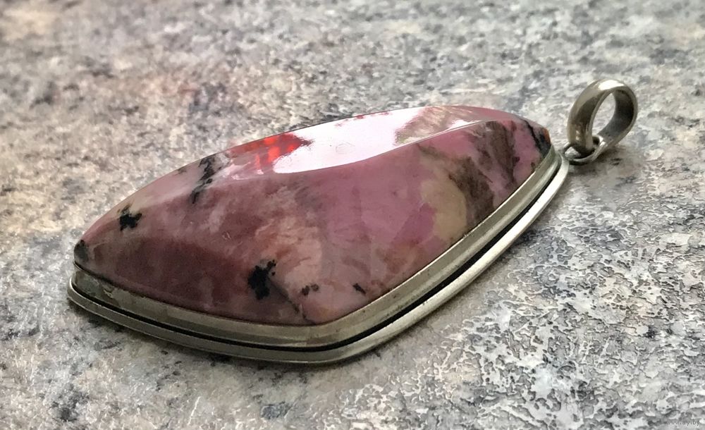 Крупный кулон с основой из мельхиора и вставкой из родонита. Высота кулона с петлей 6,5см., размер вставки 5,5х3х1,5см. Состояние хорошее.