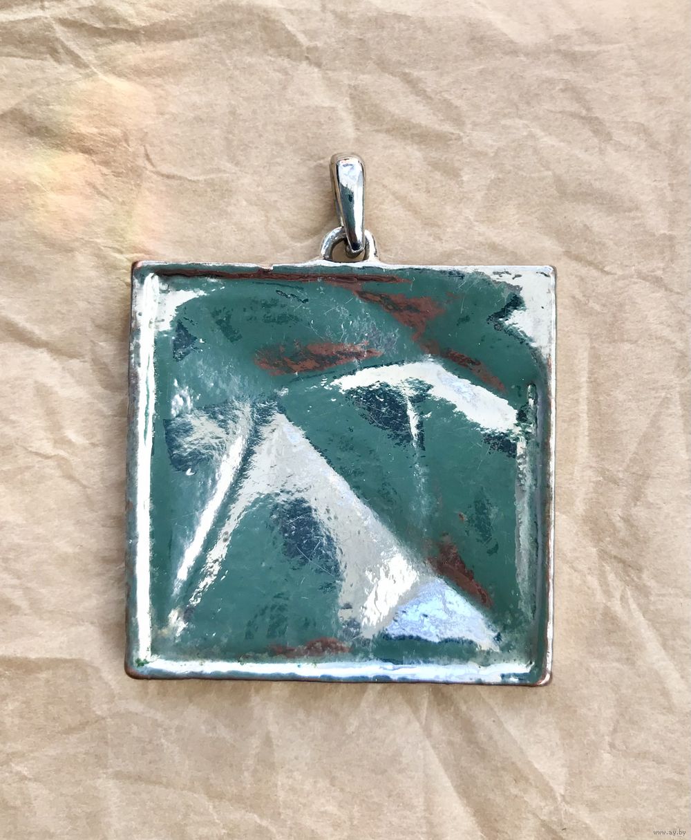 Крупный кулон из металла серебристого тона, на лицевой стороне эмаль. На металле и эмали имеются потёртости и царапки. Высота кулона с петлей 5,8см., размер кулона 4,5х4,5см. Тяжёленький.