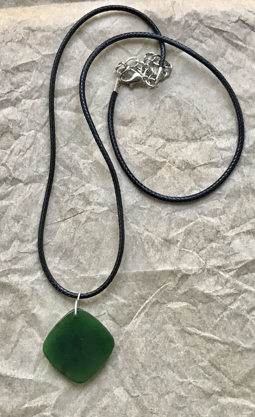 Винтажный кулон из нефрита. Накладка на лицевой стороне и петля сделаны из мельхиора. Кулон изготовлен на московском заводе «Сапфир» в период СССР. Высота кулона с петлей 2,8см., размер подвески 2,3х2,3см., толщина 0,3см. Состояние хорошее.