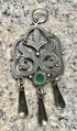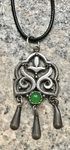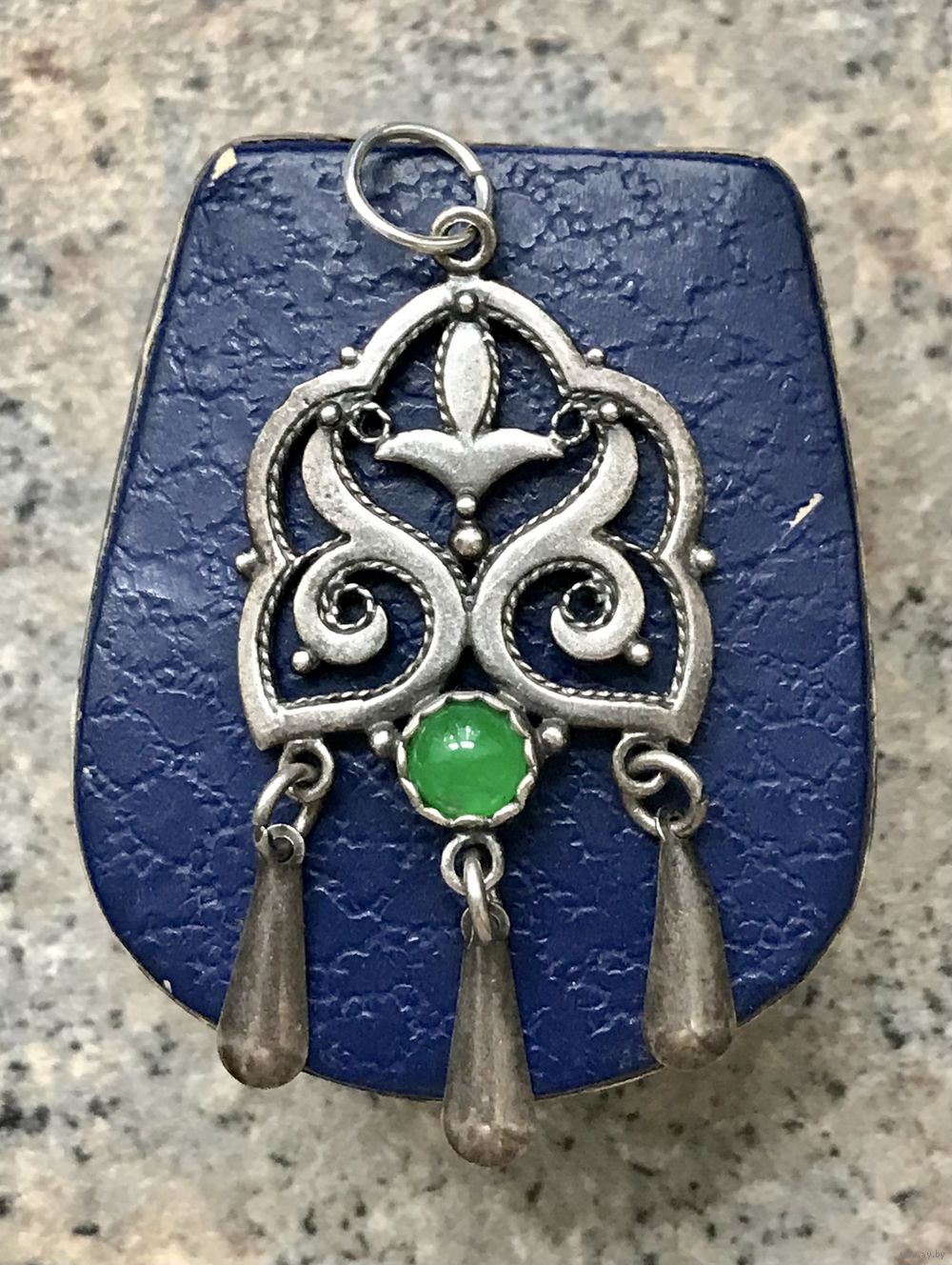 Кулон из металла с серебрением и вставкой из камня? стекла? Высота с петлей 5,8см., размер подвески 5,1х2,5см., диаметр вставки 0,6см. Состояние хорошее.