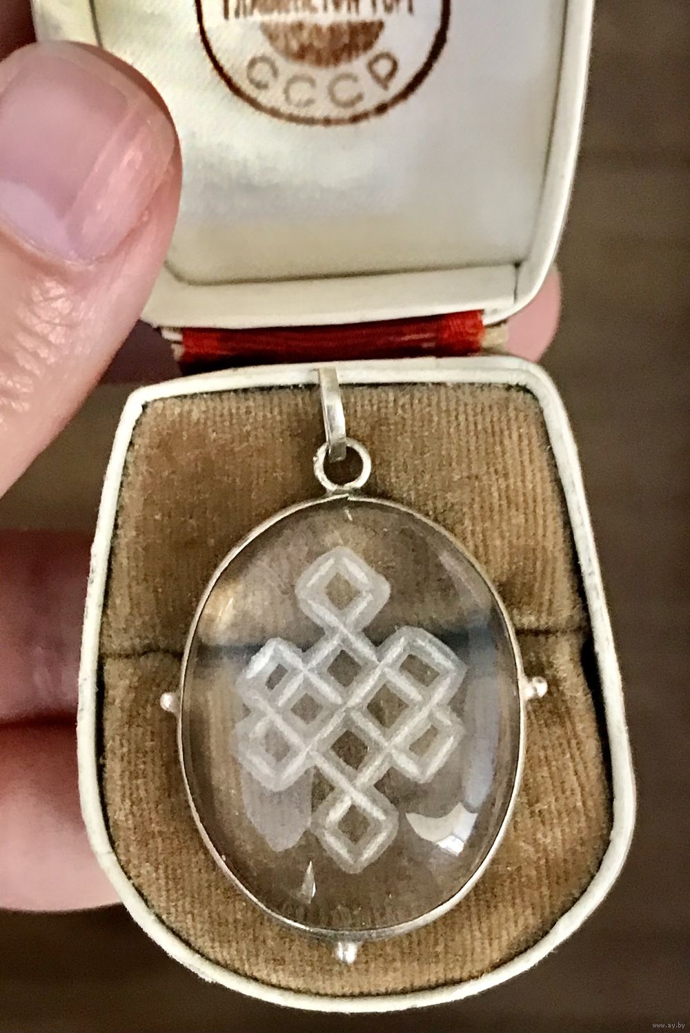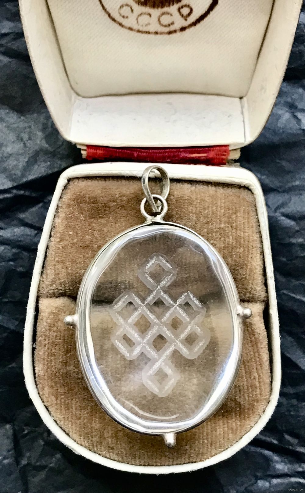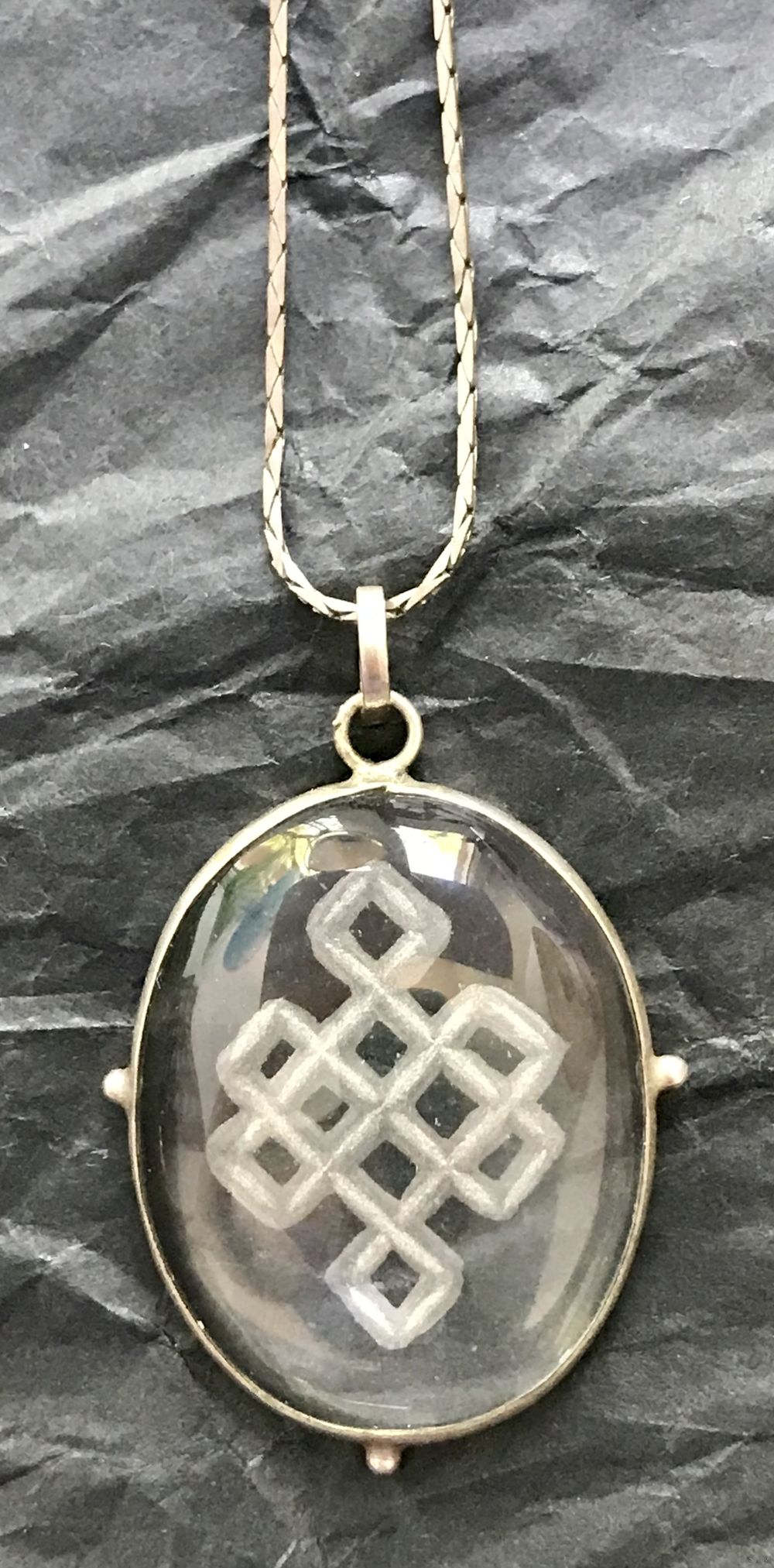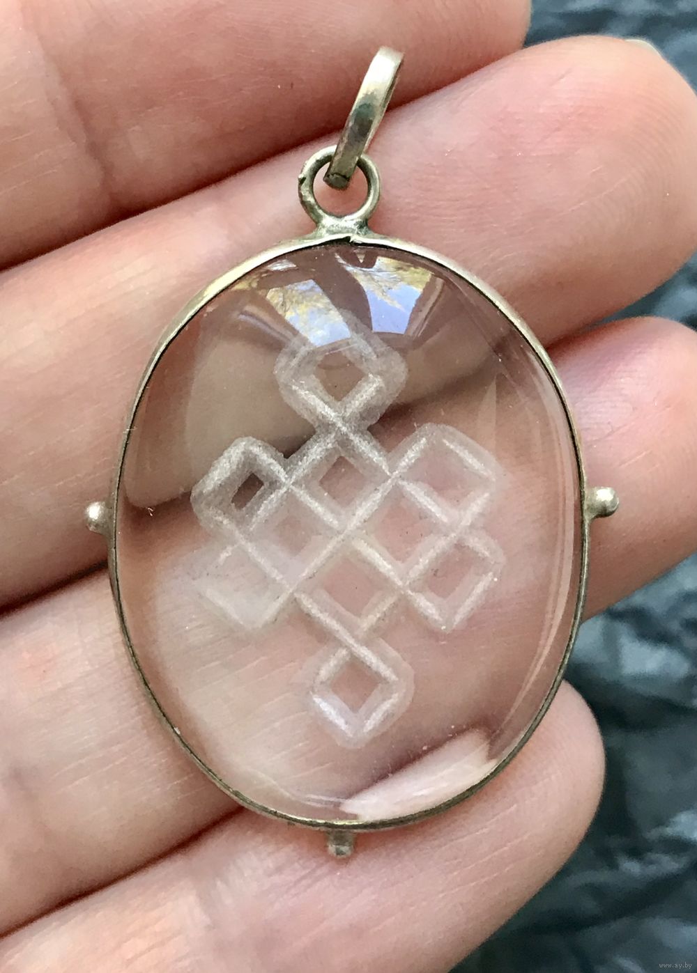 Кулон из кварца в обрамлении из нейзильбера. На обратной стороне вручную вырезан древний символ удачи-тибетский узел бесконечности. Высота кулона с петлей 4,3см., размер камня 3х2,3см. Состояние хорошее.