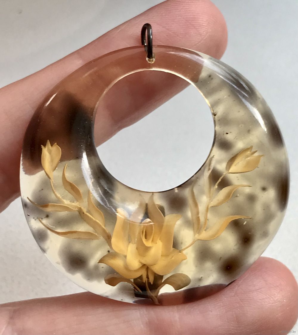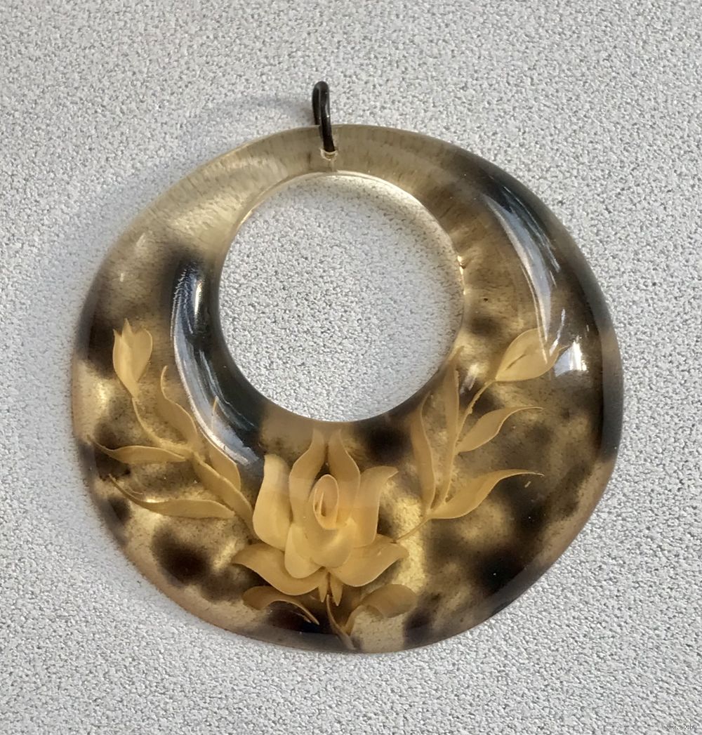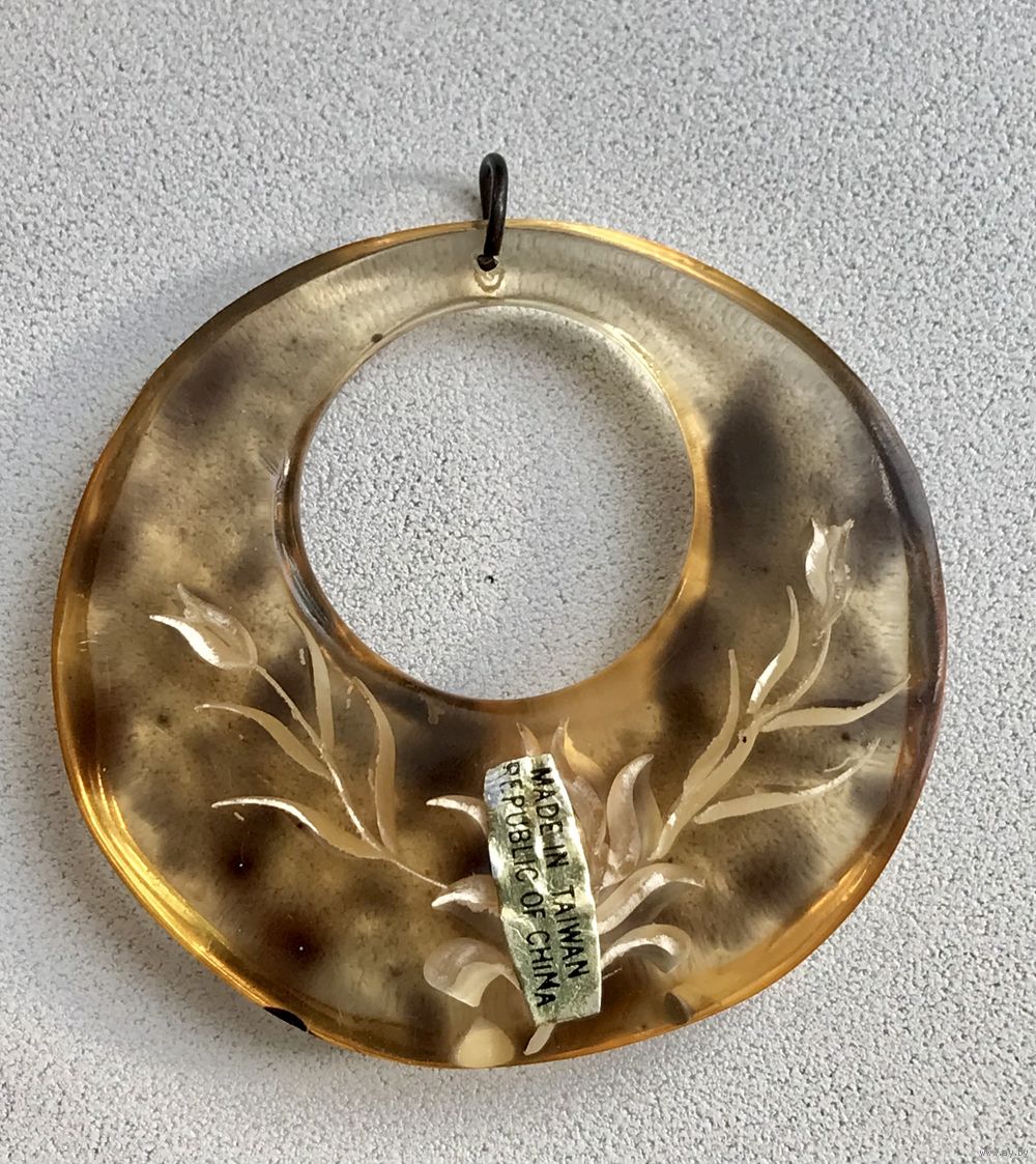 Винтажный кулон из люцита под черепаху, с обратной стороны вырезан цветочный узор. Высота кулона с петлей 4,6см., диаметр 4,3см. Сохранилась наклейка (Made in Taiwan. Republic of China). Состояние хорошее.