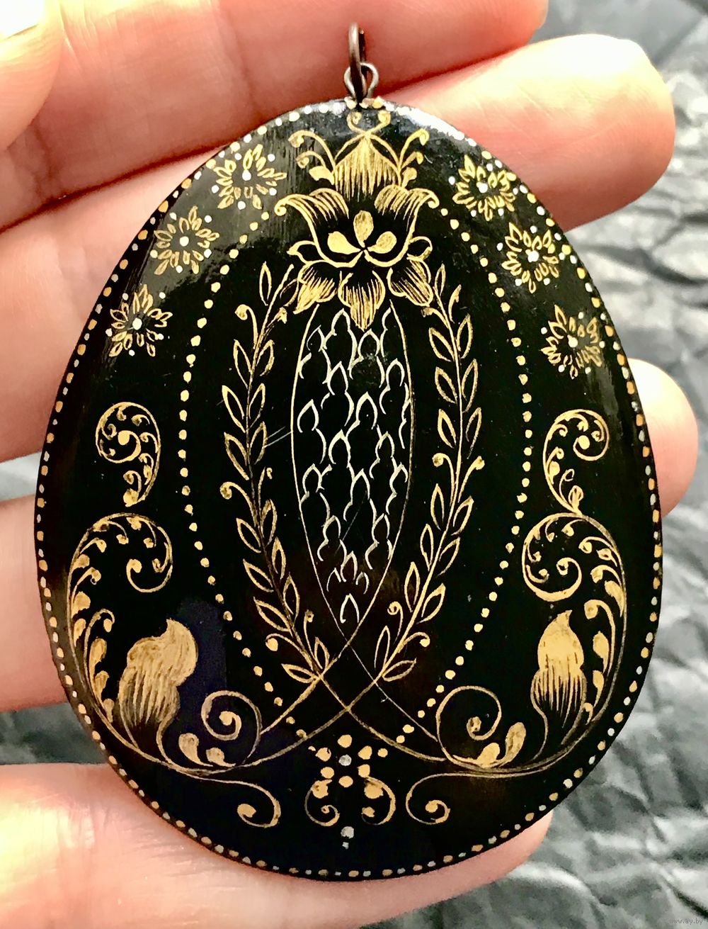 Винтажный кулон в технике лаковая миниатюра. Высота с петлей 6,5см. С обратной стороны и по краю кулона есть несколько незначительных потёртостей. Общее состояние хорошее.