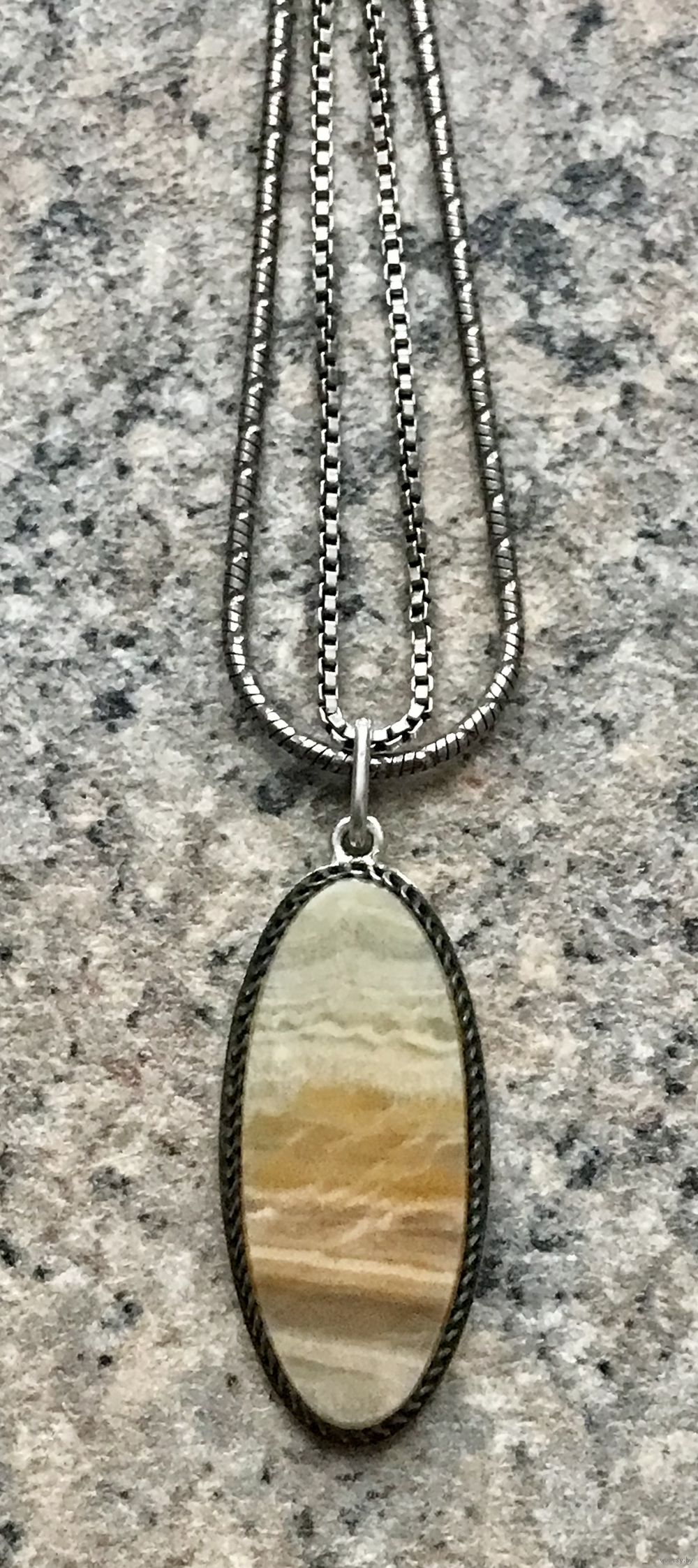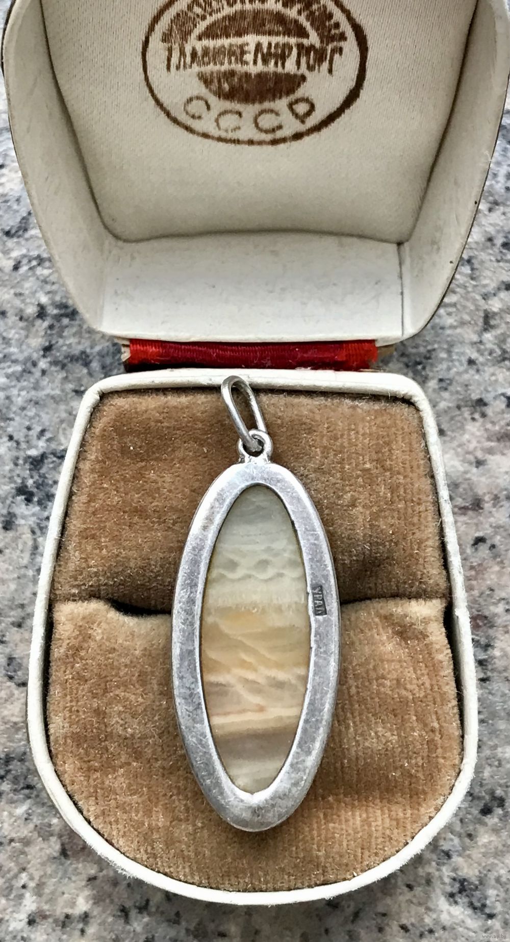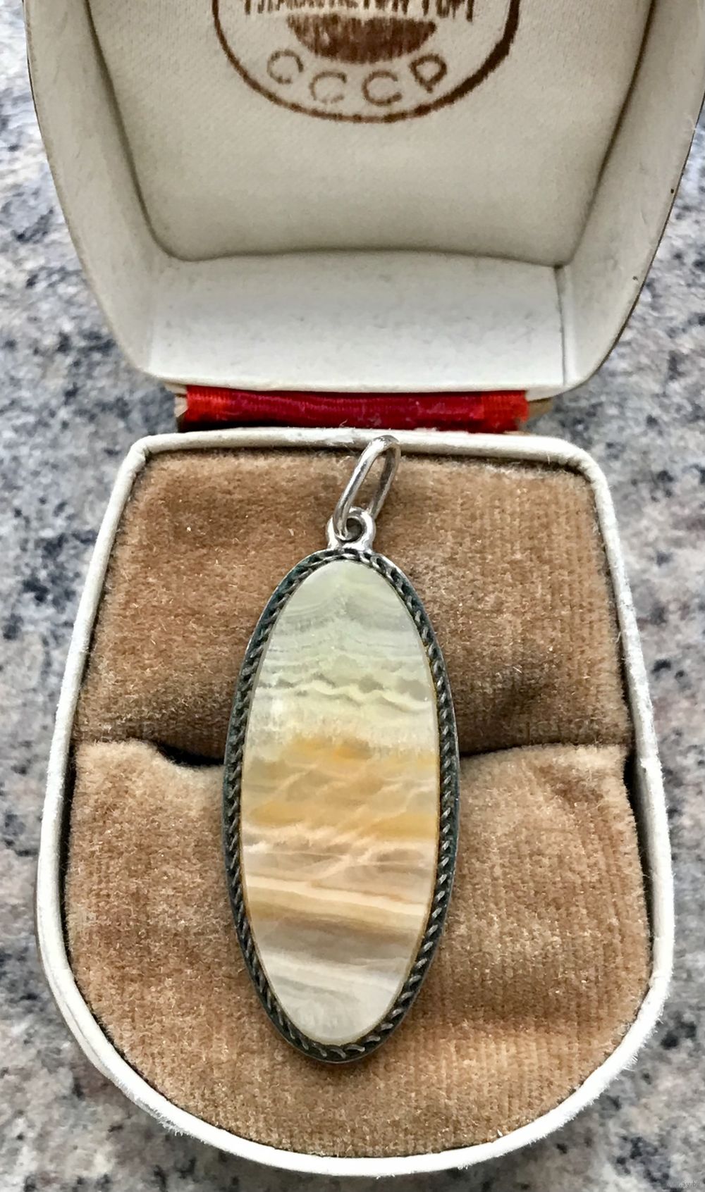 Кулон, переделанный из серьги с основой из серебра 875пр, Свердловский ювелирный завод (из отметок сохранилось только клеймо УРАЛ). Вставка из агата. Высота кулона с петлей 4см., размер вставки 3х1,3см.