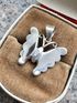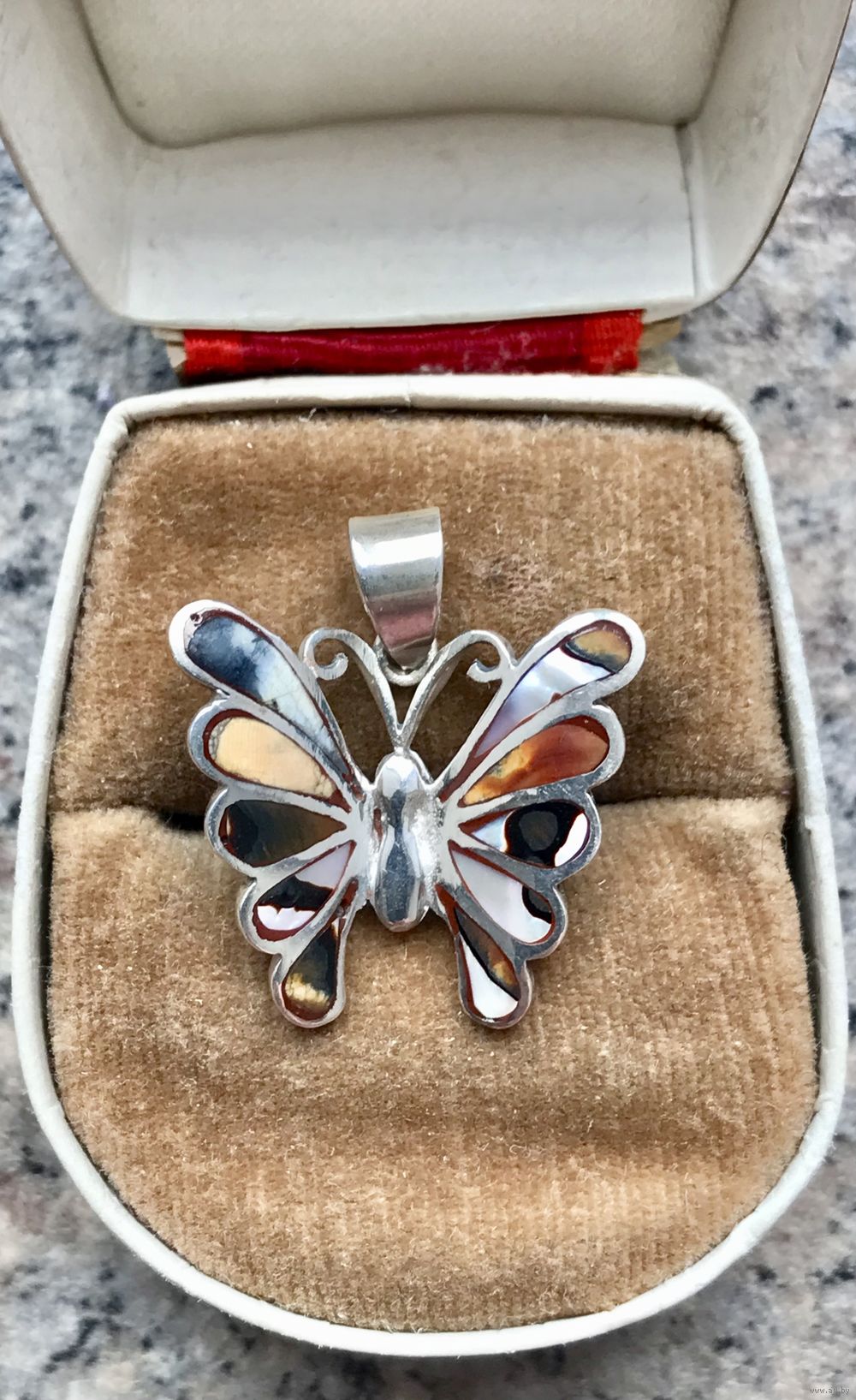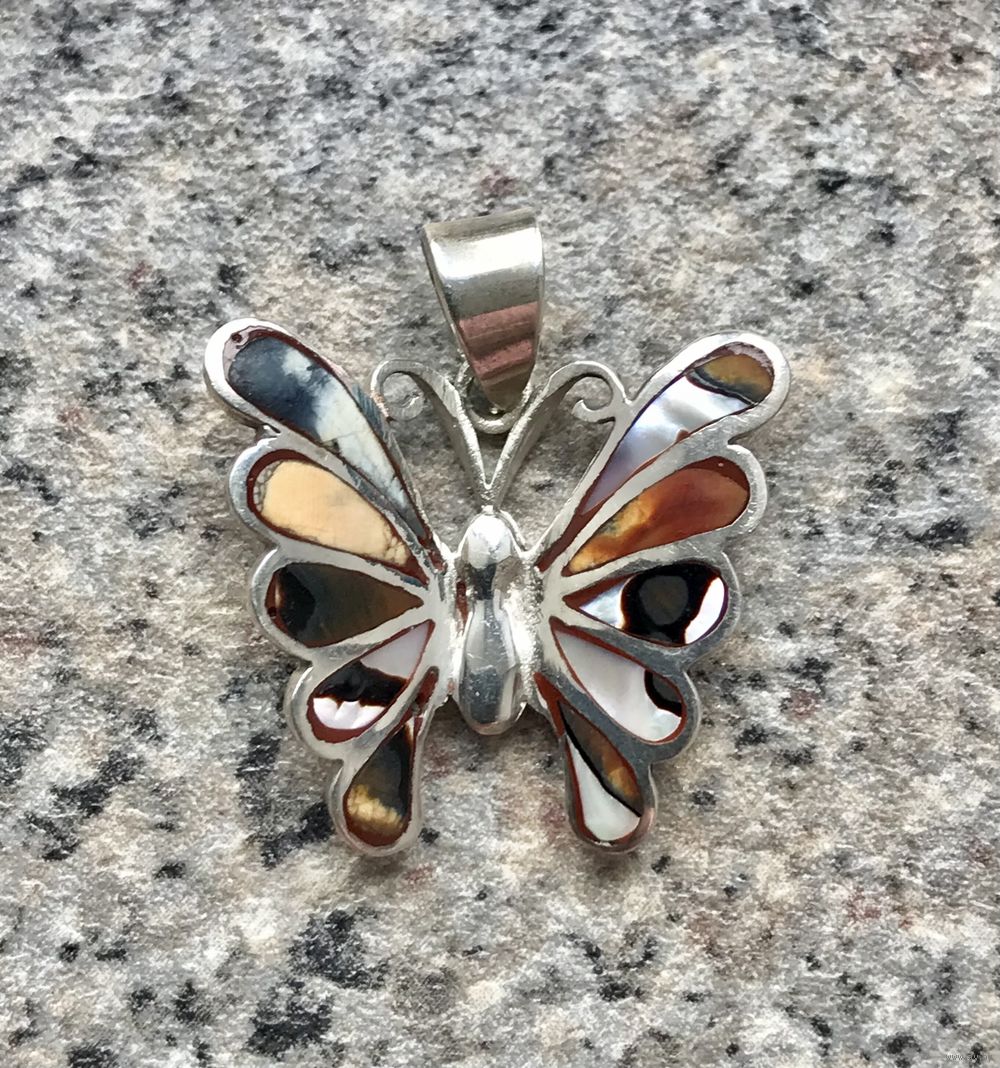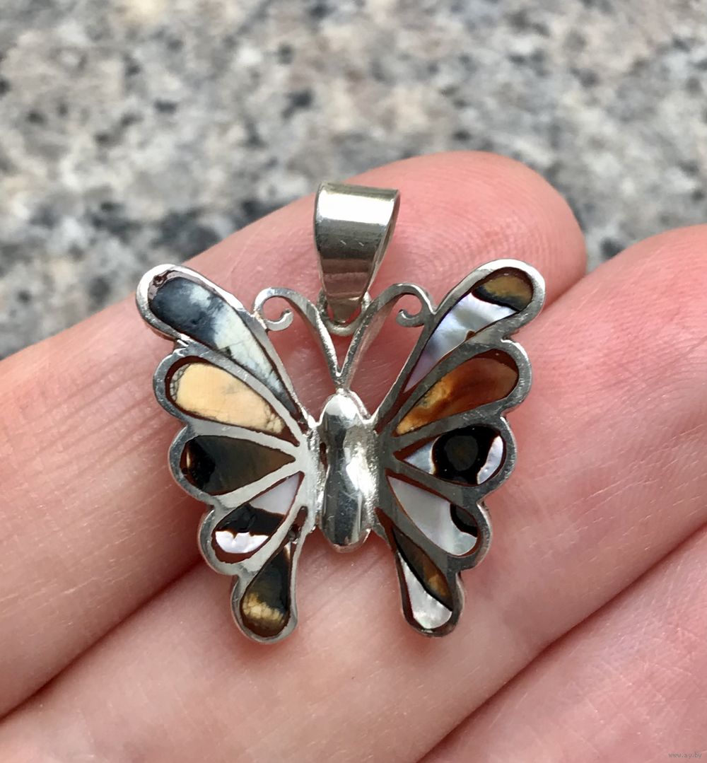 Небольшой кулон из серебра 925пр.(стоит отметка 925 и пробирное клеймо с зубром) и вставок из перламутра. Высота с петлей 2,5см., размер бабочки 2,1х2,3см. Состояние хорошее.
