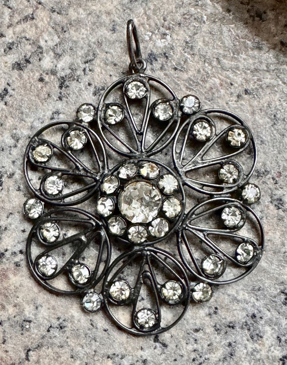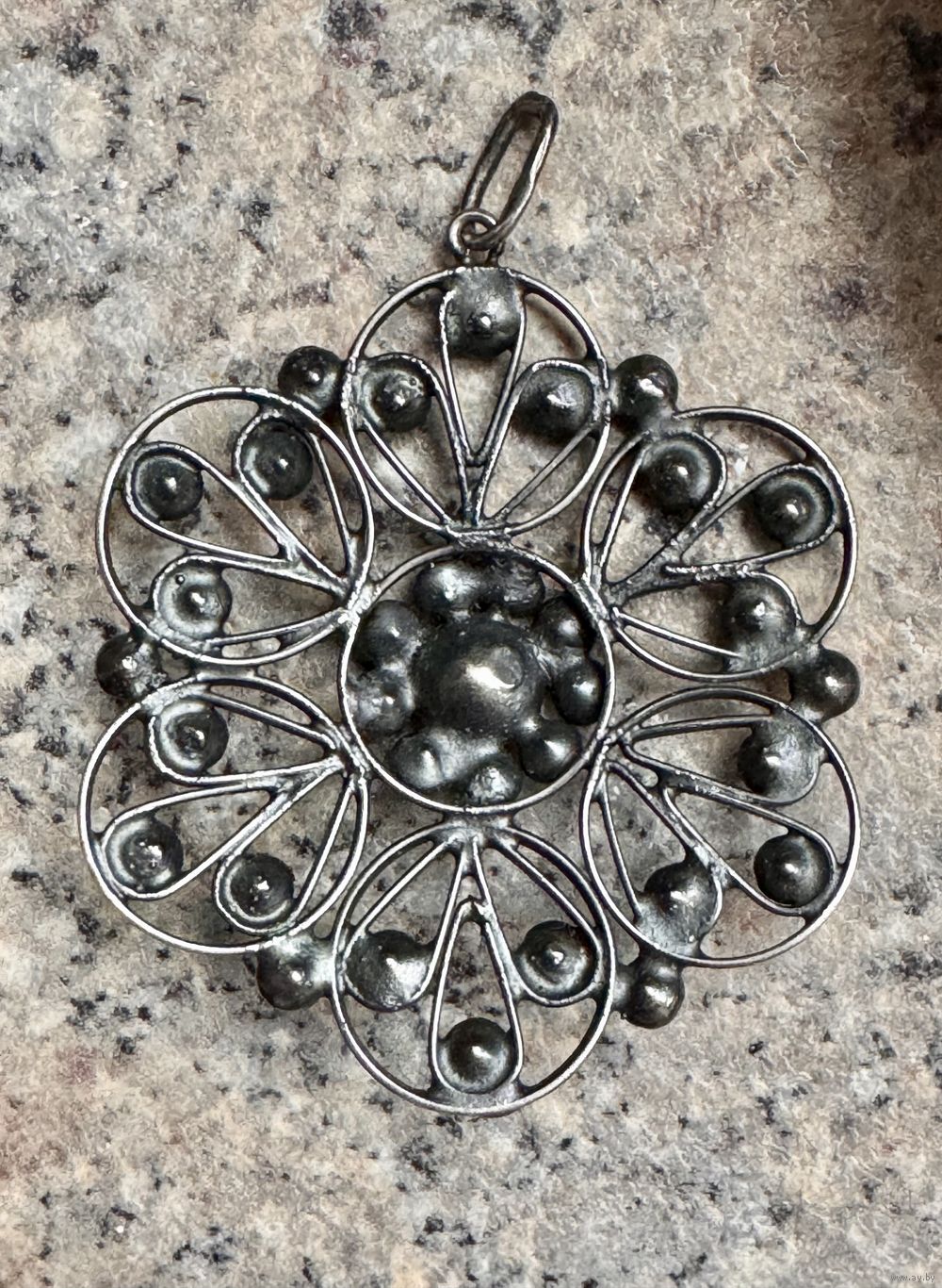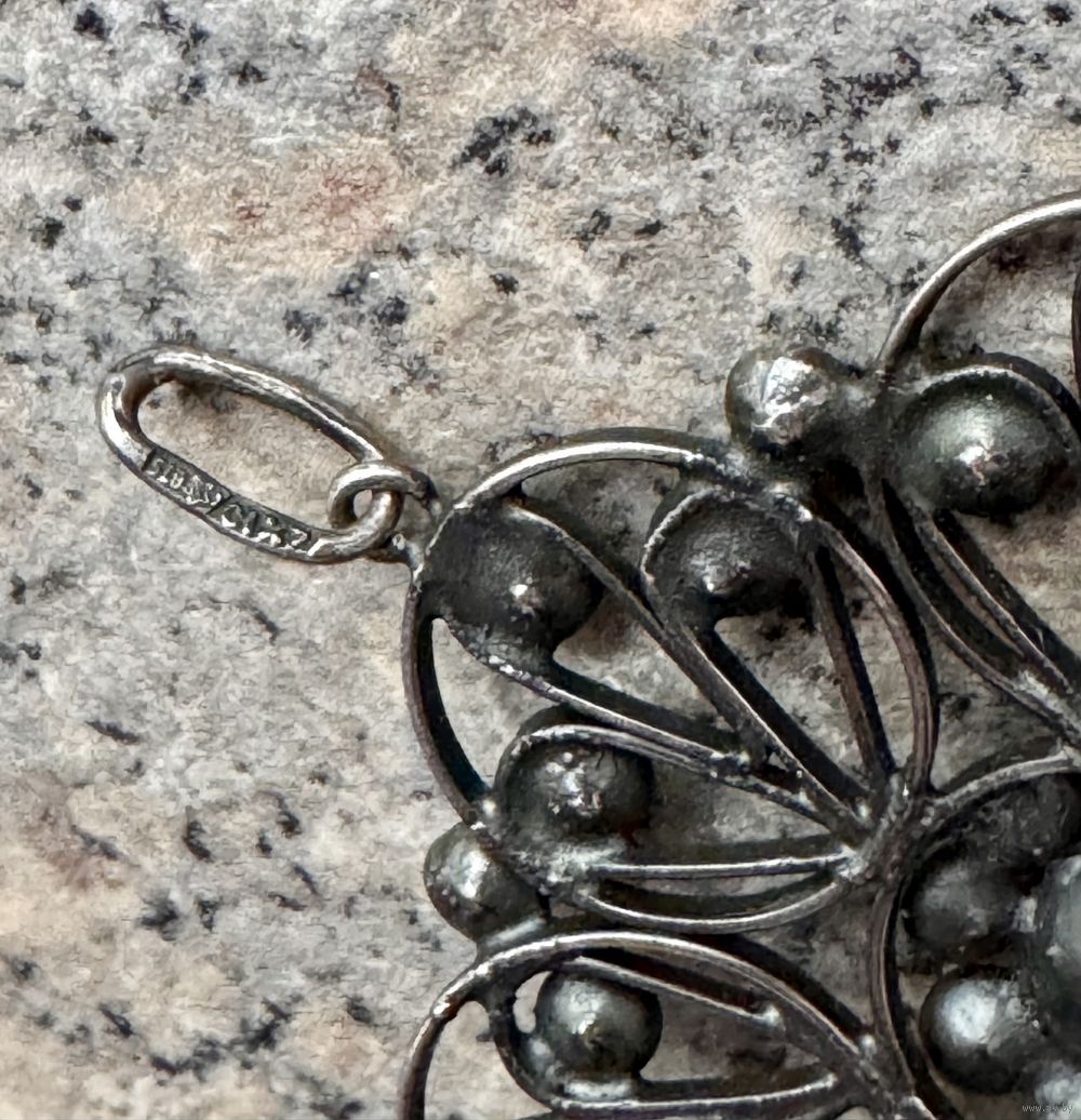 Кулон из серебра 875пр., на лицевой стороне вставки из стекла. Сделан в 1972г. в Харькове (на петле стоит клеймо и именник 2ХЮ). Высота с петлей 5см., диаметр подвески 4,2см. Вес 7гр. Состояние хорошее.
