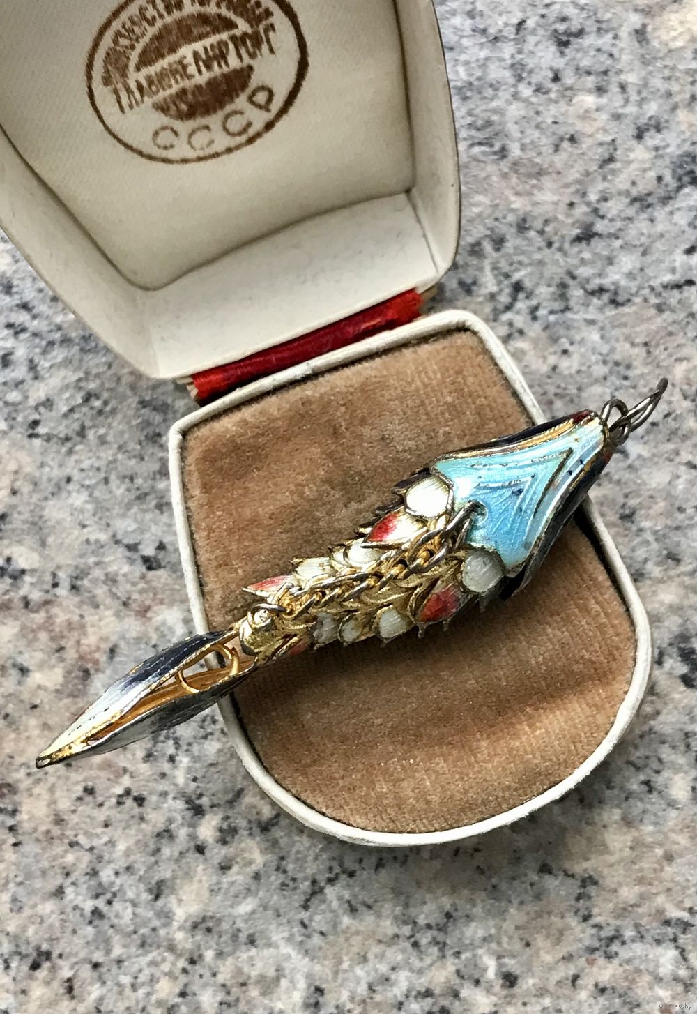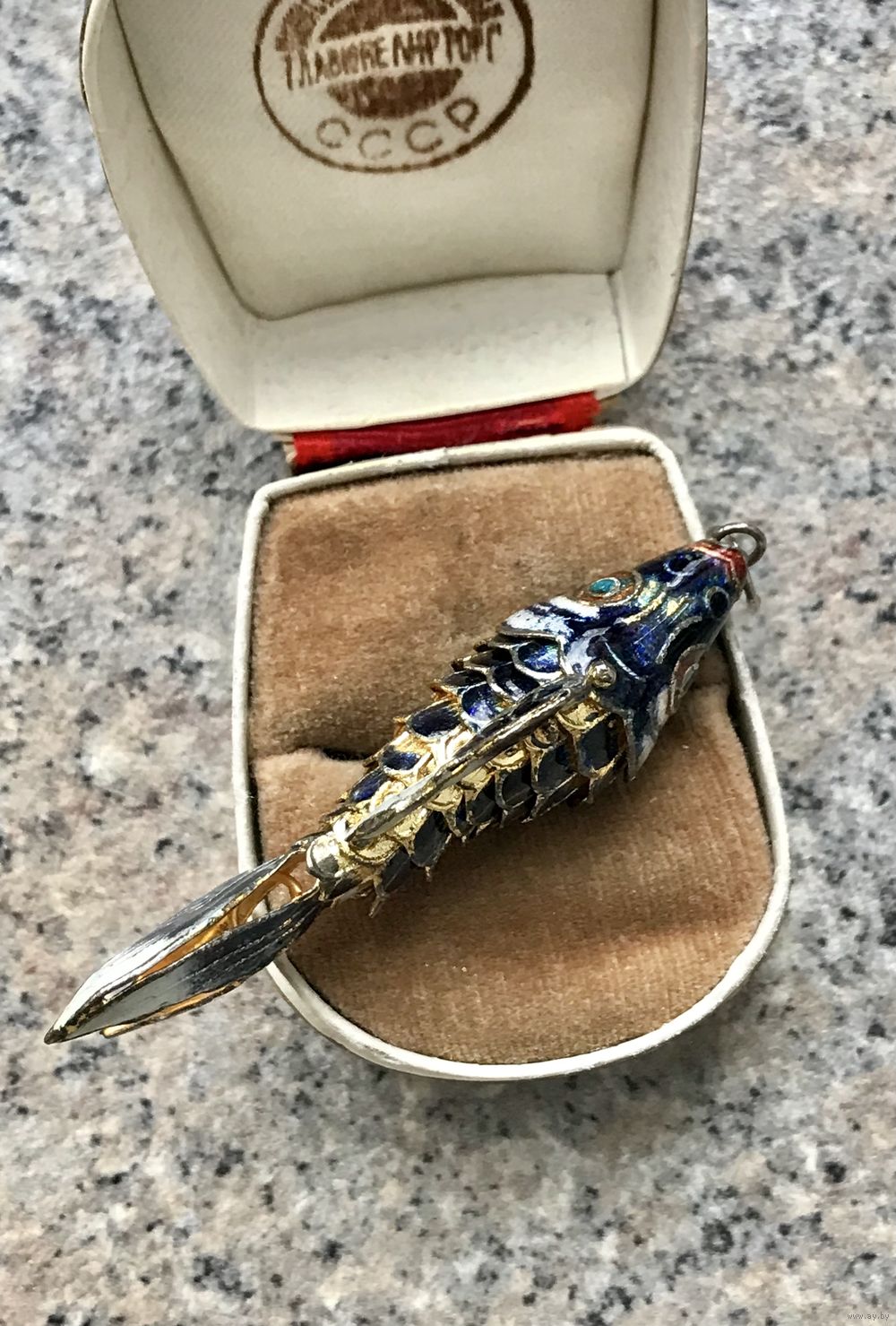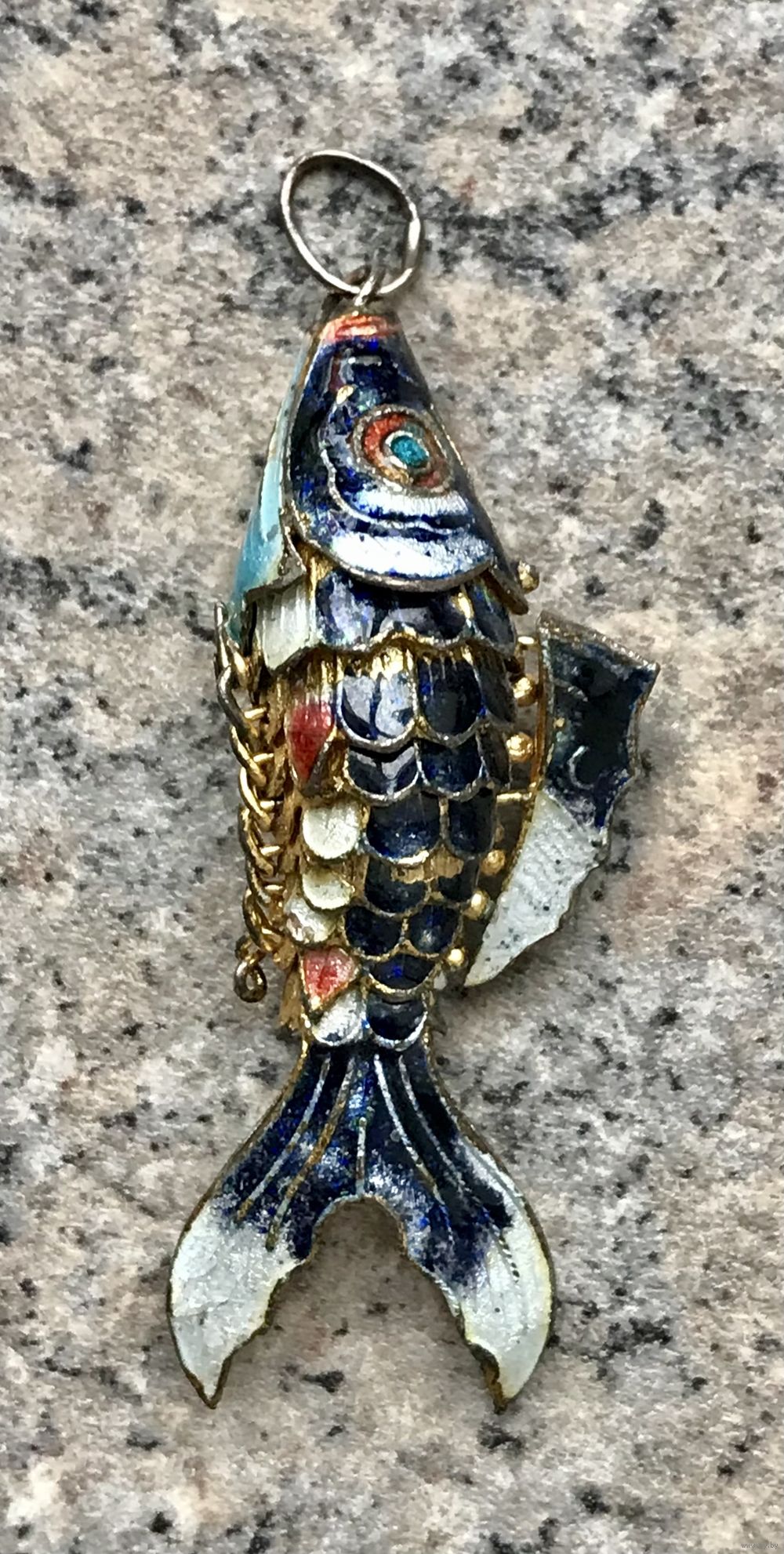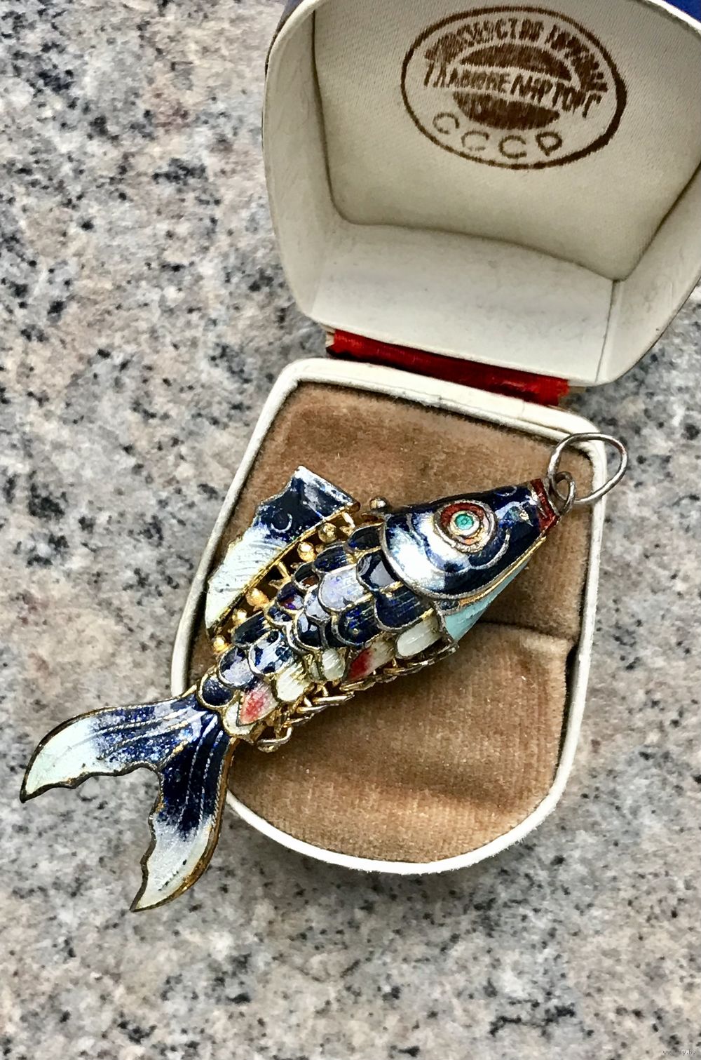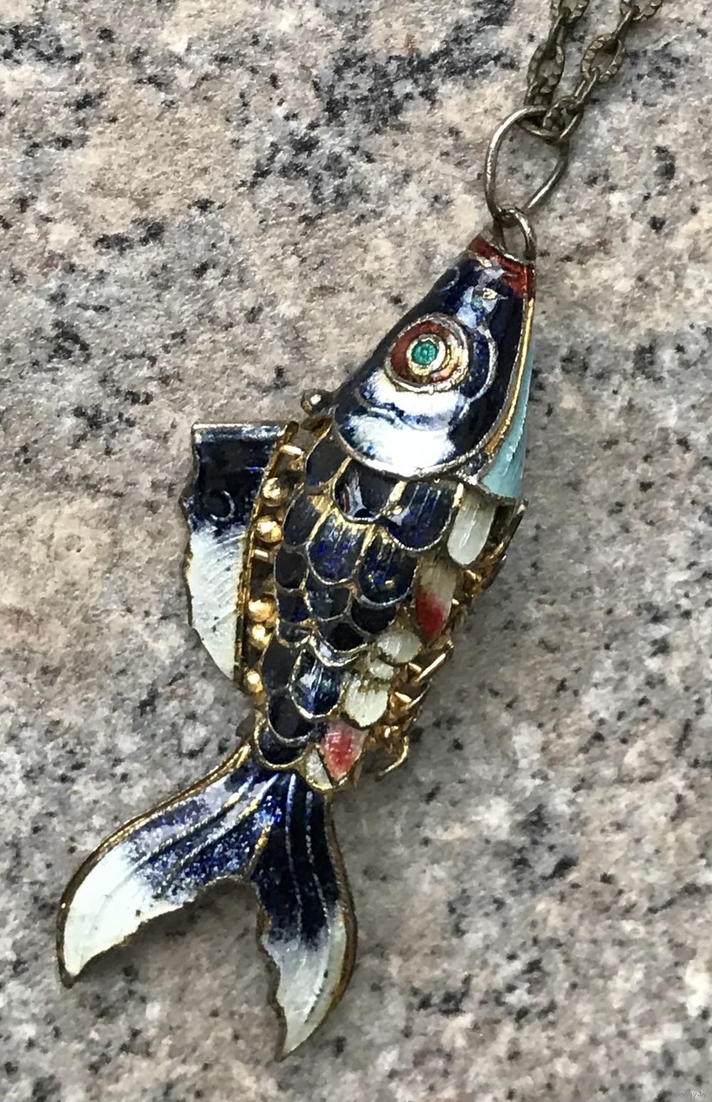 Кулон в виде рыбки с основой из латуни с позолотой, эмаль. Китай, 2-я пол.ХХв. Тело рыбки подвижно. Высота кулона с петлей 7см., размер рыбки 6,2х2см. Состояние хорошее.