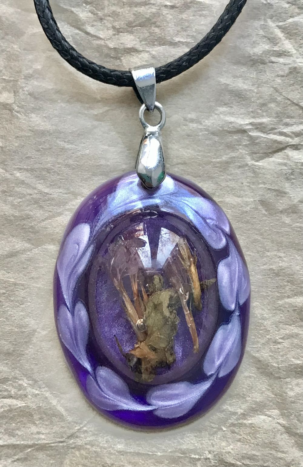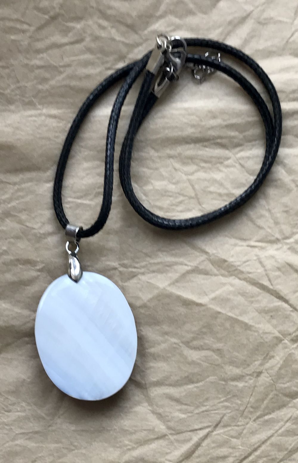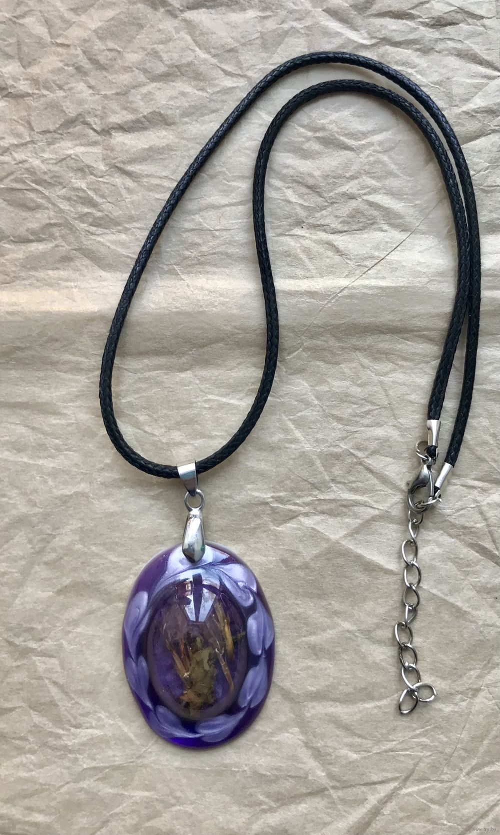 Кулон из плотного пластика на текстильном шнурке. Высота кулона с петлей 5,5см., ширина 3см., длина шнурка 44см.+5см. доп. цепочка. Состояние хорошее.