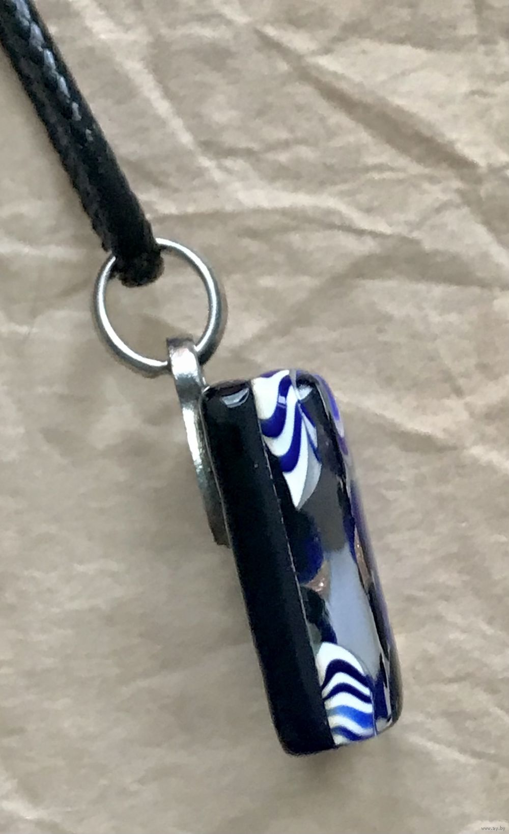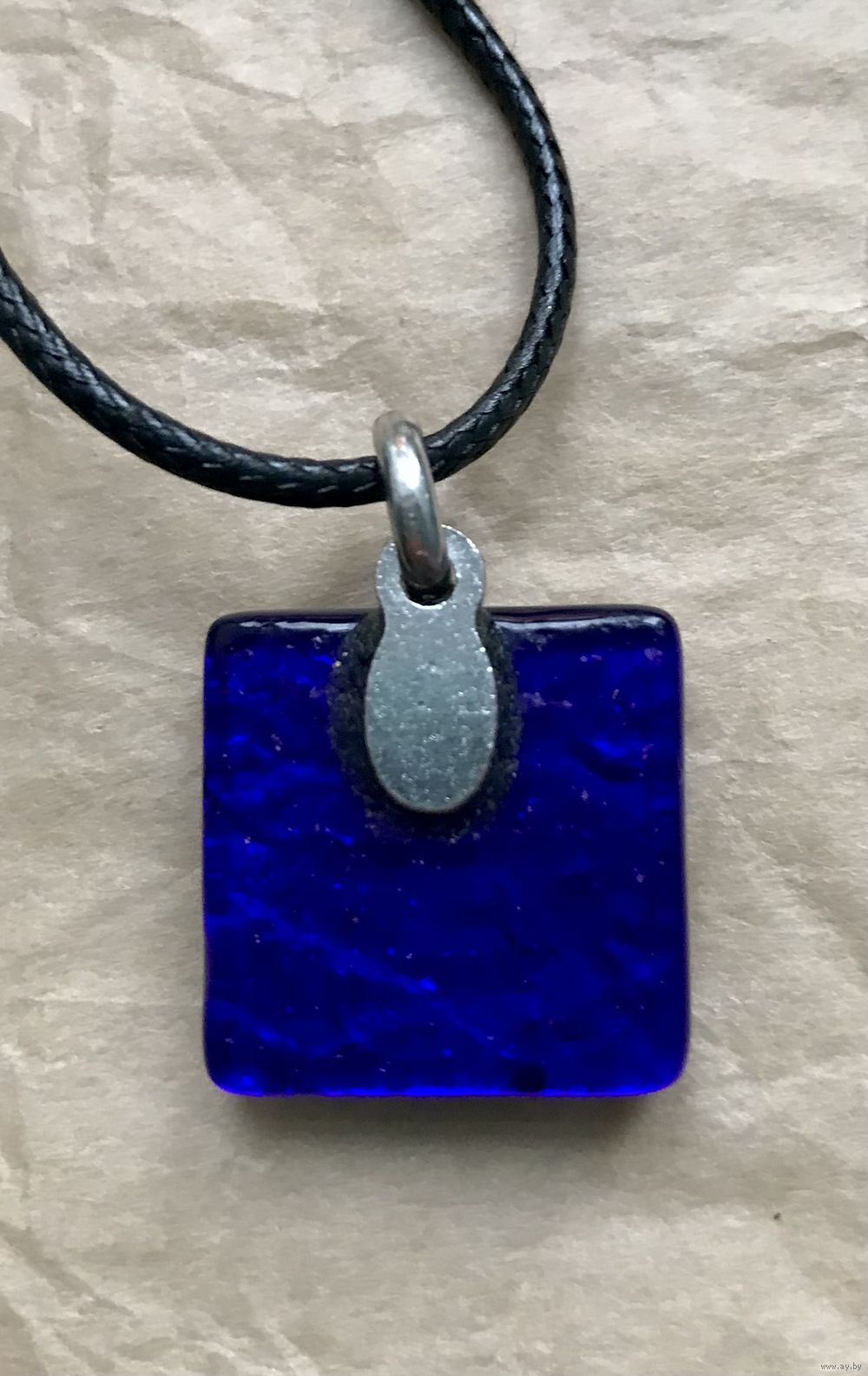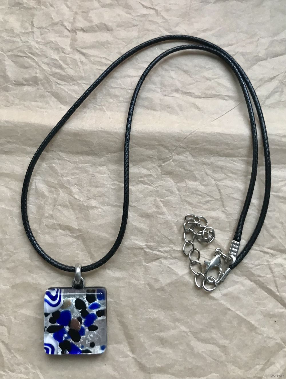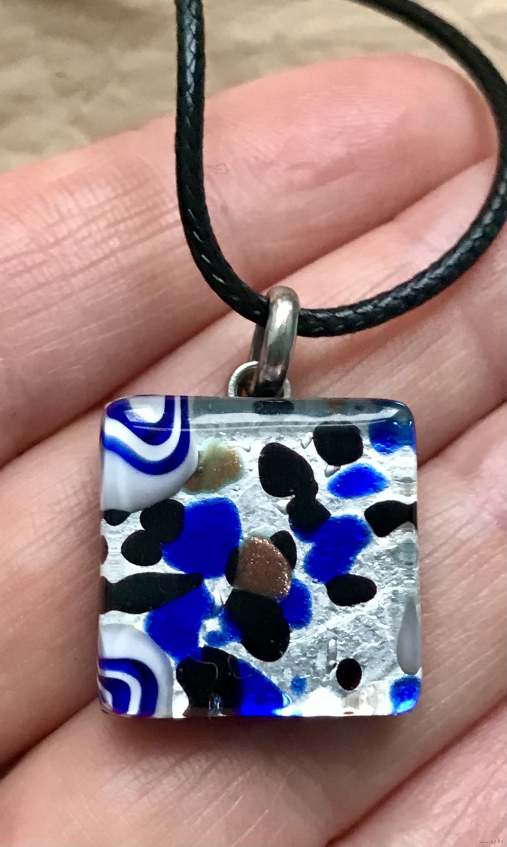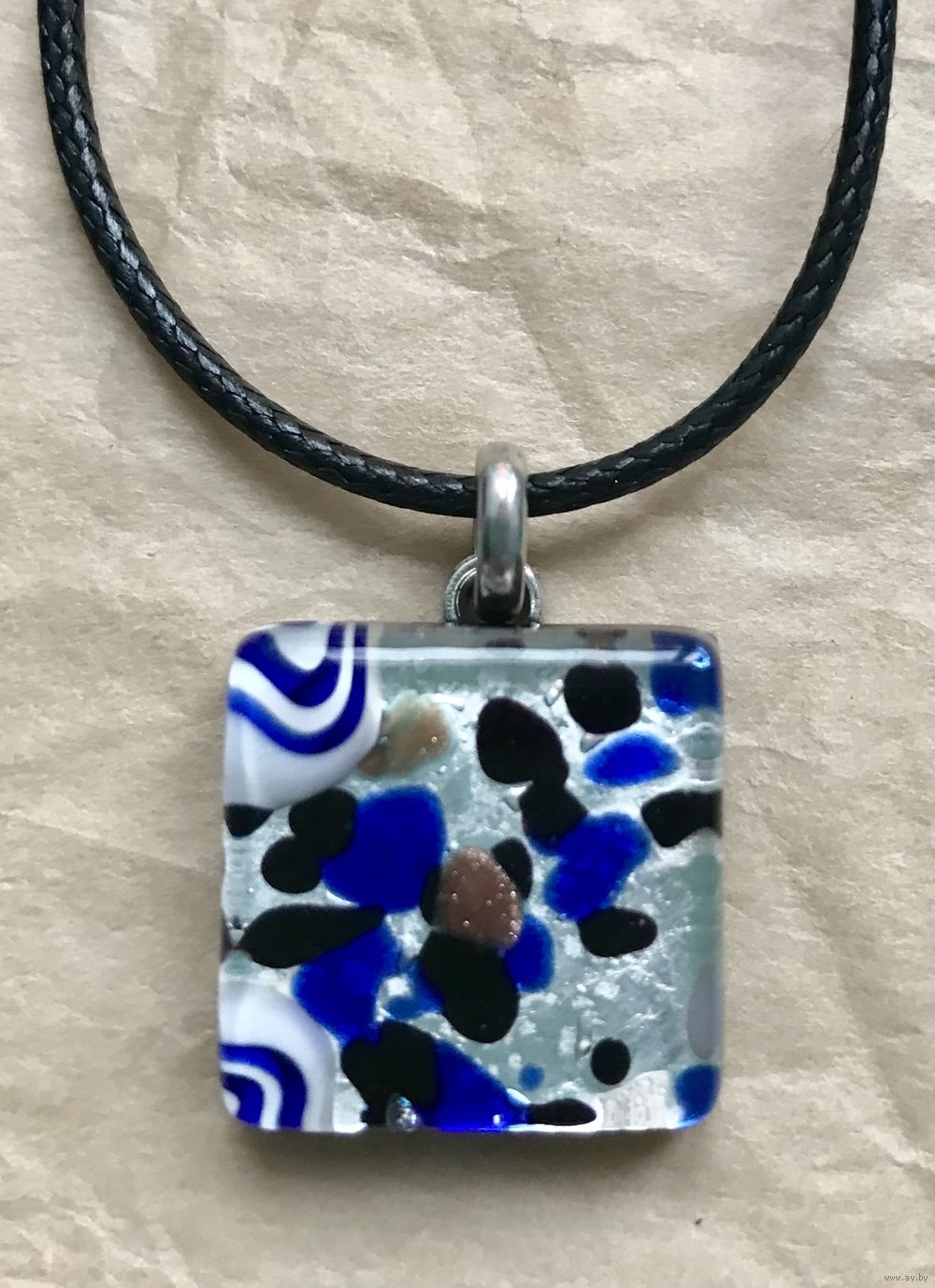 Небольшой кулон из муранского стекла. Высота с петлей 2,7см., размер кулона 2х2см., длина шнура 45см.+5см. доп.цепочка. Состояние хорошее.