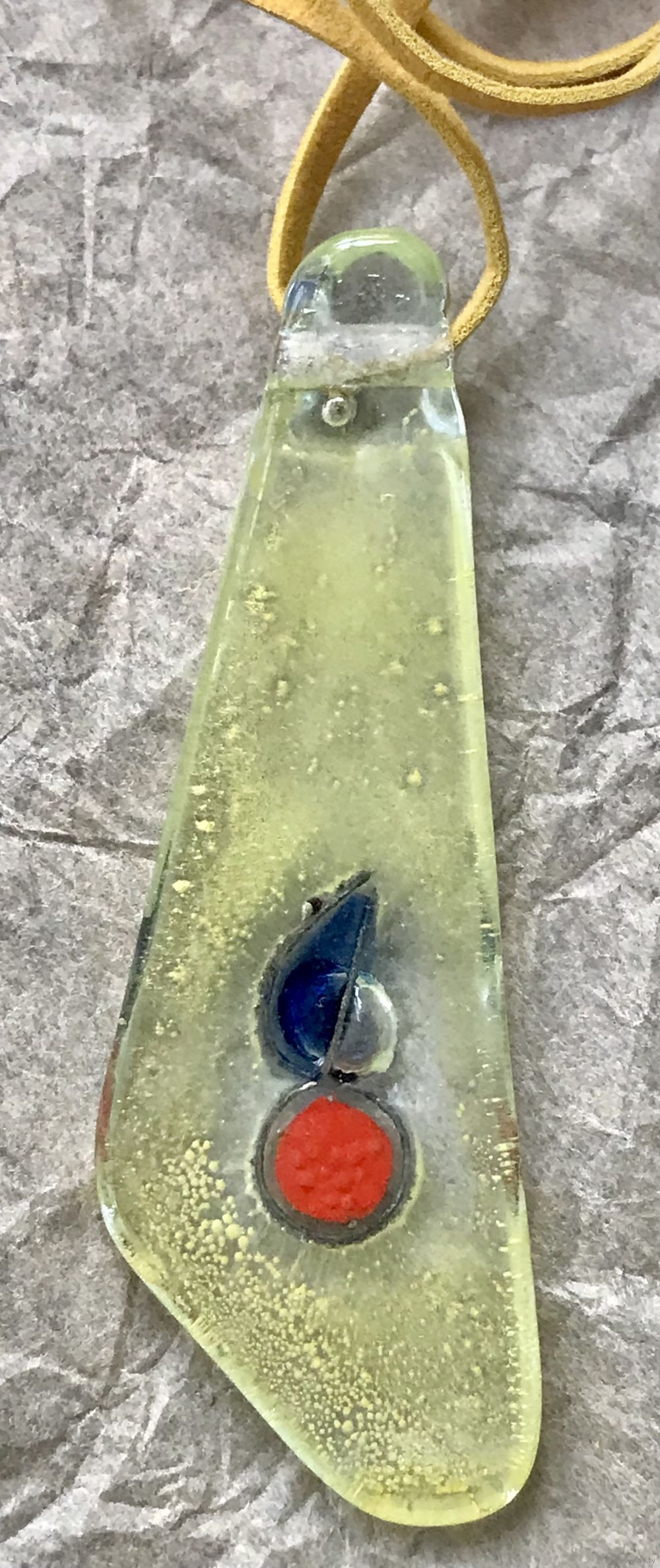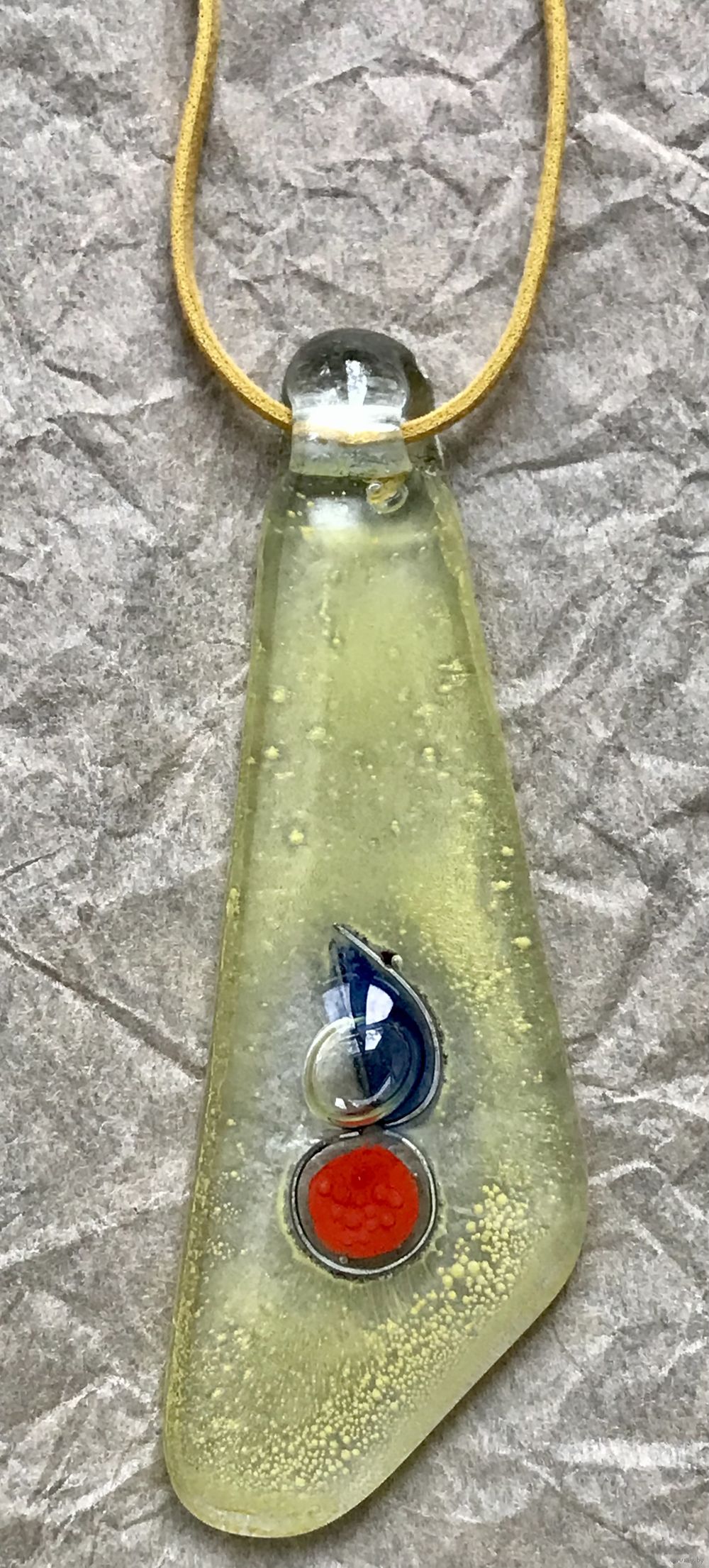 Крупный кулон из художественного стекла. Высота 8,5см., длина шнура 90см. Состояние хорошее.