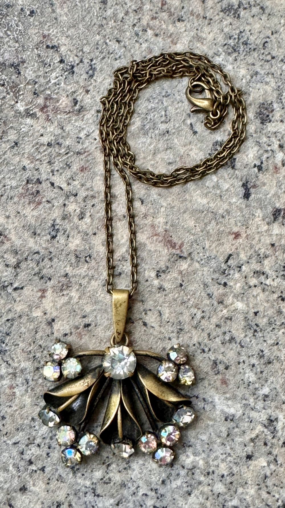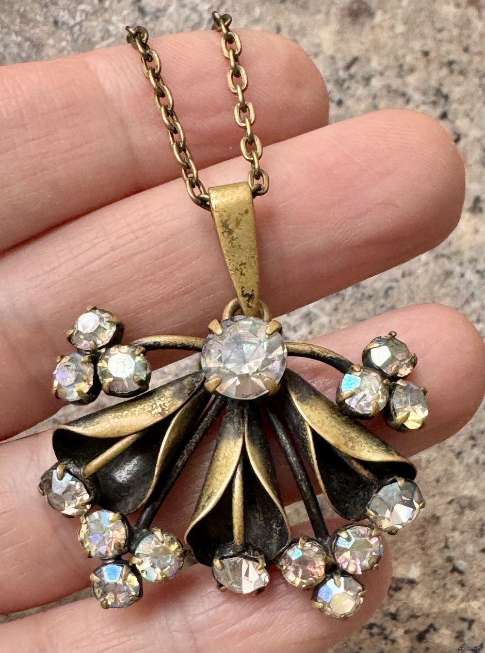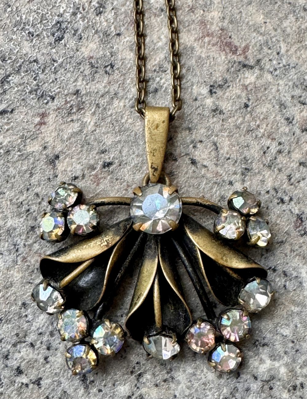 Винтажный кулон из латуни со вставками из стекла с покрытием AB. Высота с петлей 4,5см., ширина 4см. Длина цепочки 45 см. Состояние хорошее.