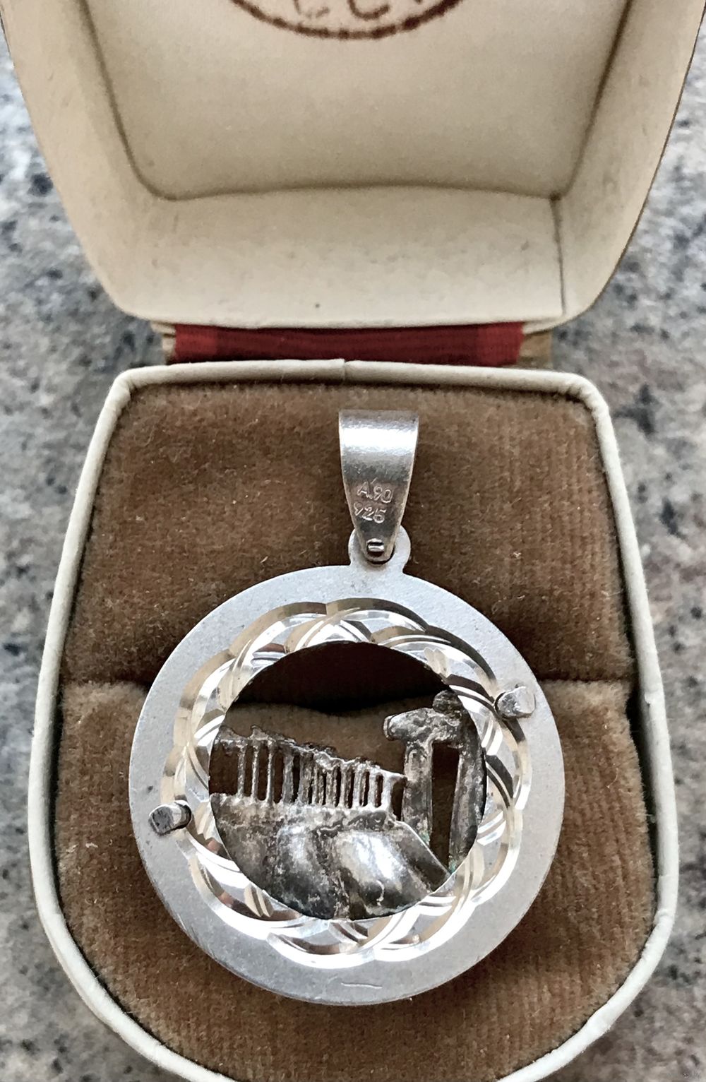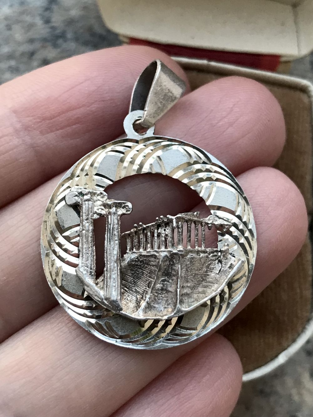 Кулон из серебра 925 пробы. Высота с петлей 3,5см., диаметр подвески 2,6см. Вес 4гр. Состояние хорошее.