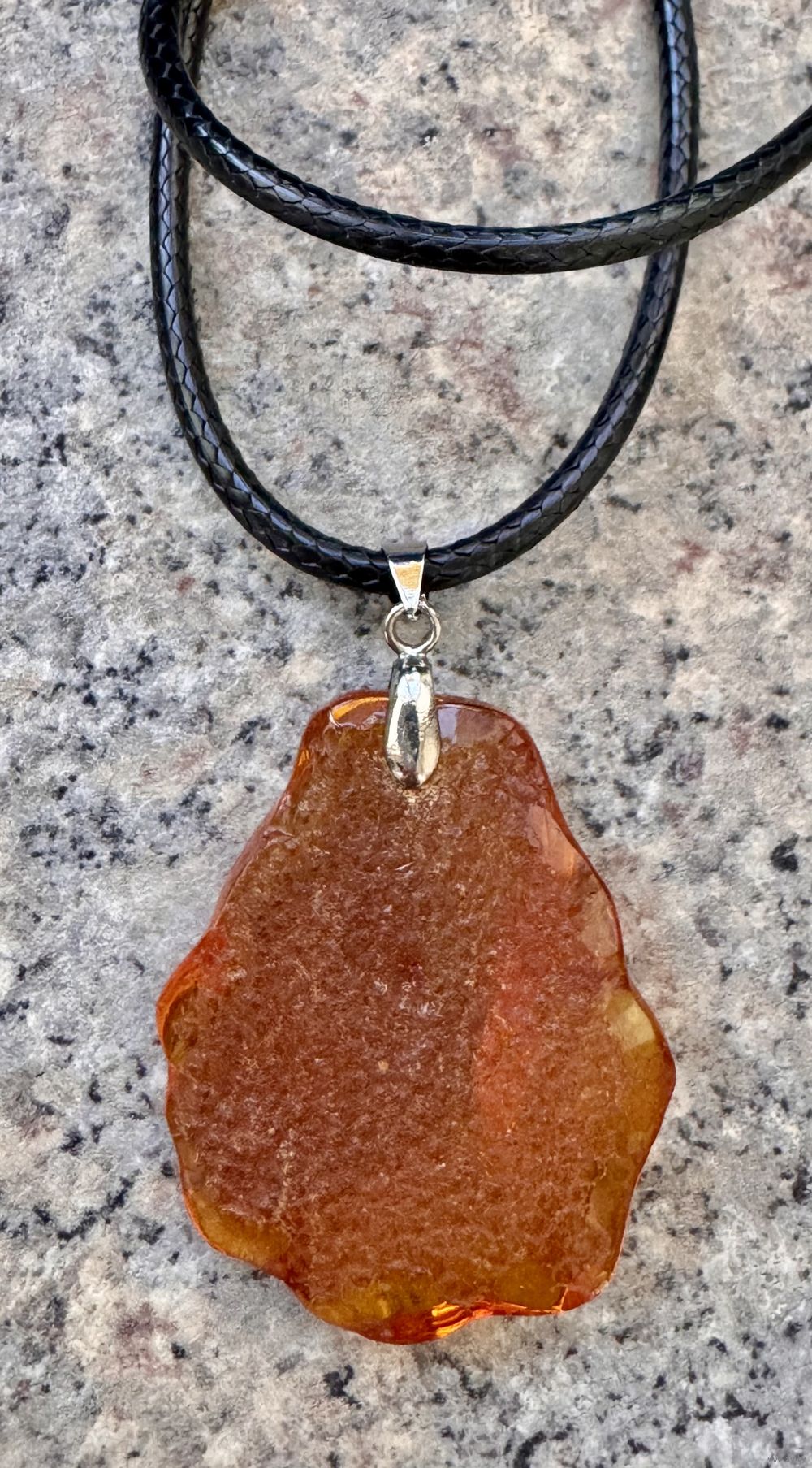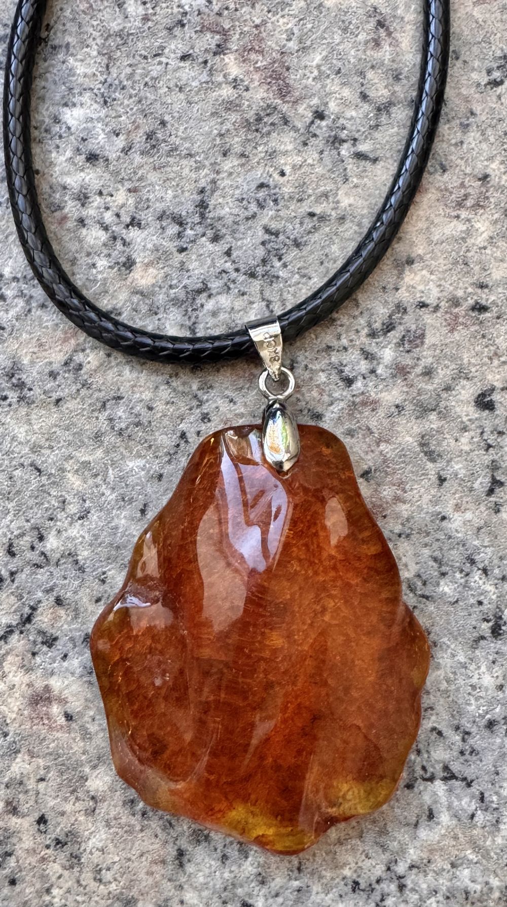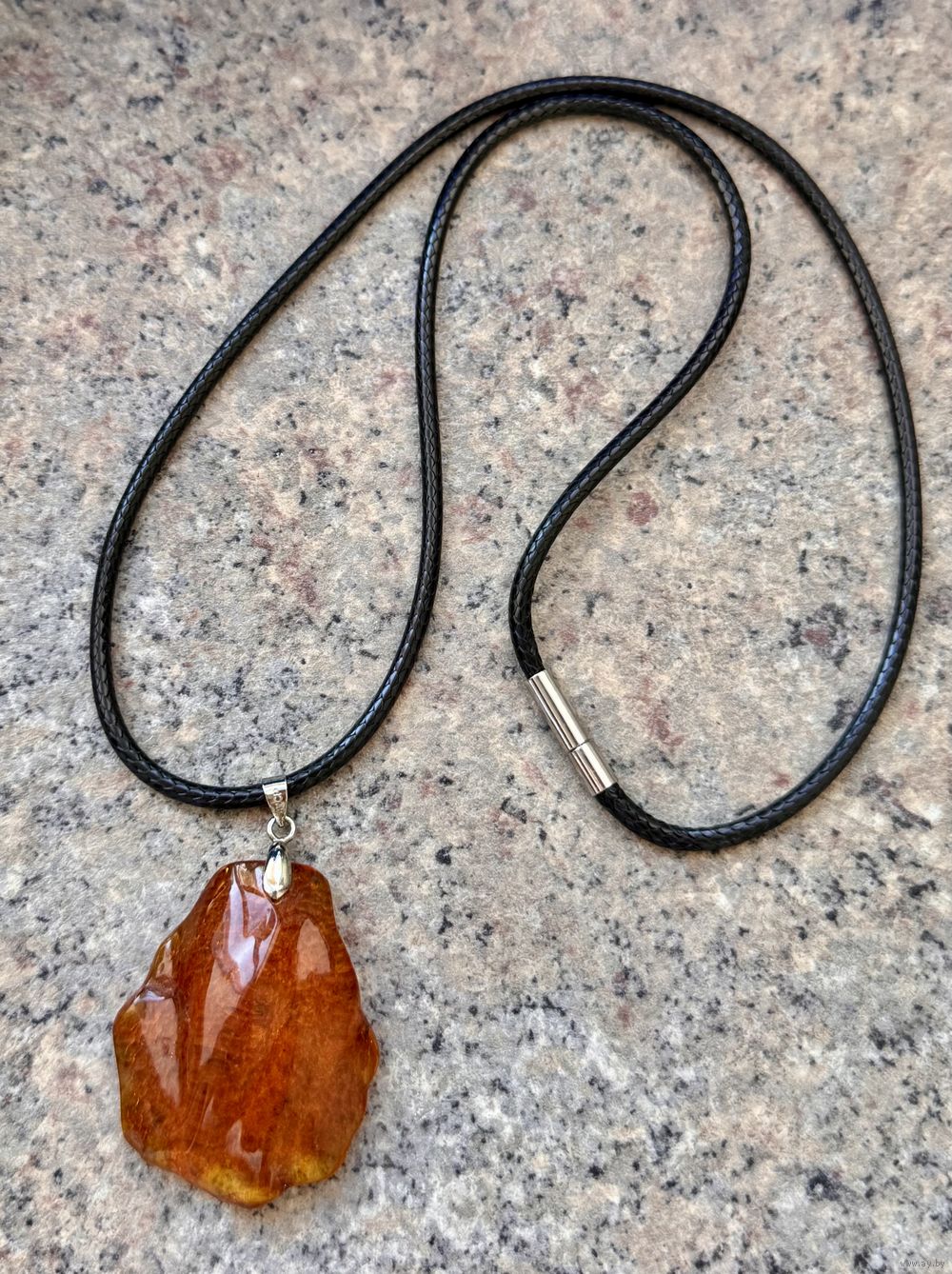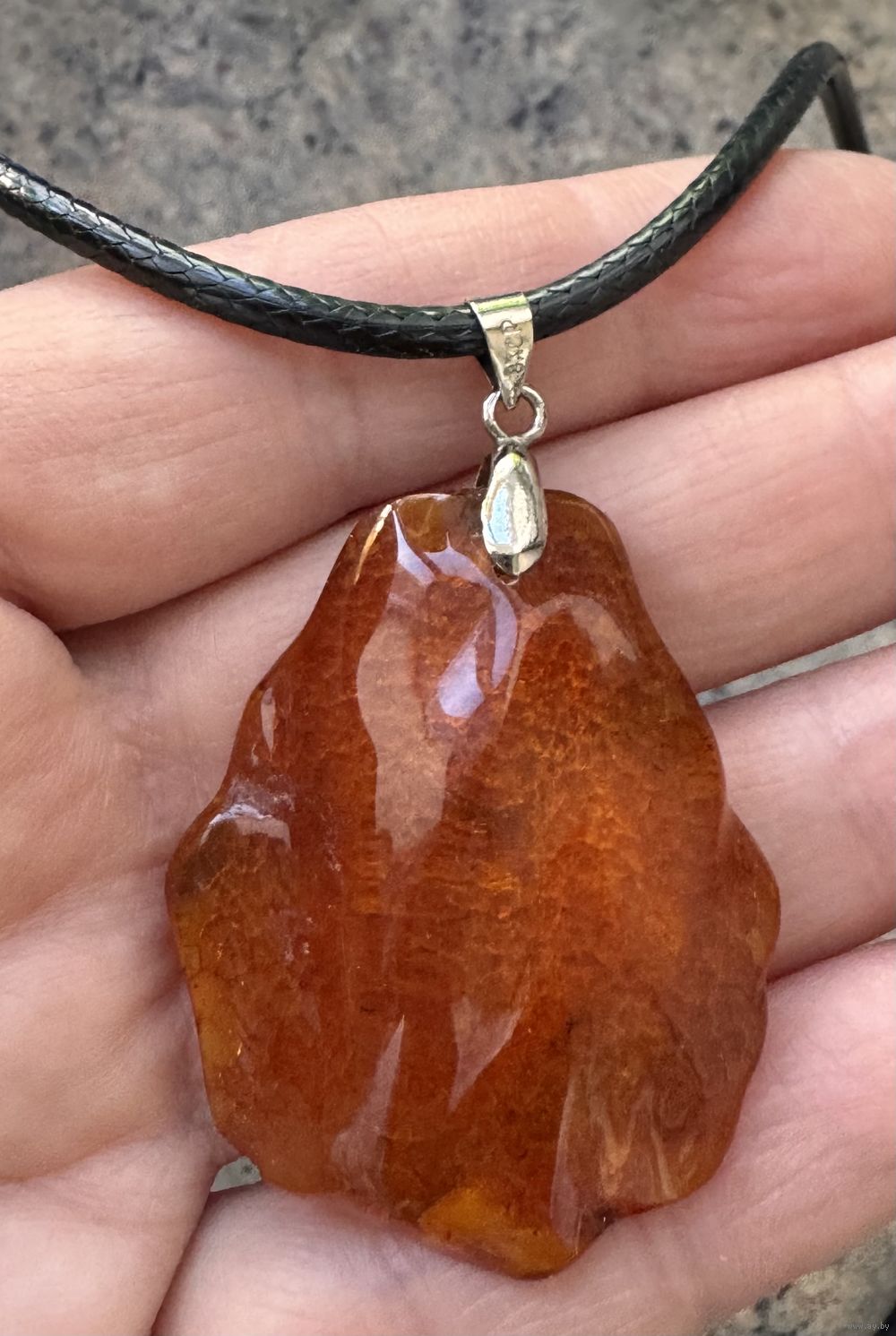 Кулон из янтаря, петелька из металла с серебрением. Высота кулона с петлей 5см., размер янтаря 4х3,4см. Длина шнурка 53см. Состояние хорошее.