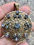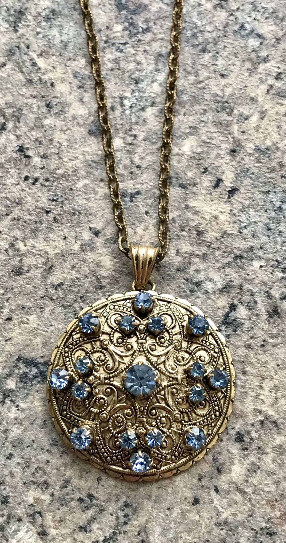 Винтажный чешский кулон из латуни, лицевая сторона украшена кристаллами голубого цвета. Высота кулона с петлей 5см., диаметр 4см. Состояние хорошее.