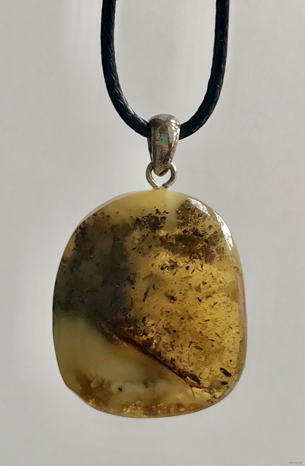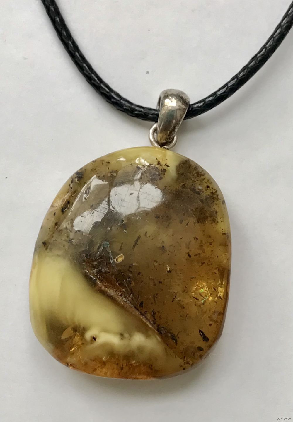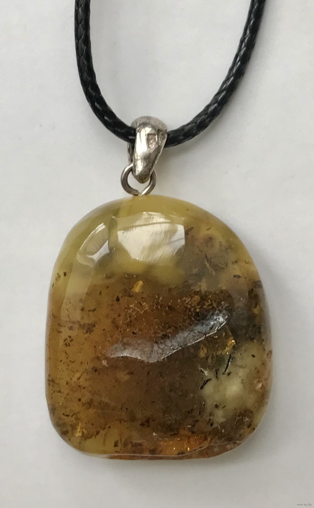 Кулон из янтаря, петелька сделана из серебра 925пр. Высота кулона с петлей 3,8см., размер янтаря 2,9х2,5см. На янтаре имеются неровности естественного происхождения.
