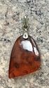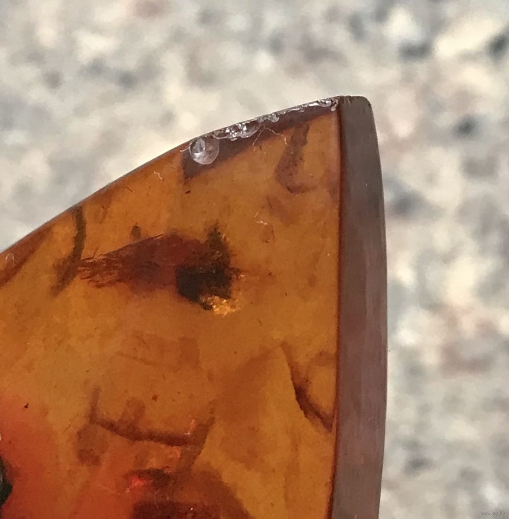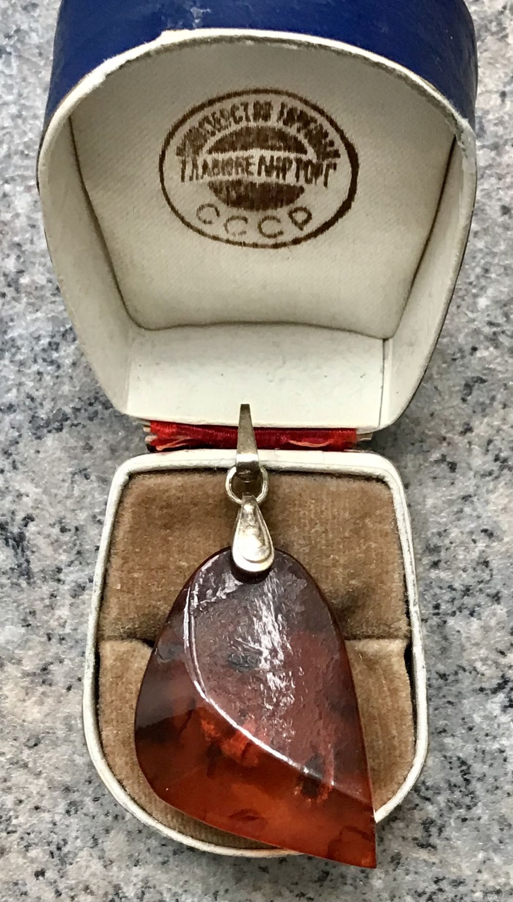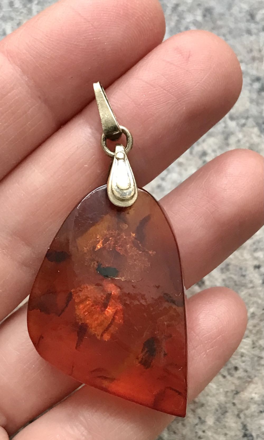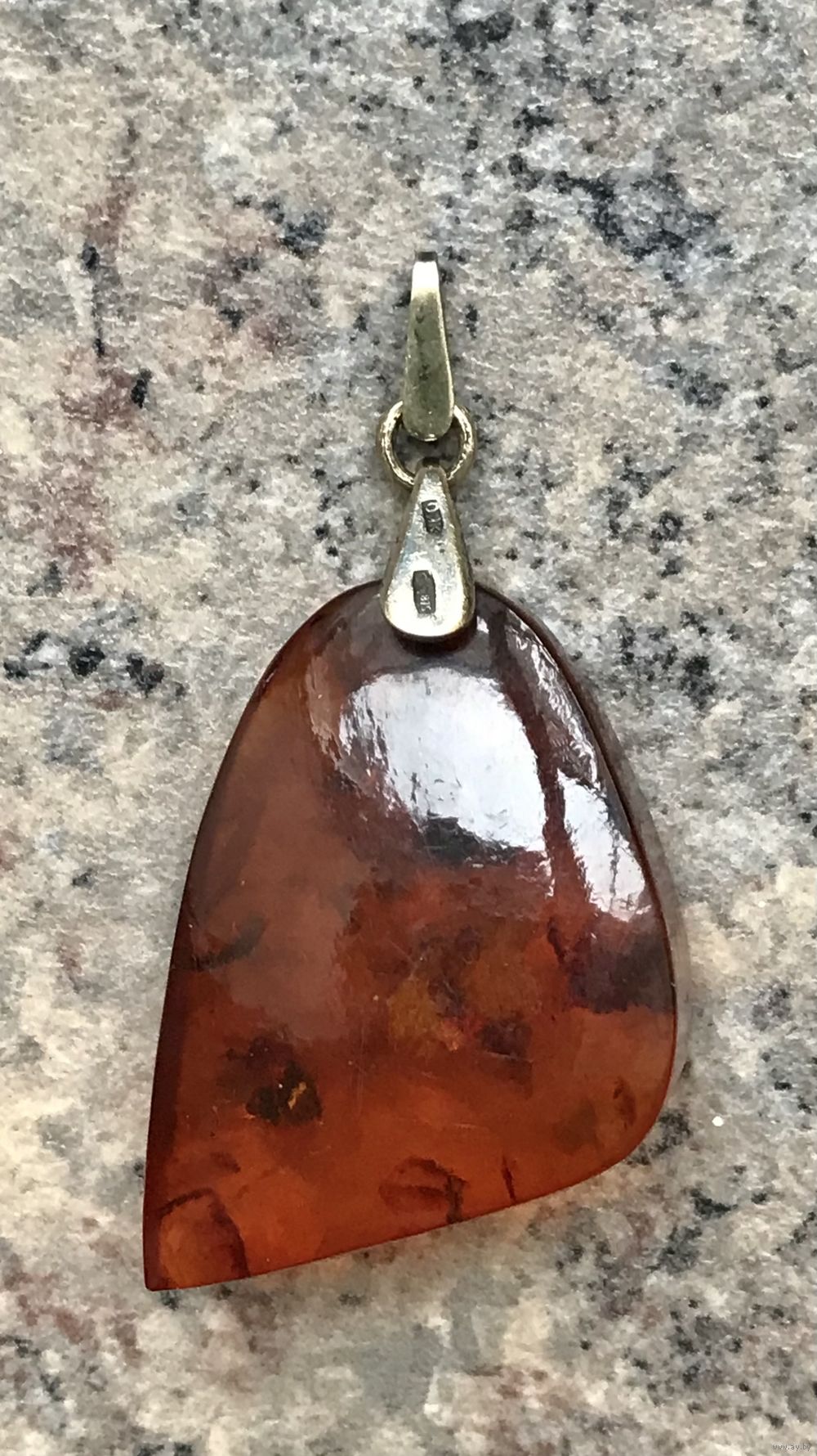 Крупный кулон из янтаря. Петля из серебра 875пр. с позолотой. Сделан в 1970г. в Калининграде (на петле стоит именник 0ЯК). Высота кулона с петлей 5,7см., размер янтаря 4х3см., толщина 1см. С лицевой стороны на одной грани есть несколько небольших скольчиков. Вес 9,12гр.