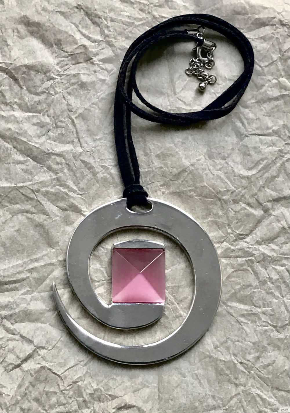 Крупный кулон из стали, на лицевой стороне вставка розового цвета из стекла в форме пирамиды. Диаметр кулона 6,5см., размер вставки 2х2см., длина шнурка 48см.+5см.доп.цепочка. Состояние хорошее.