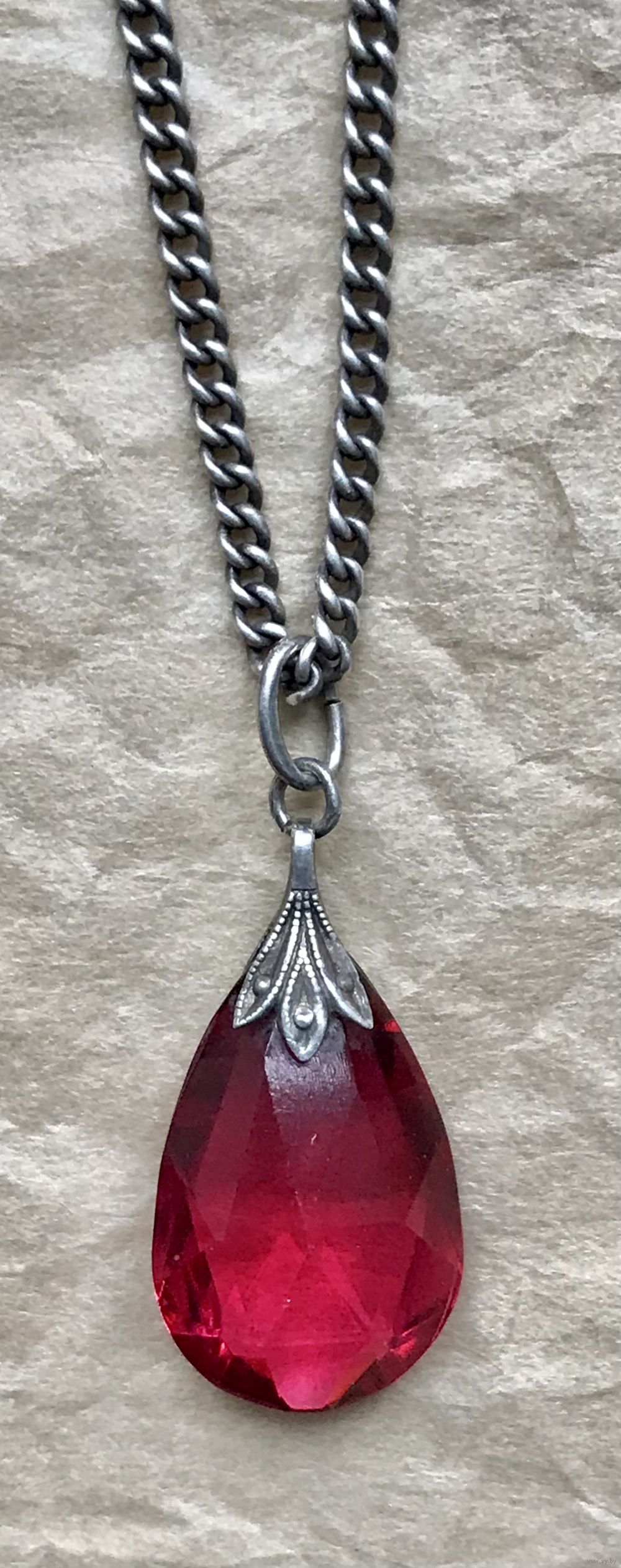 Винтажный кулон, привезён из Европы. Серебро и кристалл малинового цвета. На колечке стоит отметка, атрибутировать не удалось, металл проверен в юв. мастерской. Высота кулона с петлей 2,8см., размер вставки 1,8х1,2см. Состояние хорошее.