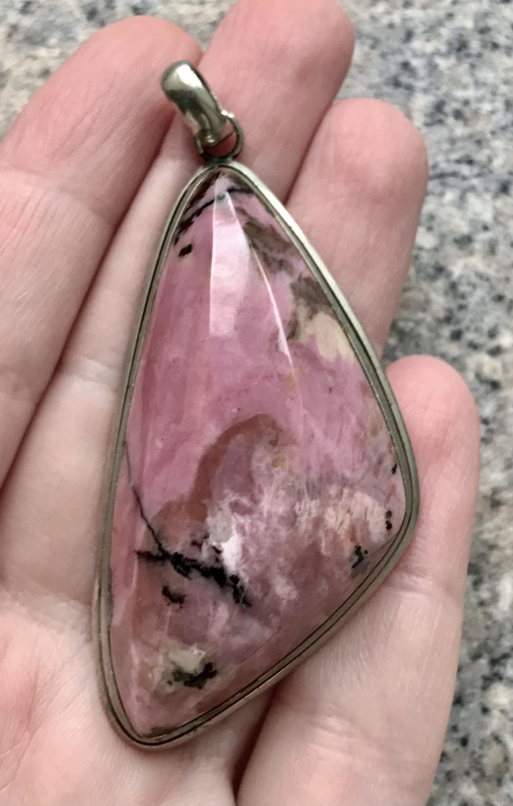 Крупный кулон с основой из мельхиора и вставкой из родонита. Высота кулона с петлей 6,5см., размер вставки 5,5х3х1,5см. Состояние хорошее.