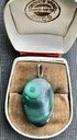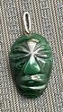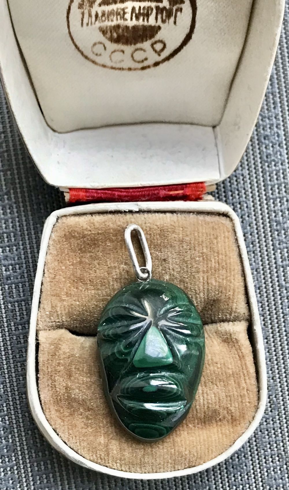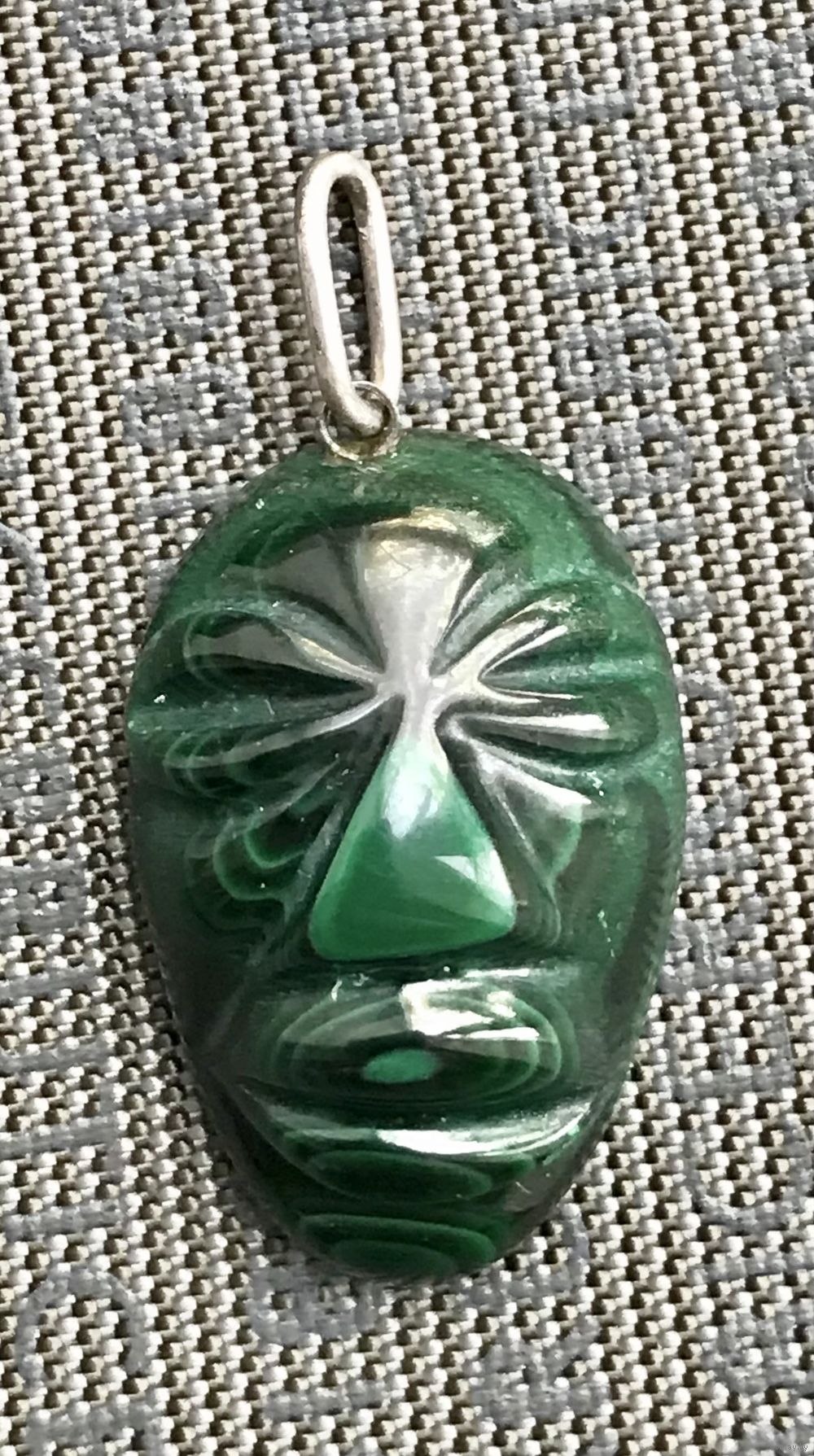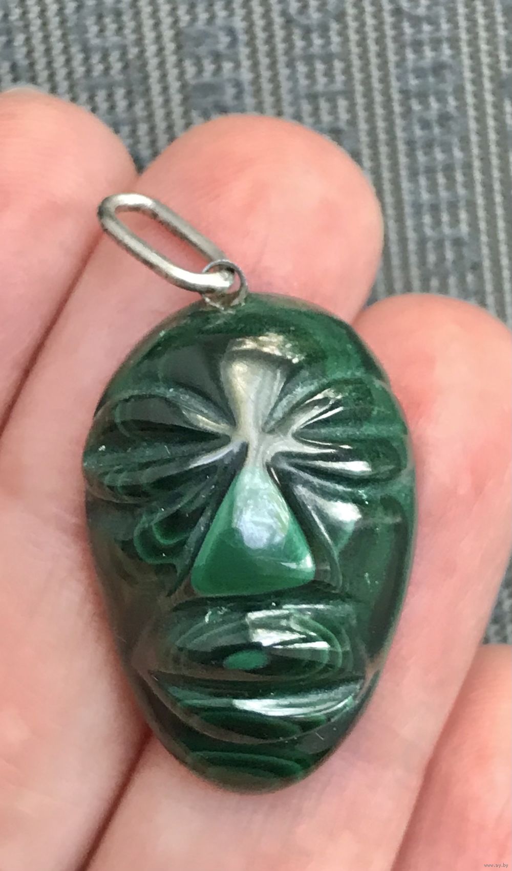 Небольшой кулон из малахита в форме африканской маски. Бейл из металла серебристого тона. Высота с бейлом 3,6см., размер подвески 2,7х1,7см. С обратной стороны есть два небольших скола (учтено а цене).