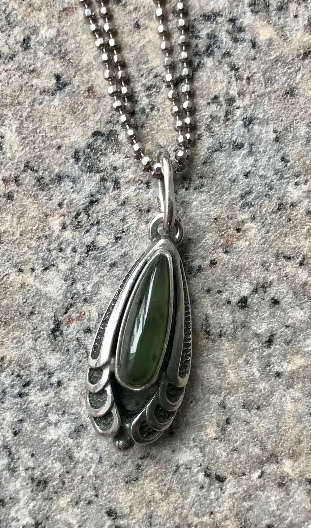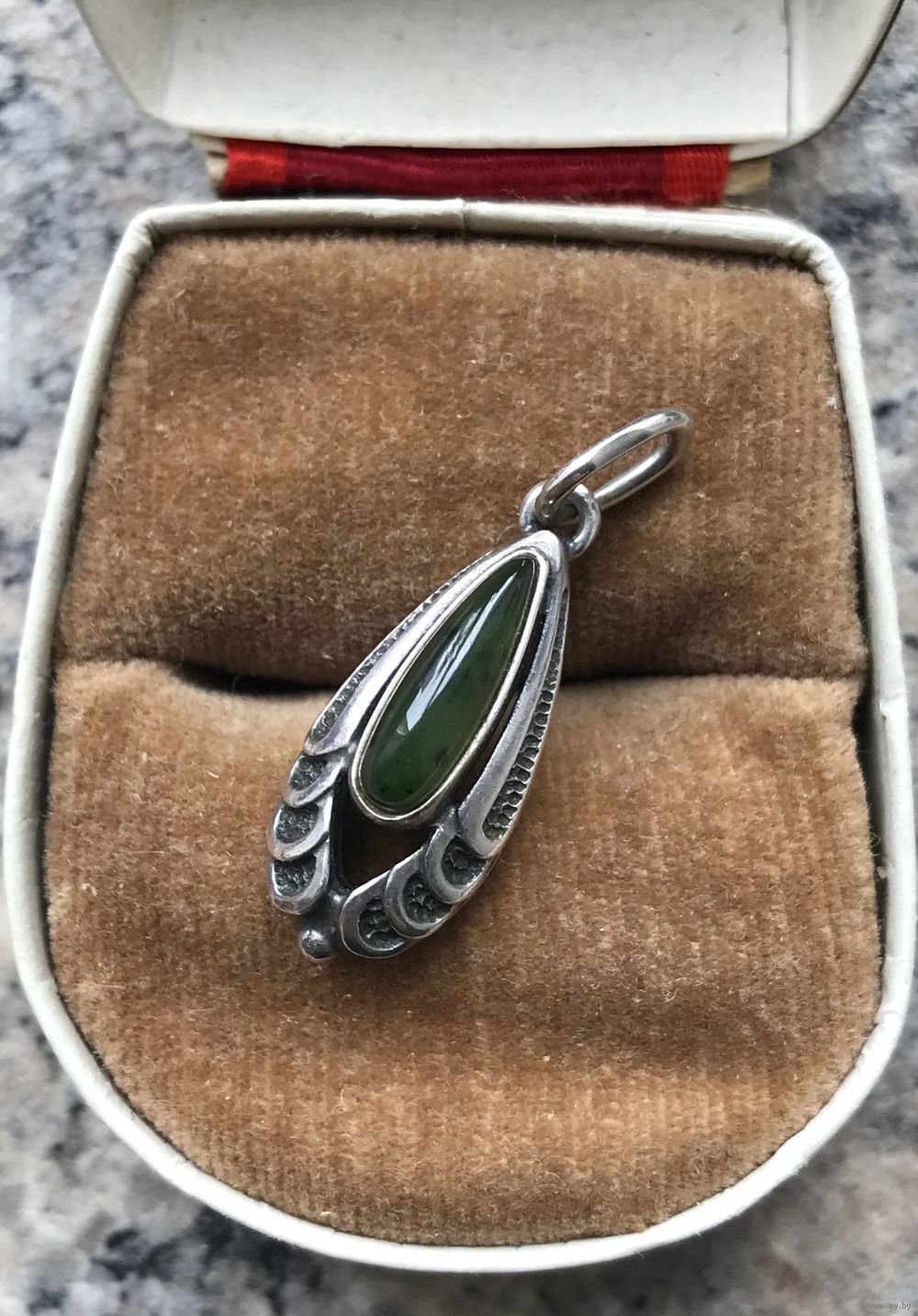 Кулон из серебра 875пр. со вставкой из нефрита, Свердловск (именник .9СЮ). Высота с петлей 3см. Состояние хорошее.