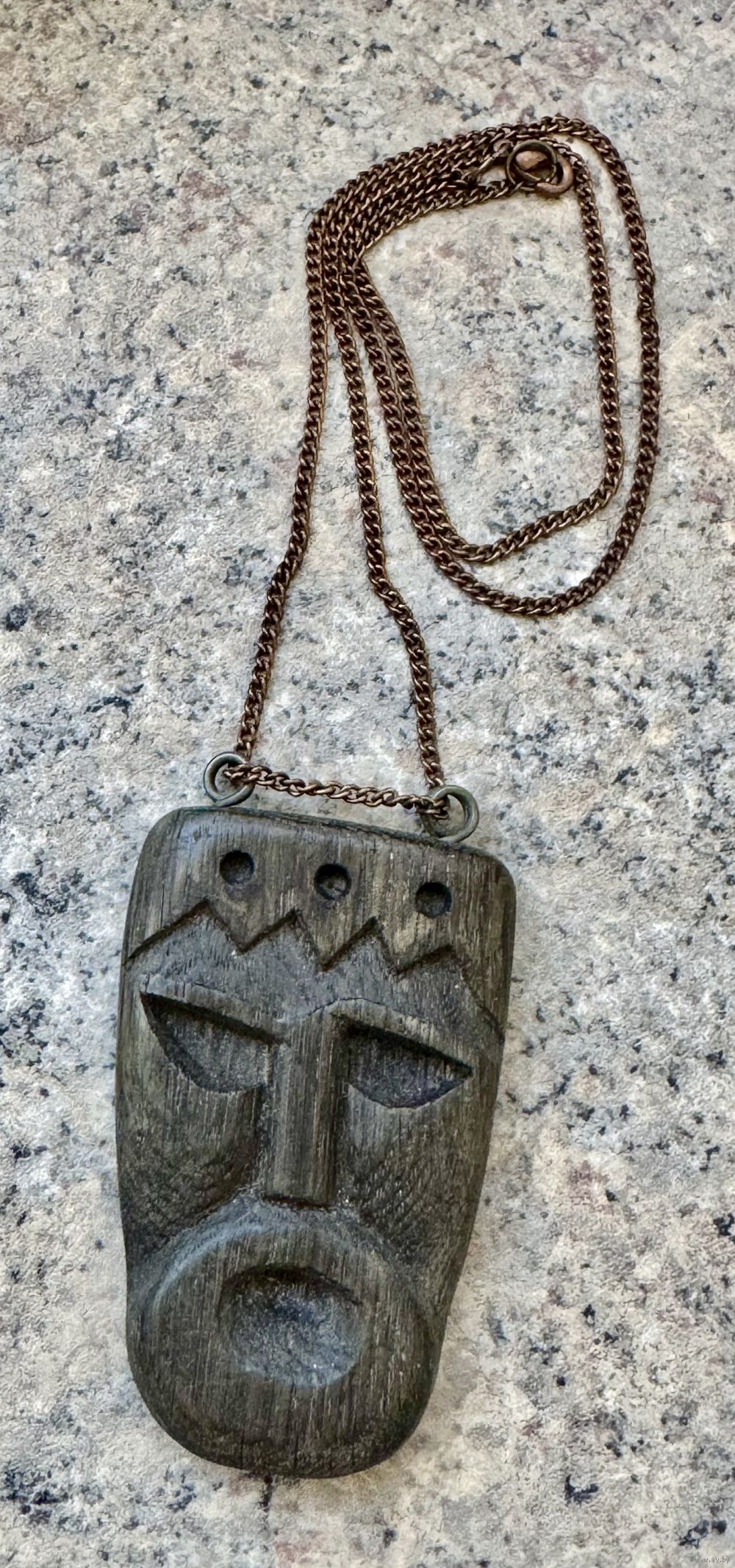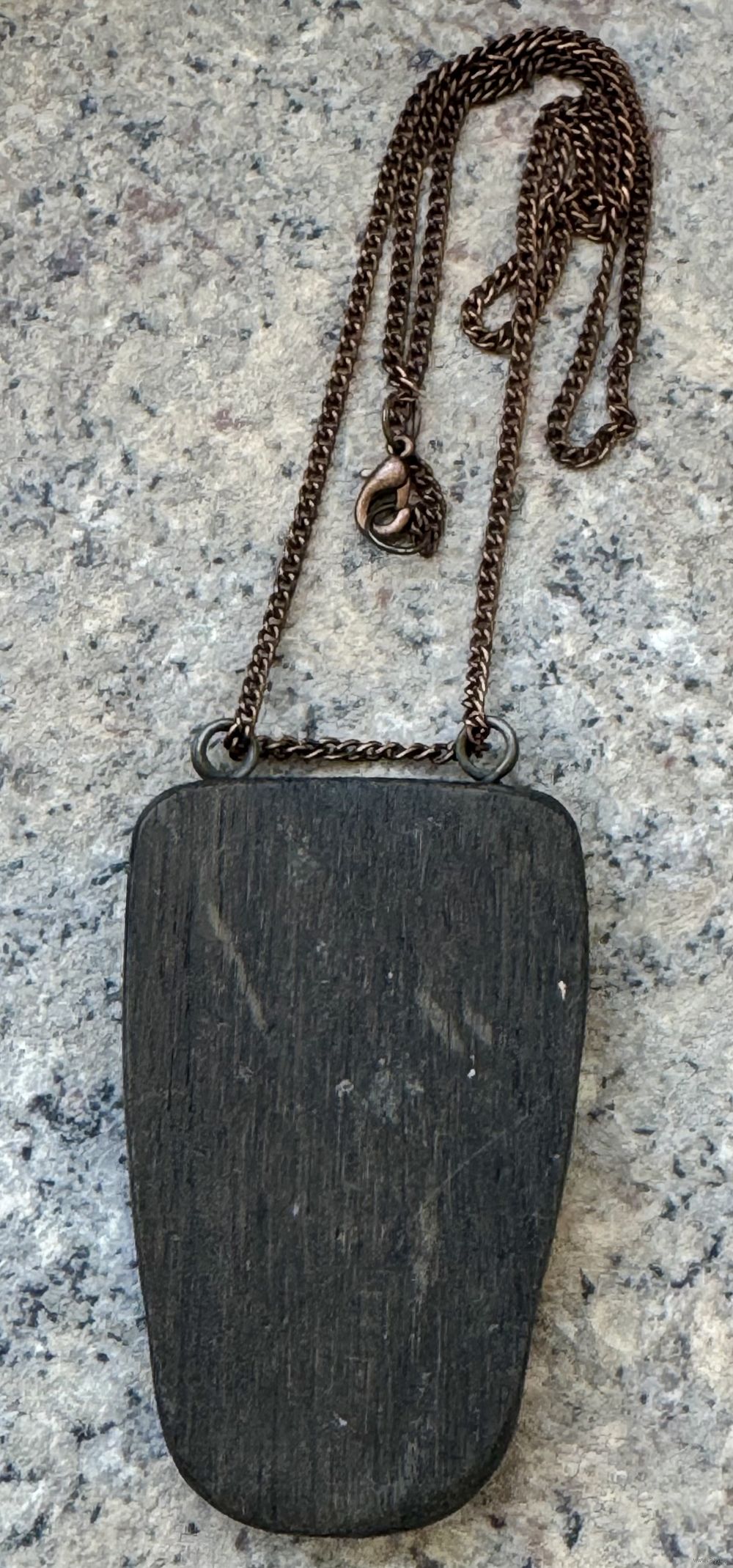 Крупный кулон из дерева на медной цепочке. Ручная резьба. Высота кулона 6,5см., длина цепочки 46см. Состояние хорошее.