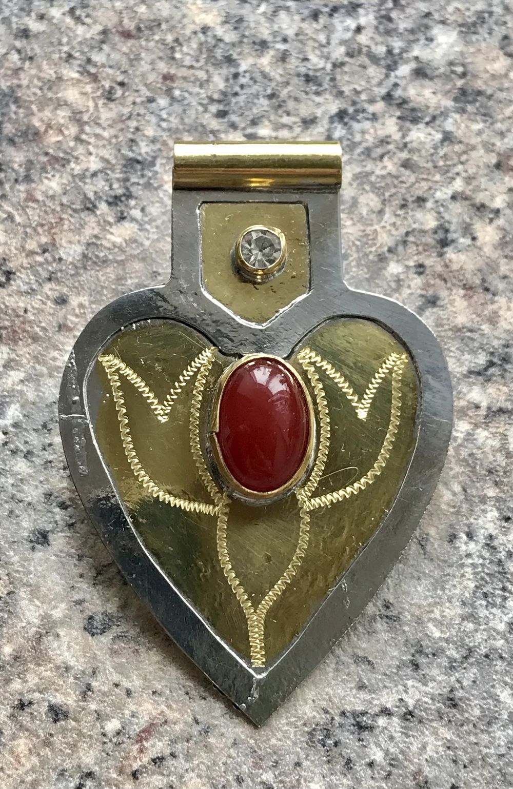 Туркменская подвеска асык из металла со вставкой из плотного пластика под сердолик и кристалла. Можно носить как брошь. Размер 6х4см. Есть небольшие потёртости на металле.