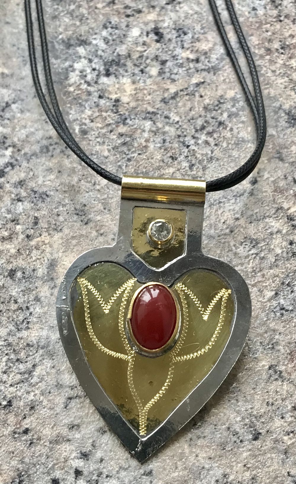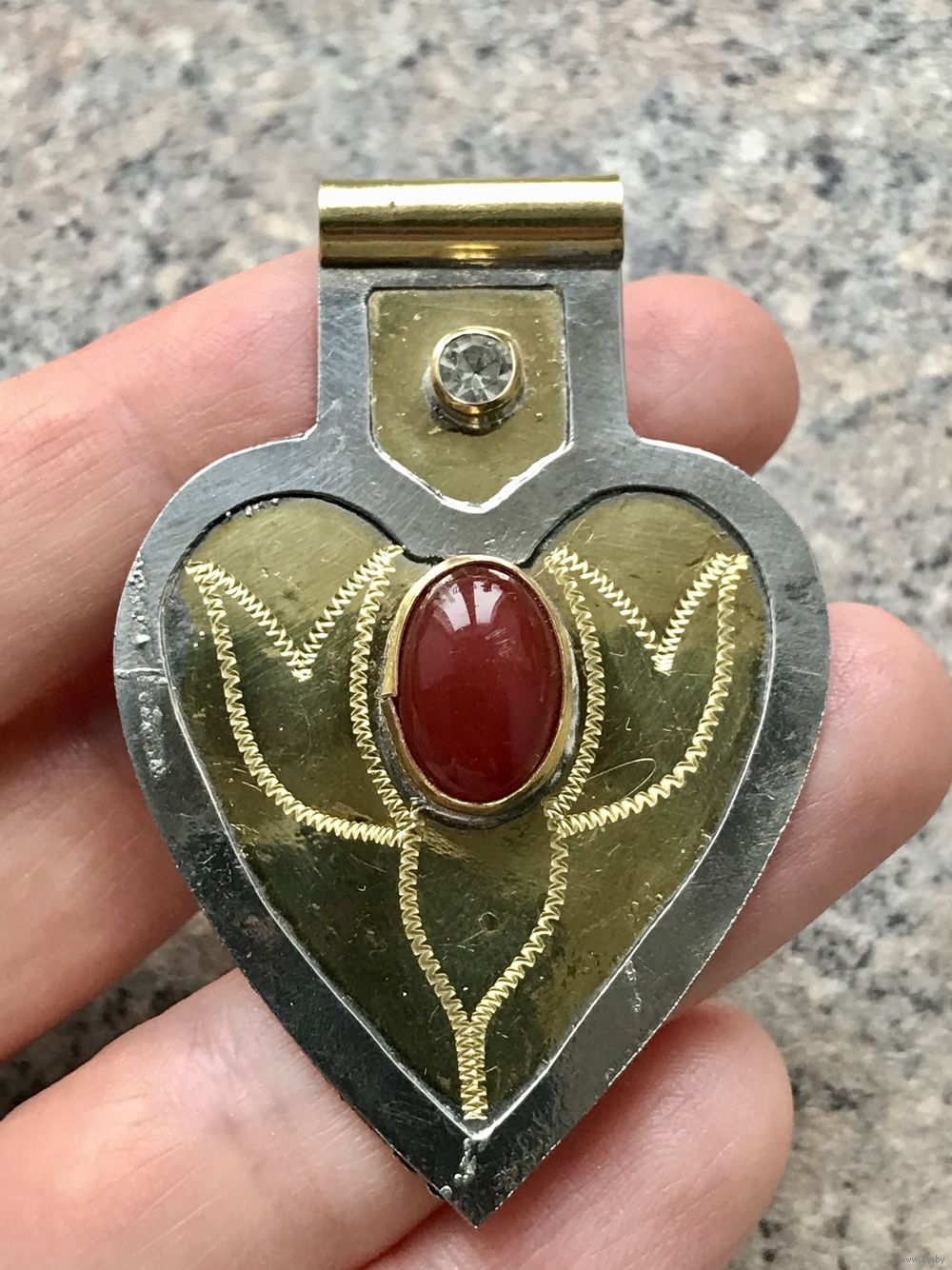 Туркменская подвеска асык из металла со вставкой из плотного пластика под сердолик и кристалла. Можно носить как брошь. Размер 6х4см. Есть небольшие потёртости на металле.