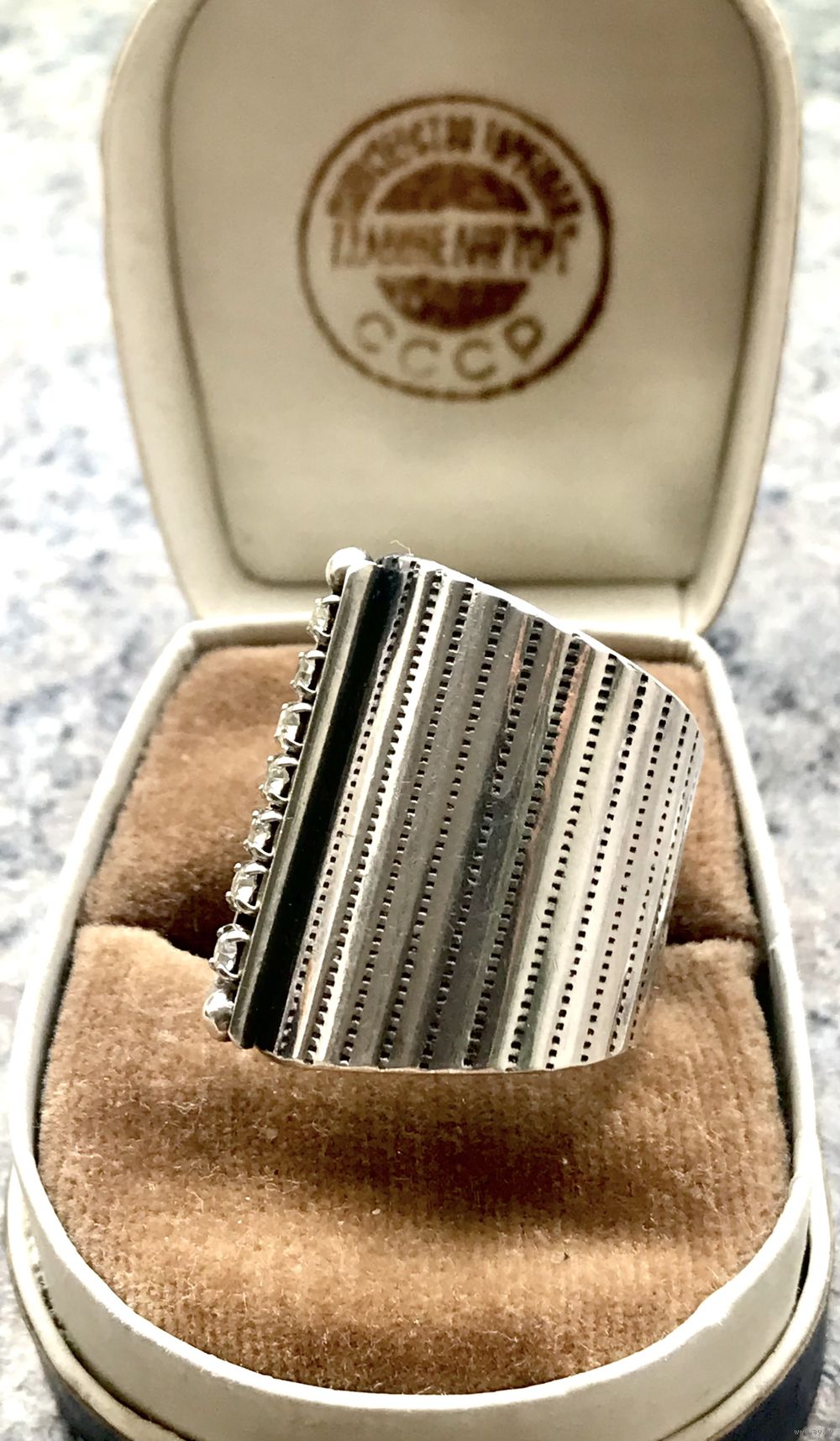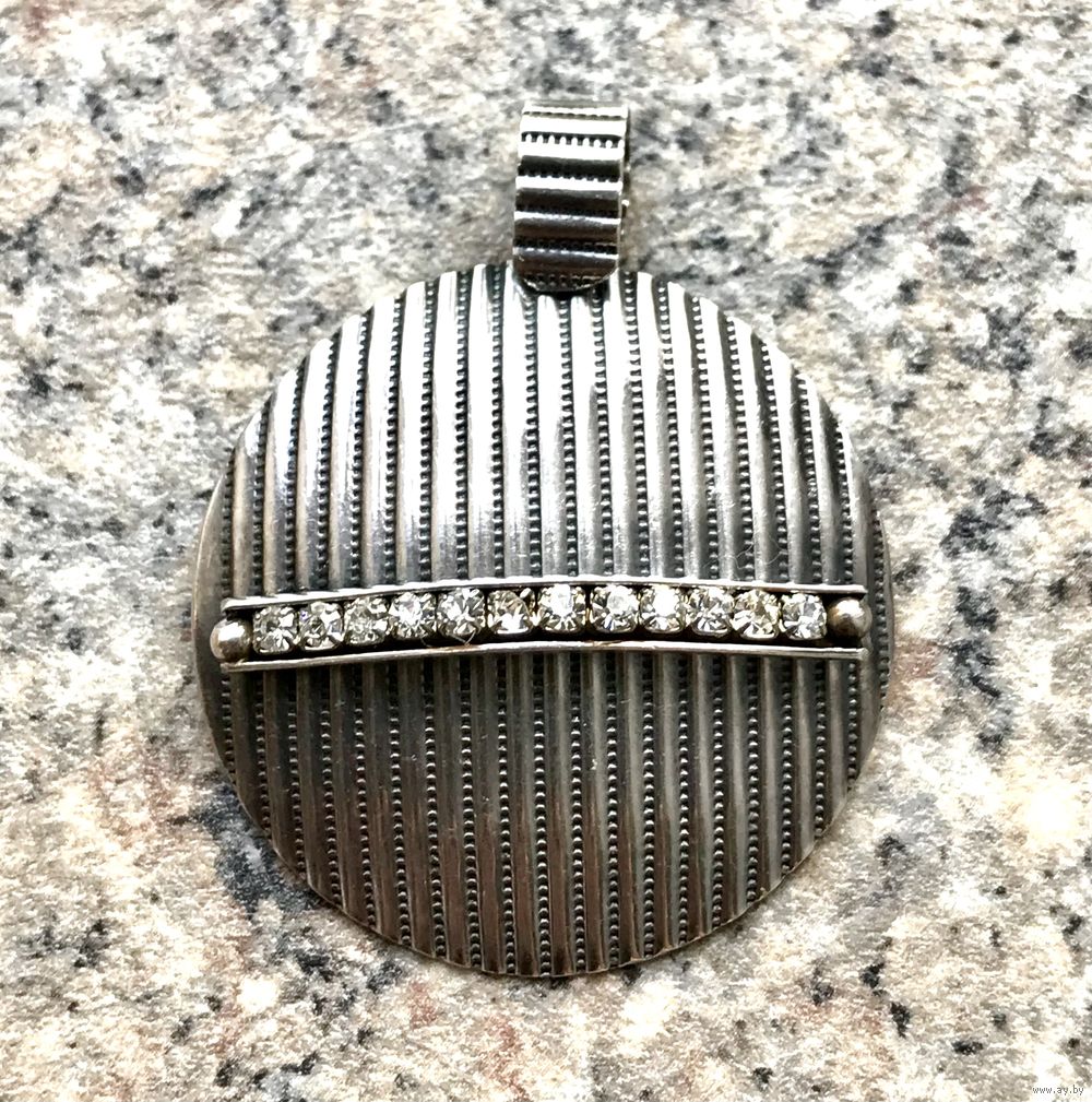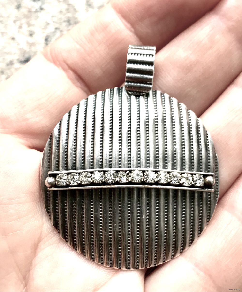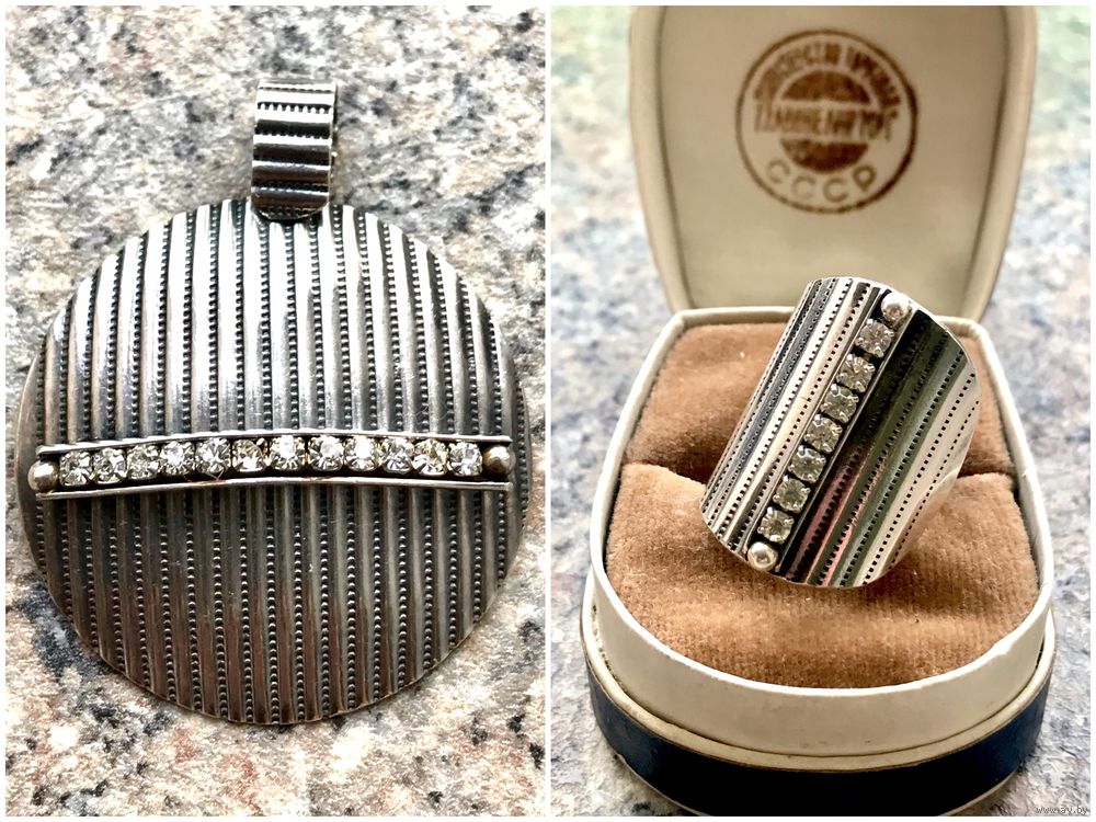 Эффектный, крупный комплект, состоящий из кулона и кольца из серебра 925 пр.(стоит отметка 925 и пробирное клеймо с зубром) со вставками фианитов. Кулон весом 9,78гр., диаметр диска 3,8см., высота с петлей 4,7см. Кольцо безразмерное, высота центральной части 2,5см., вес 6,12гр. Состояние комплекта хорошее.