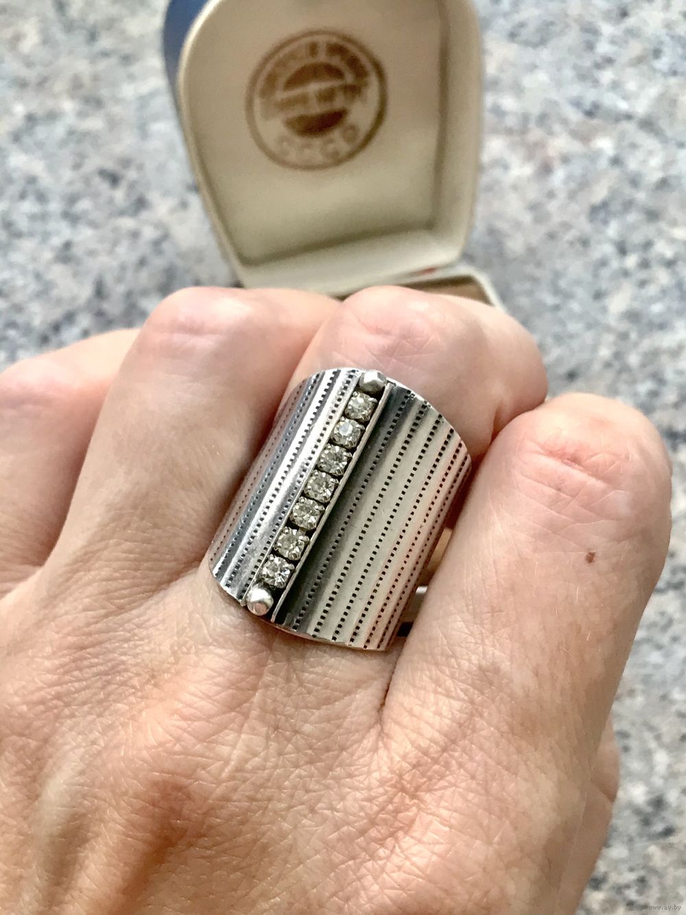 Эффектный, крупный комплект, состоящий из кулона и кольца из серебра 925 пр.(стоит отметка 925 и пробирное клеймо с зубром) со вставками фианитов. Кулон весом 9,78гр., диаметр диска 3,8см., высота с петлей 4,7см. Кольцо безразмерное, высота центральной части 2,5см., вес 6,12гр. Состояние комплекта хорошее.