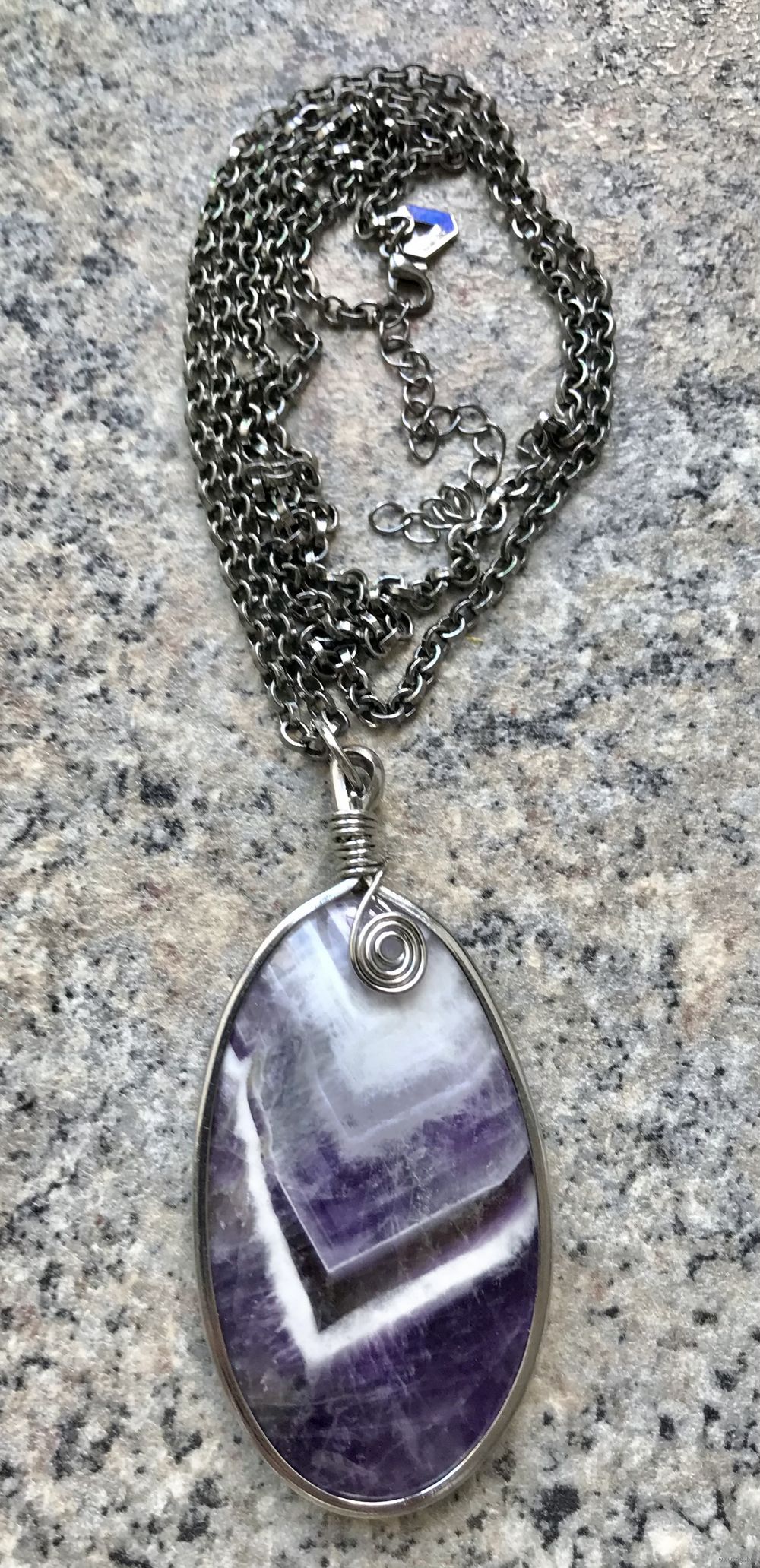Крупный кулон из аметиста, оправа из металла серебристого тона. Высота кулона с петлей 8см., размер вставки 6х3,5см. Длина цепочки 80см.+6см.доп.часть. Состояние хорошее.