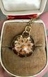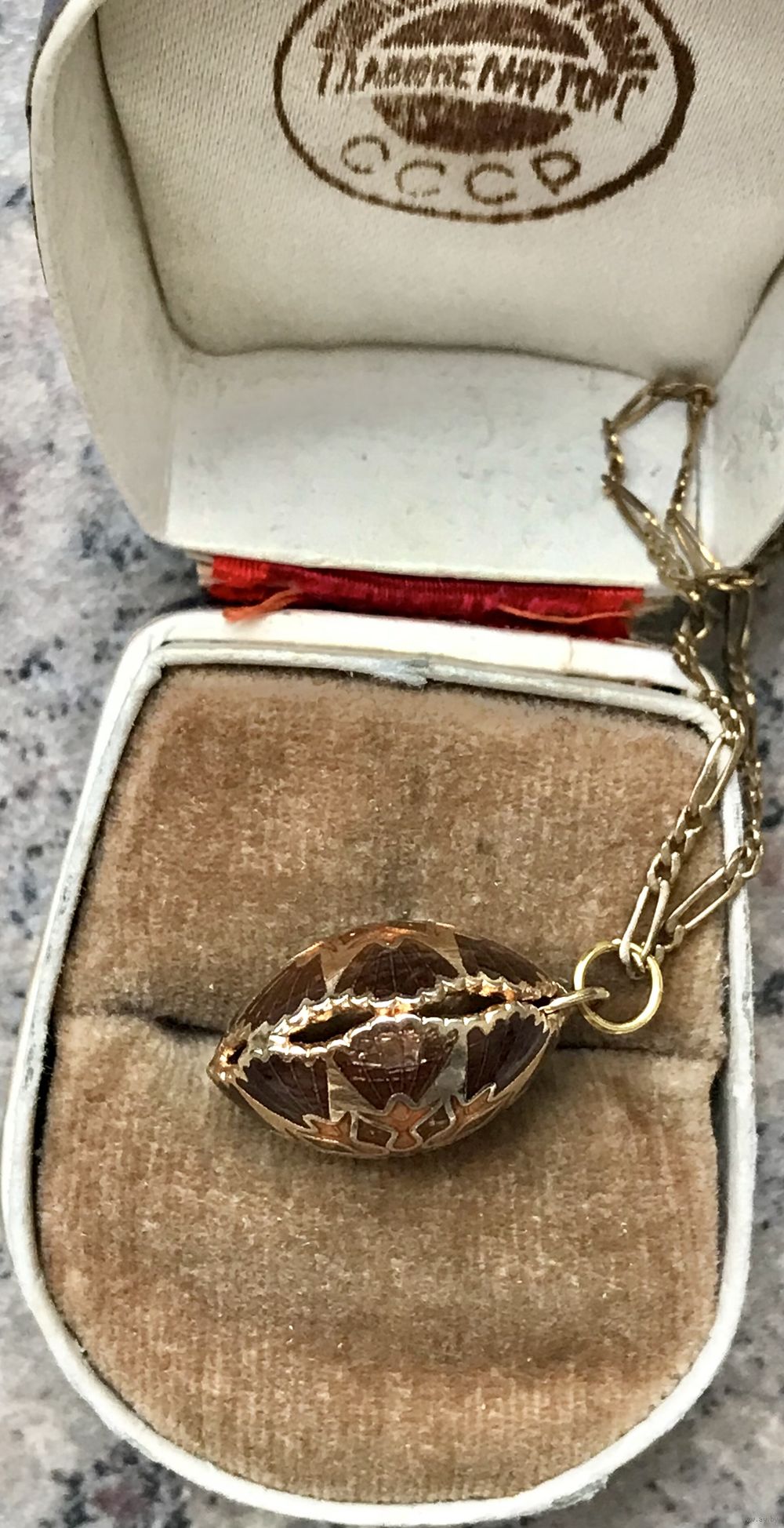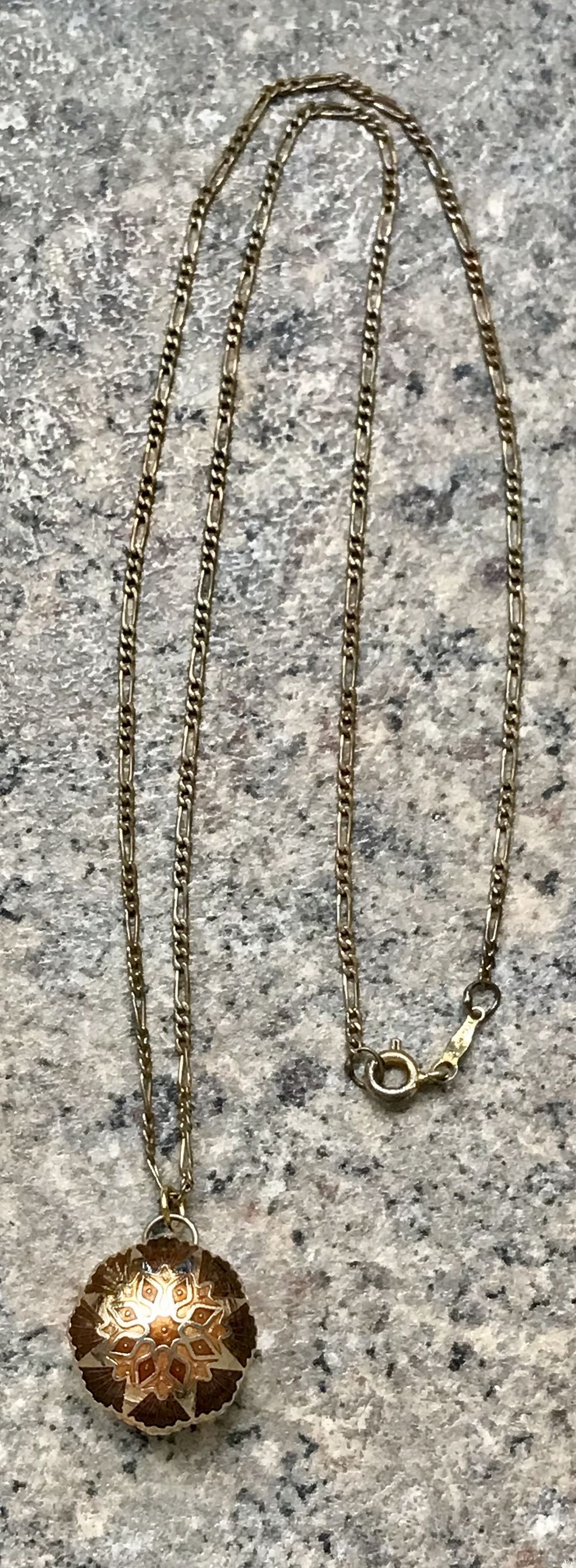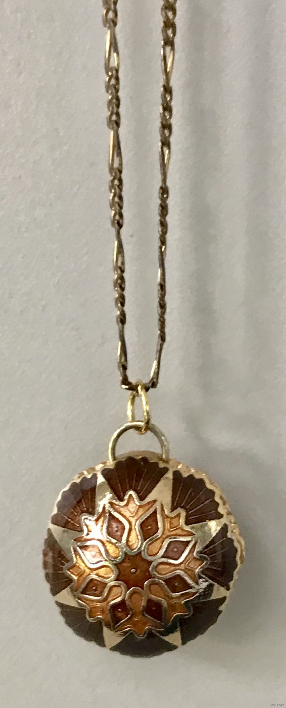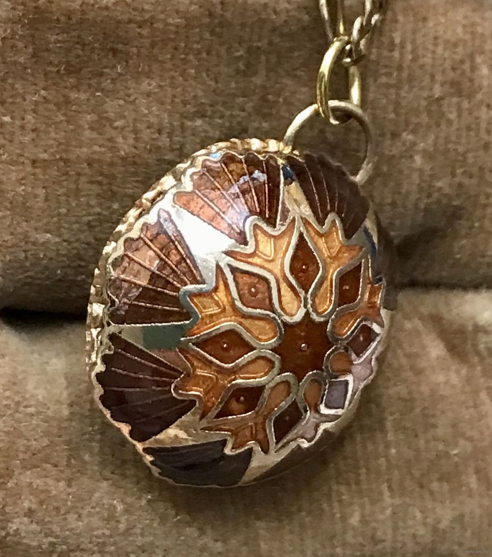 Винтажный кулон на цепочке. Украшения сделаны из металла золотого тона, кулон с двух сторон украшен эмалью. На одной стороне есть поверхностный скол эмали. Высота кулона с петлей 2,5см., диаметр подвески 2см., длина цепочки 50см. На цепочке местами незначительные потёртости позолоты.