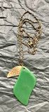 Кулон из пластика зелёного цвета и накладки из металла золотого тона на цепочке якорного плетения из латуни. Высота кулона с петлей 5,6см., длина цепочки 60 см. Состояние хорошее.