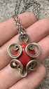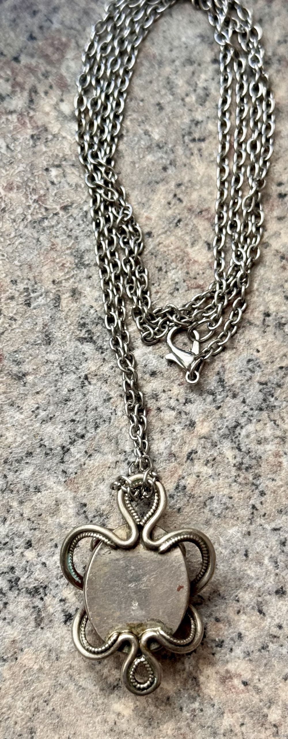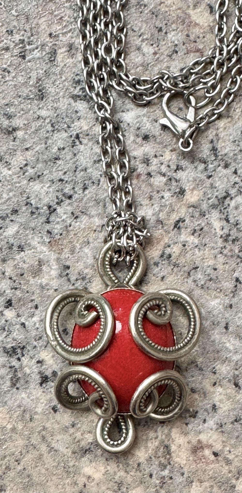 Кулон с основой из мельхиора, вставка красного цвета из стекла? керамики?. Размер кулона 3,7х2,7см. Цепочка из металла серебристого тона, длина 80 см. Состояние хорошее.
