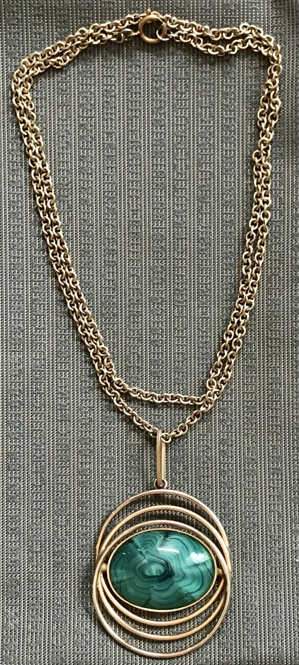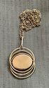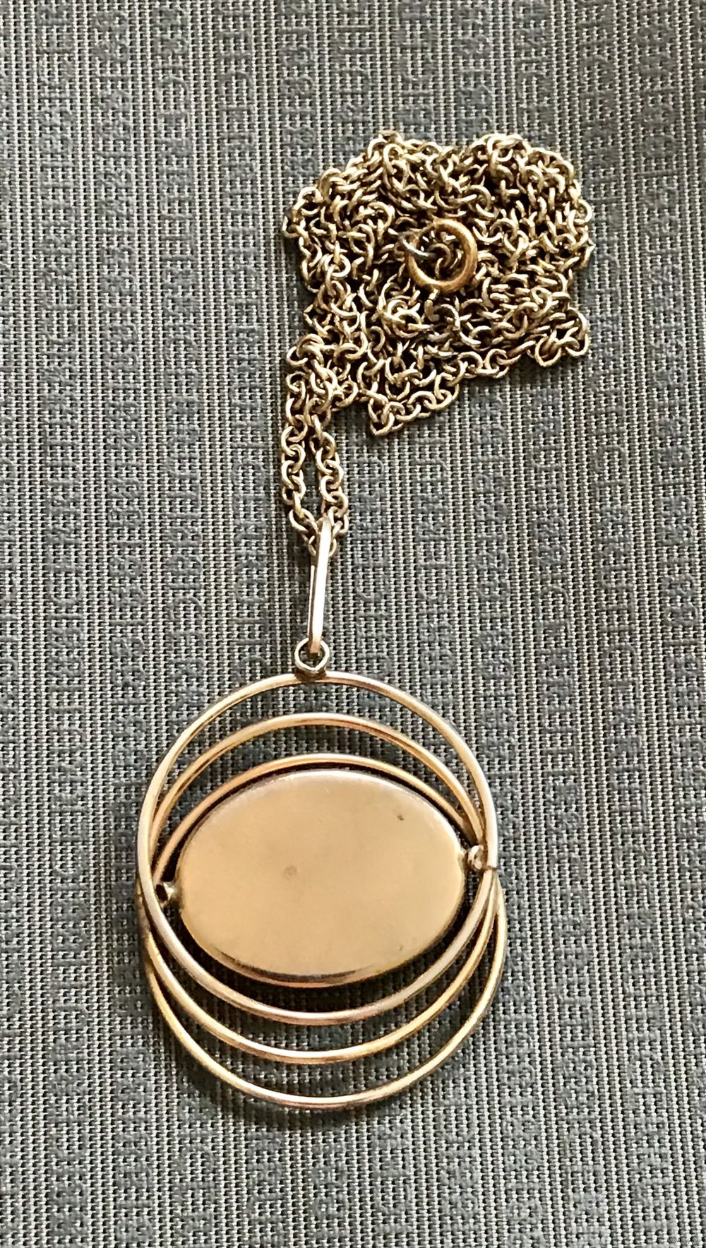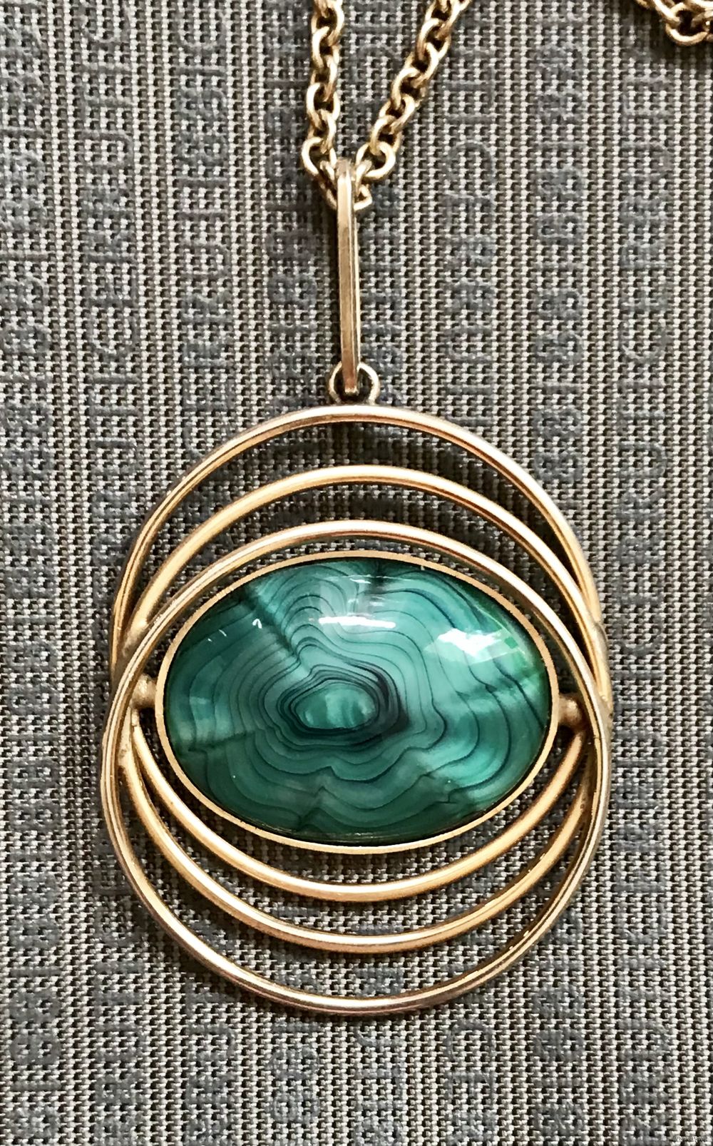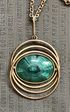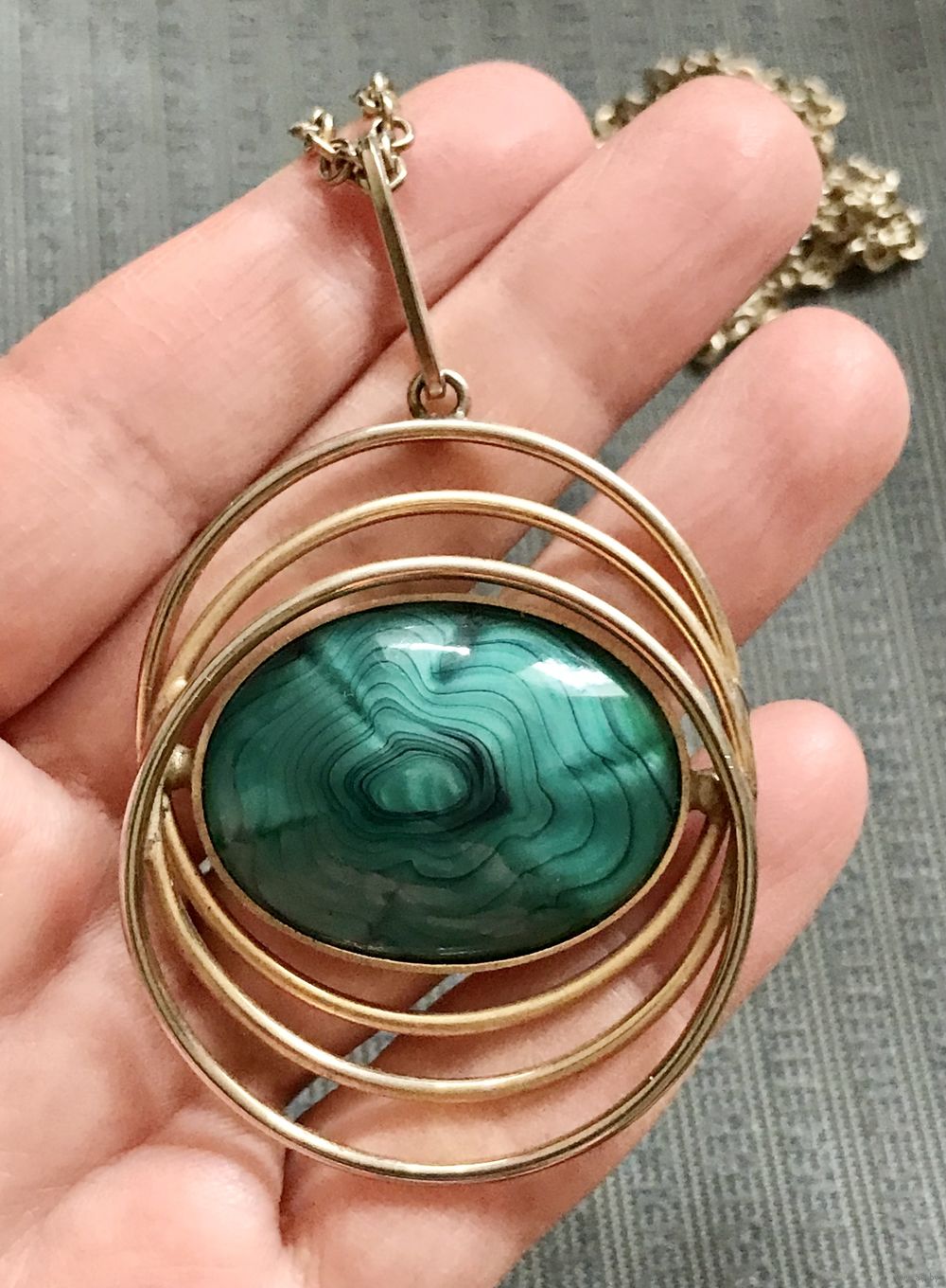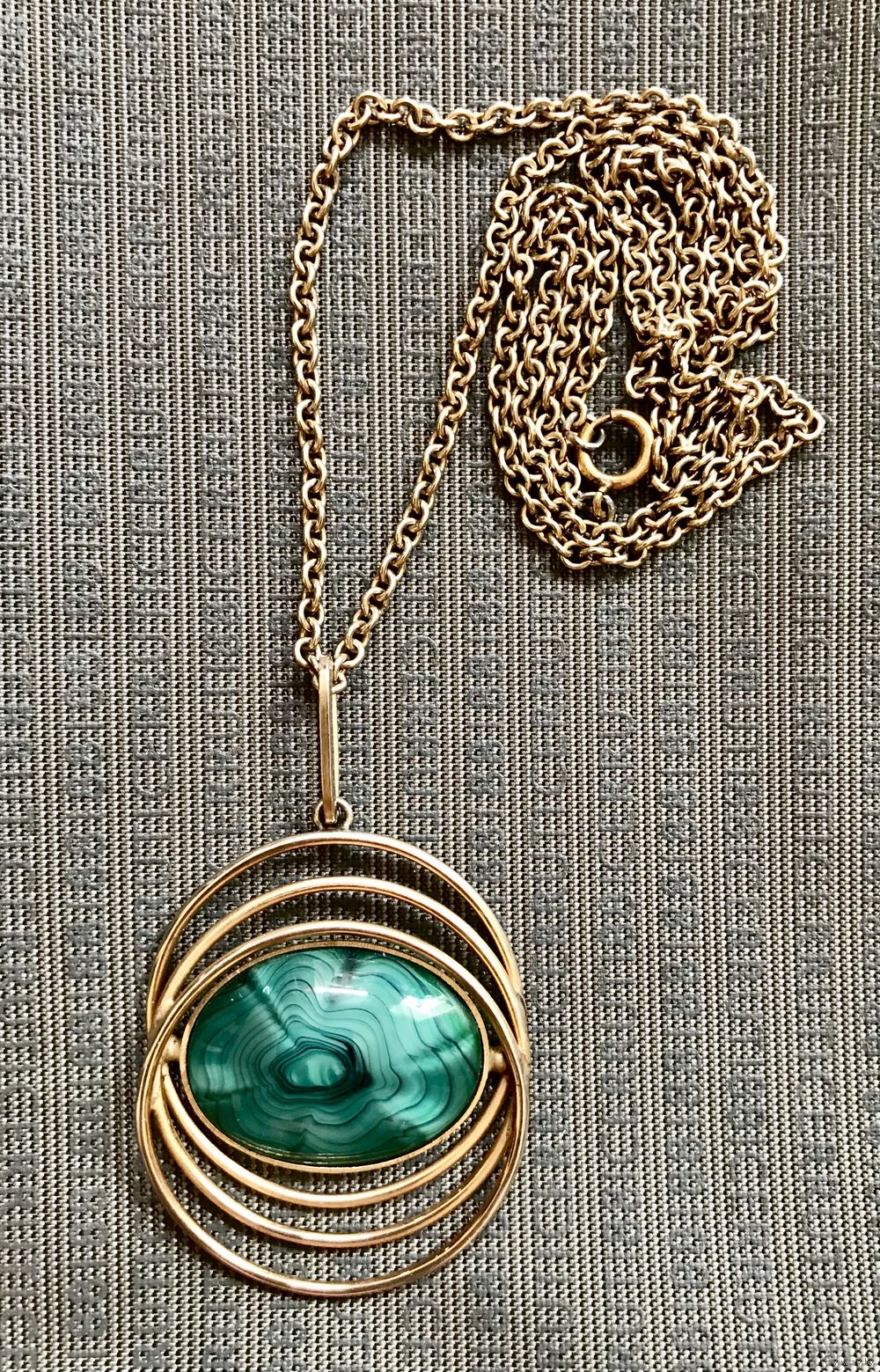 Винтажный крупный кулон с основой из латуни с позолотой и вставкой из художественного стекла на цепочке. На основе кулона и на цепочке есть незначительные потёртости. Высота кулона с петлёй 7см., размер вставки 3,2х2,3см., длина цепочки 72см.