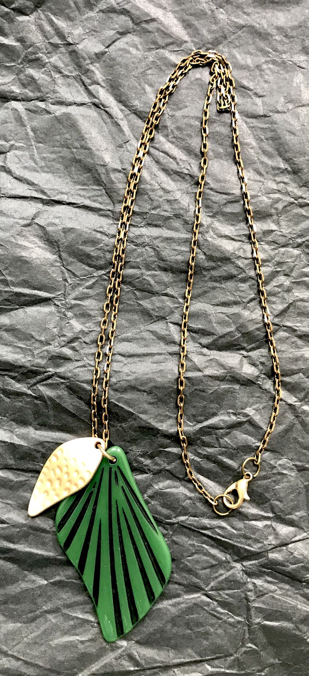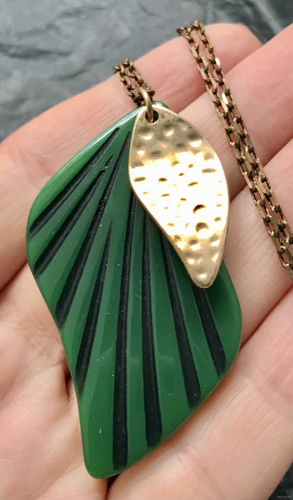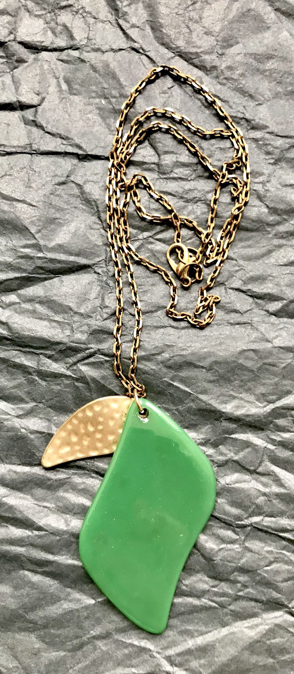 Кулон из пластика зелёного цвета и накладки из металла золотого тона на цепочке якорного плетения из латуни. Высота кулона с петлей 5,6см., длина цепочки 60 см. Состояние хорошее.