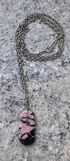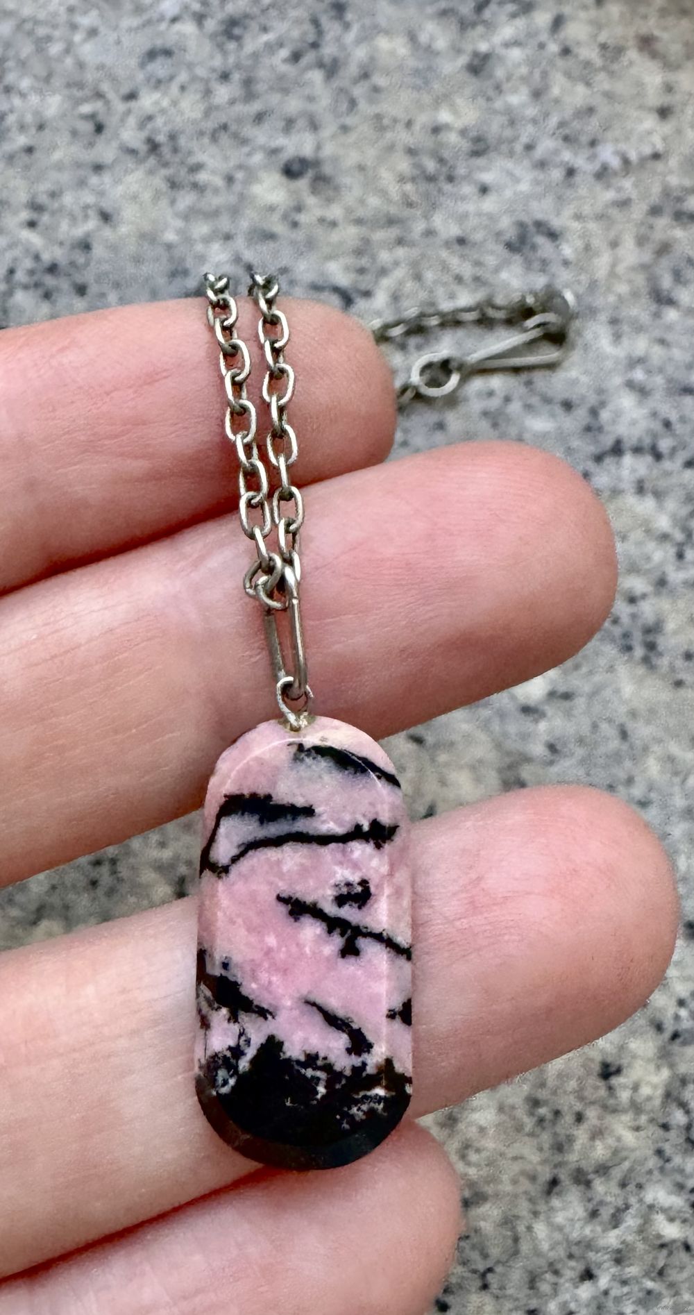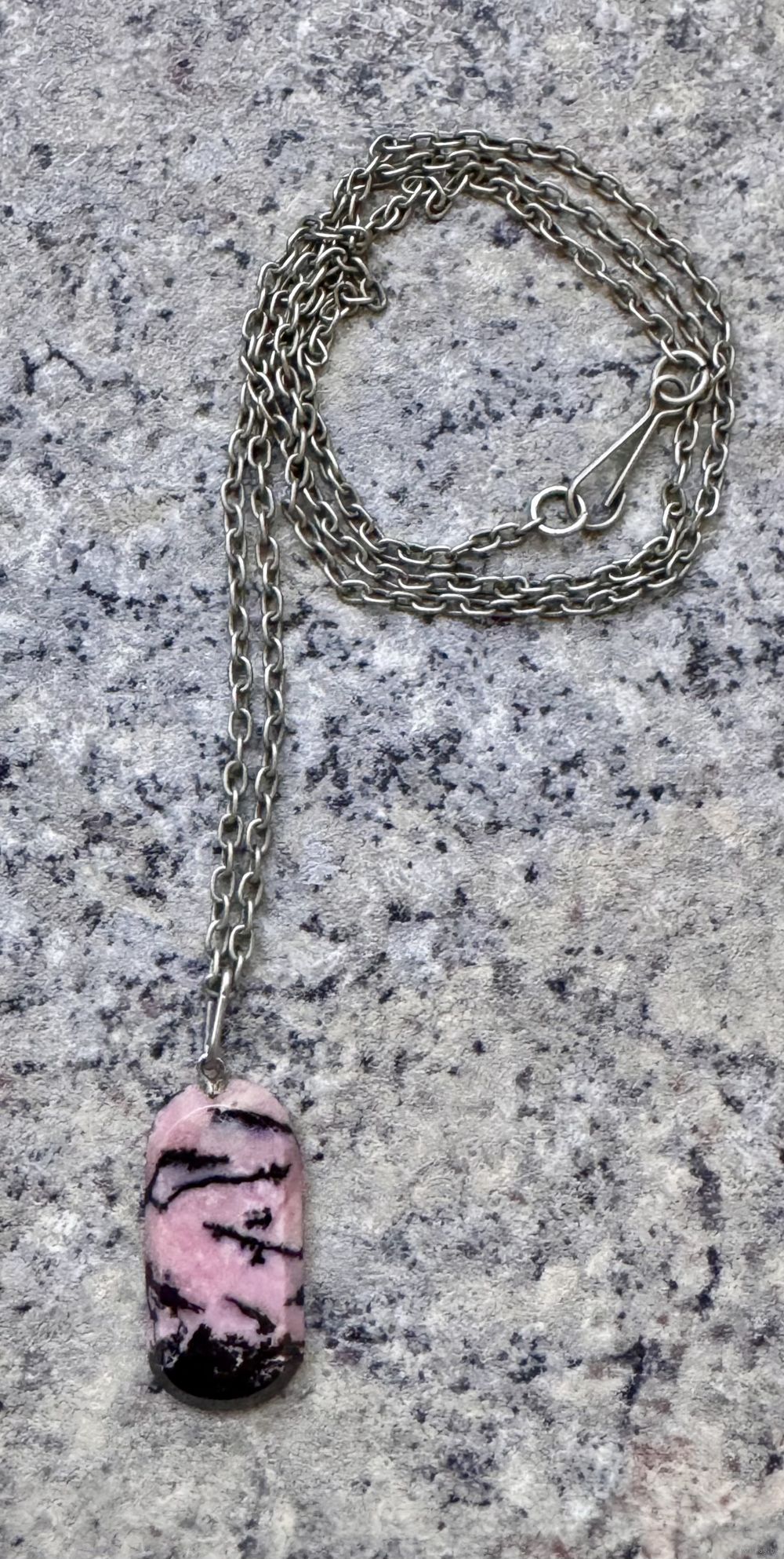 Винтажное украшение из мельхиора, кулон небольшого размера из камня родонит. Длина цепочки 48см., размер кулона 3х1,2см. Состояние хорошее.