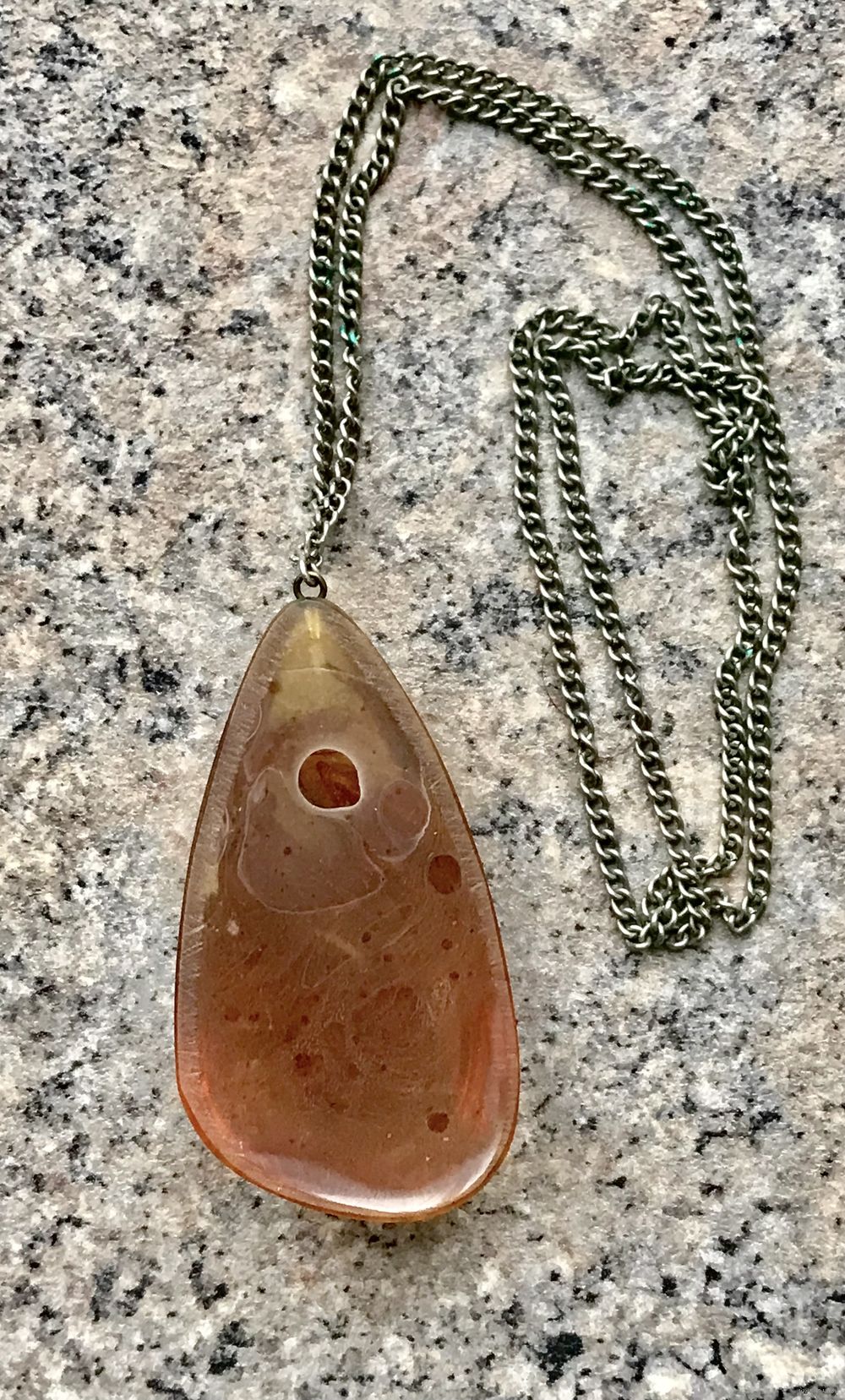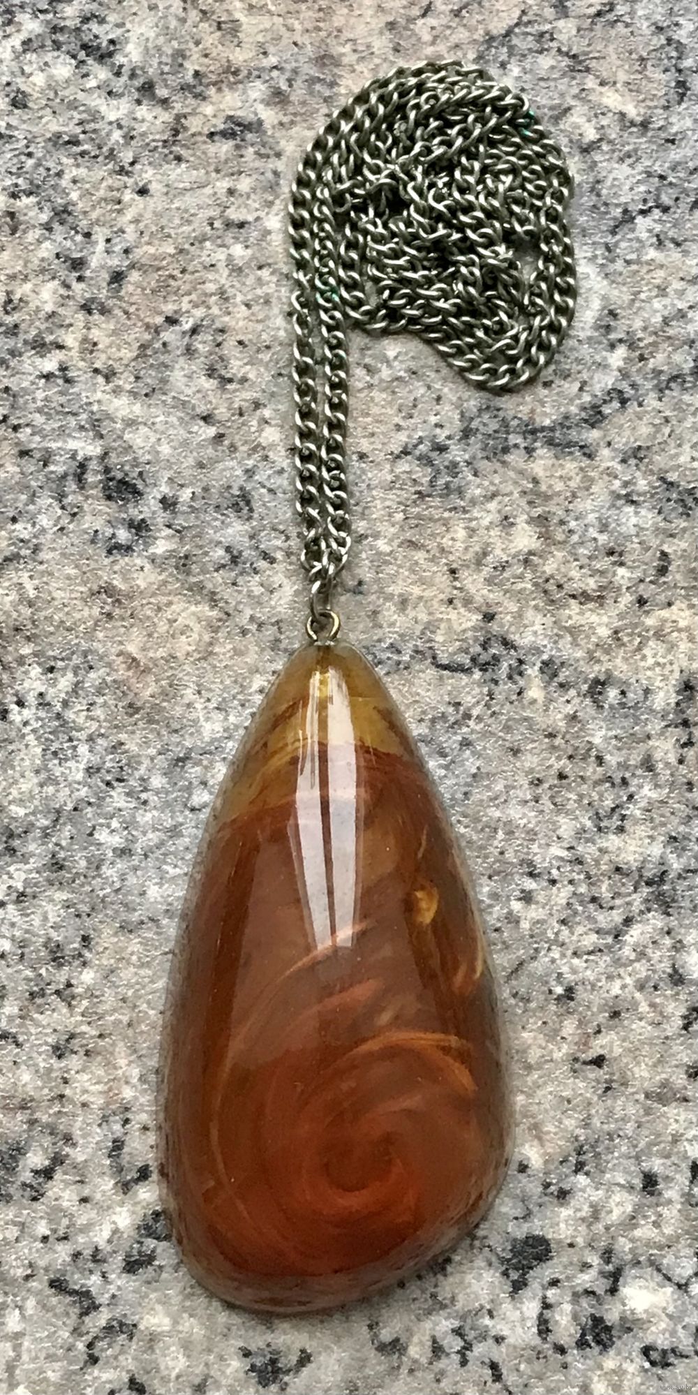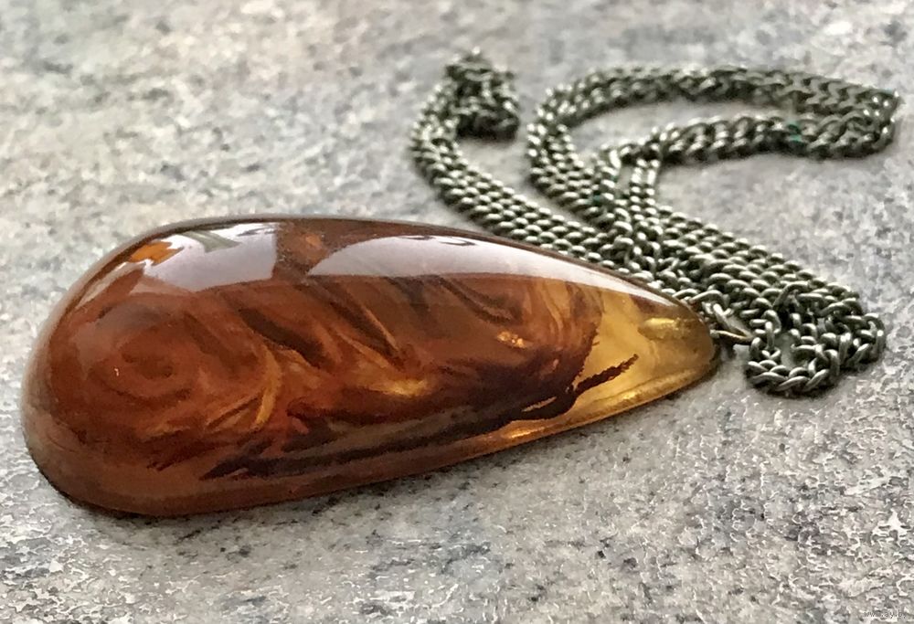 Винтажный кулон из пластика под янтарь на мельхиоровой цепочке. Размер кулона 6,8х3,5см., длина цепочки 60см., цепочка неразъемная. Состояние хорошее.