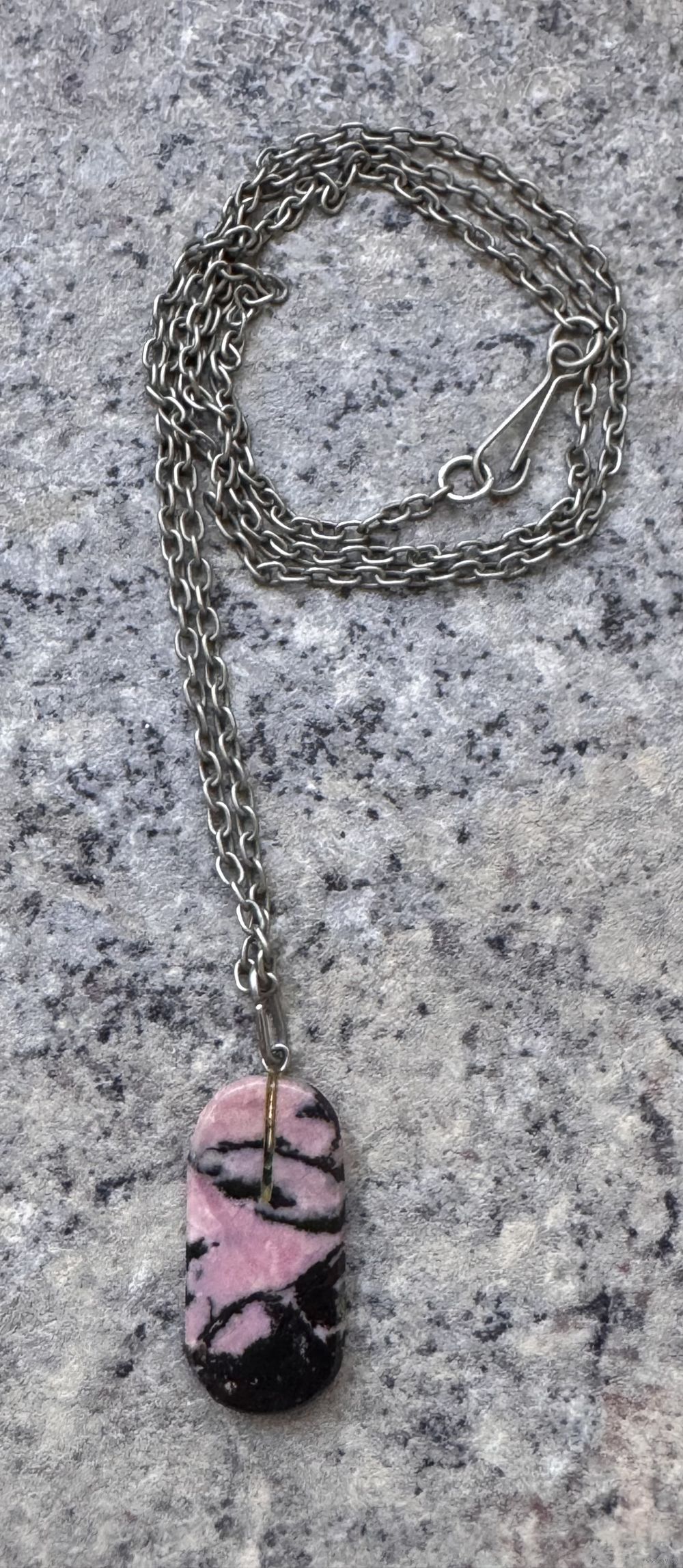 Винтажное украшение из мельхиора, кулон небольшого размера из камня родонит. Длина цепочки 48см., размер кулона 3х1,2см. Состояние хорошее.