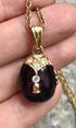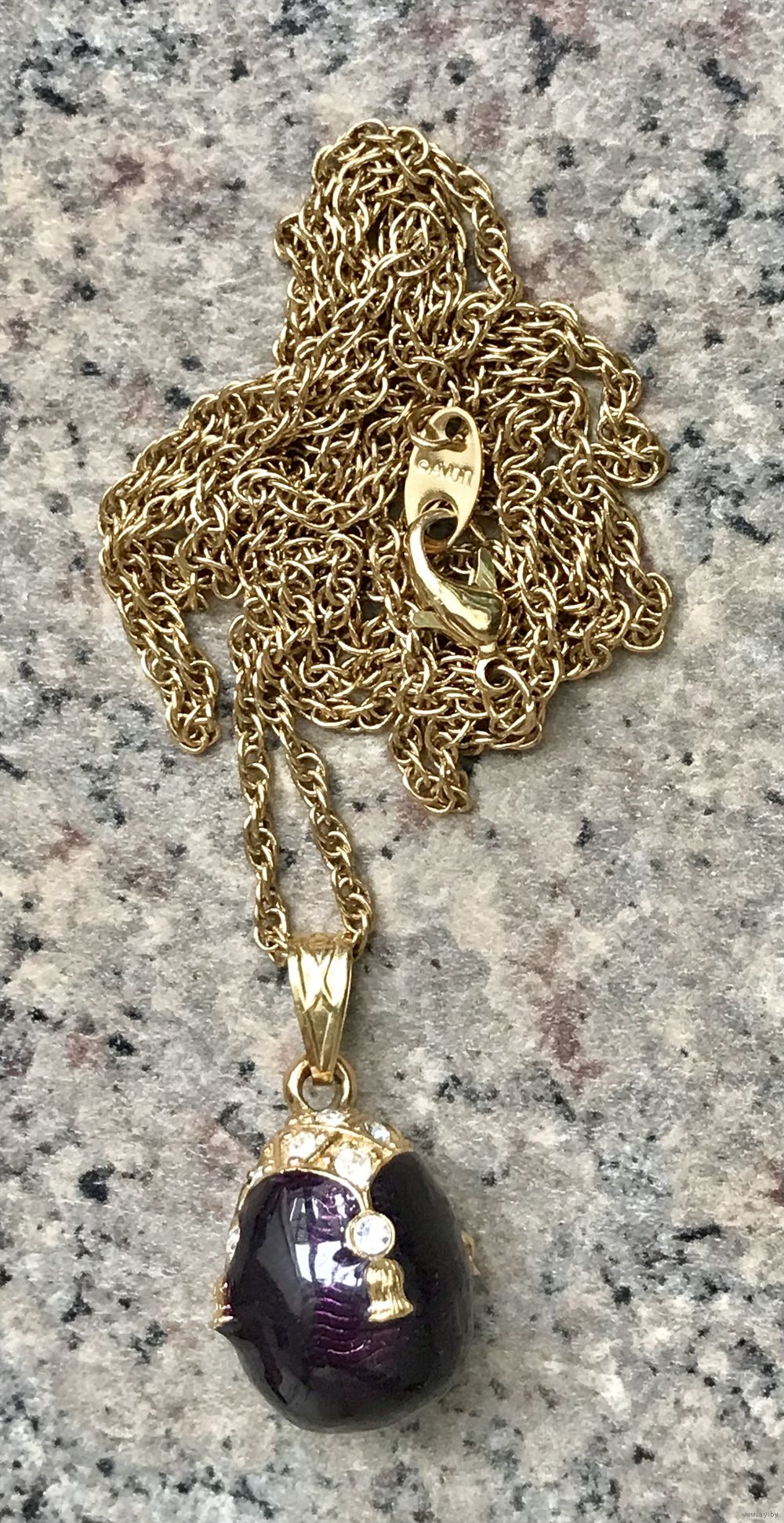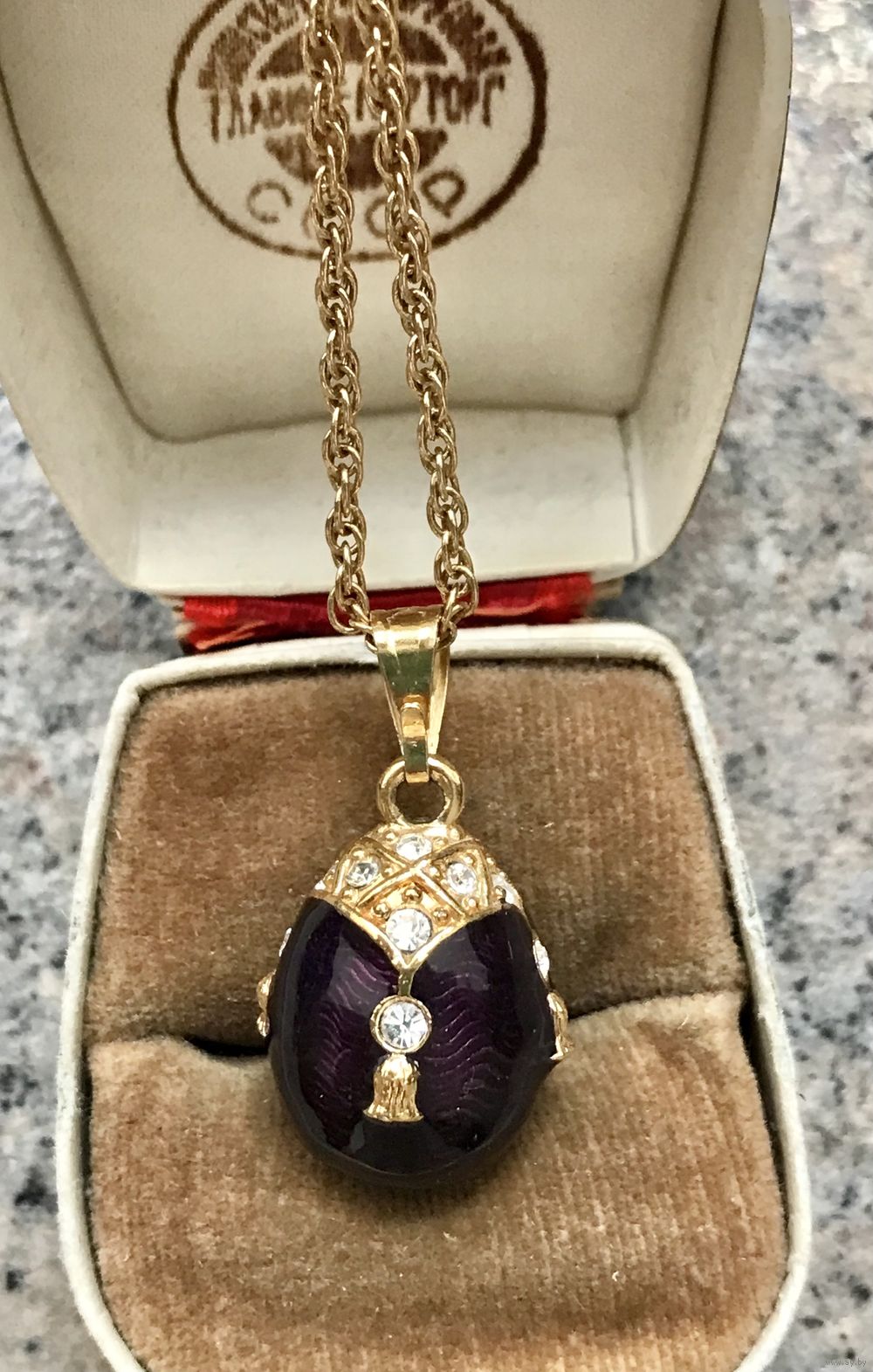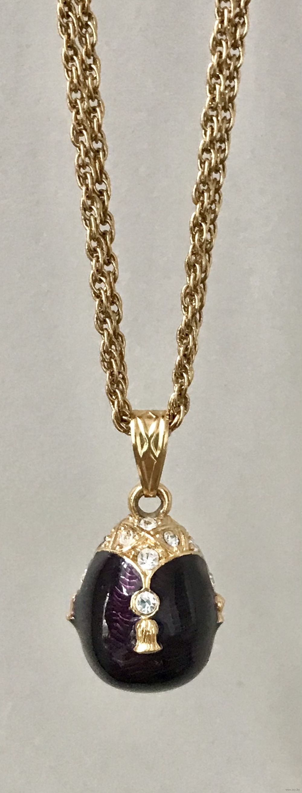 Винтажное украшение Avon. Цепочка из металла золотого тона, кулон в виде пасхального яйца, покрыт эмалью темно-фиолетового цвета и украшен кристаллами. Высота кулона с петлей 3см., длина цепочки 78см. Состояние хорошее.