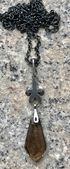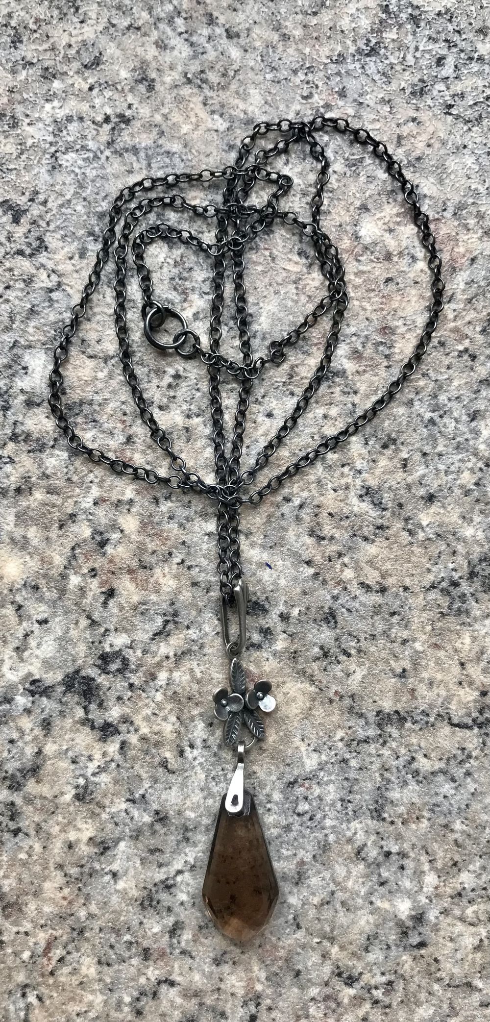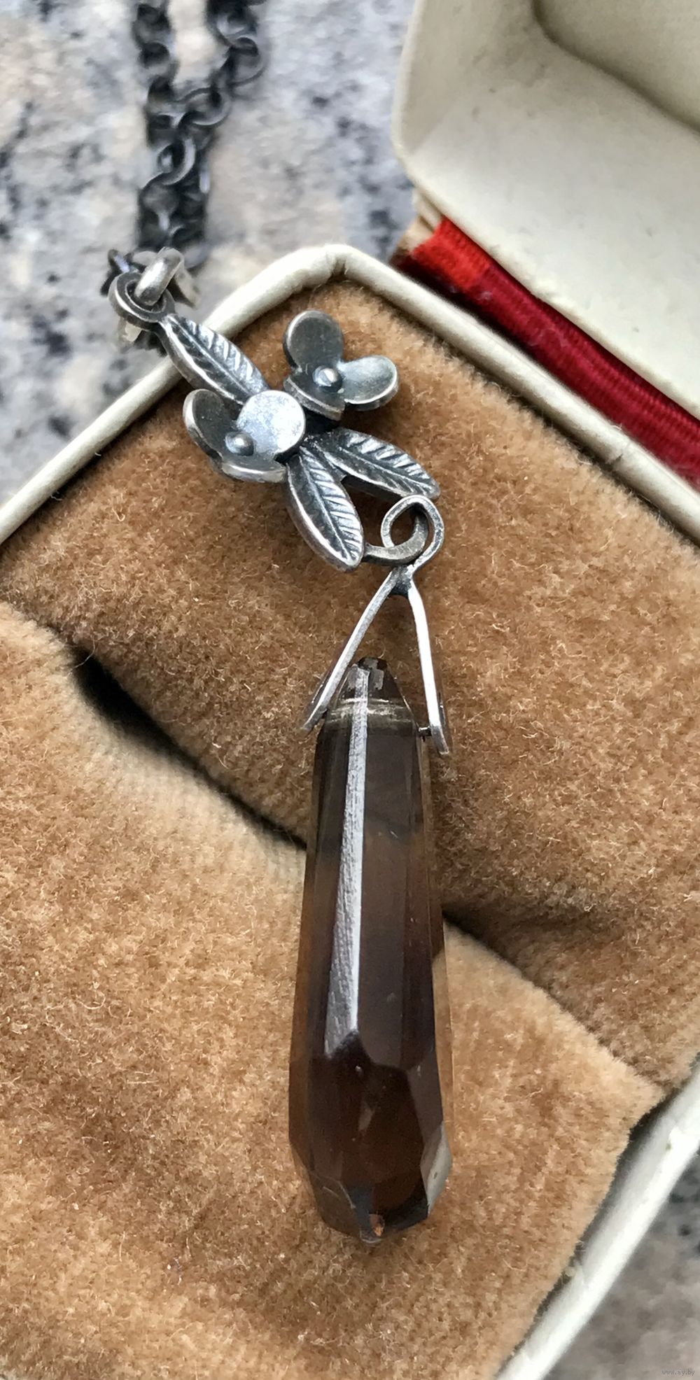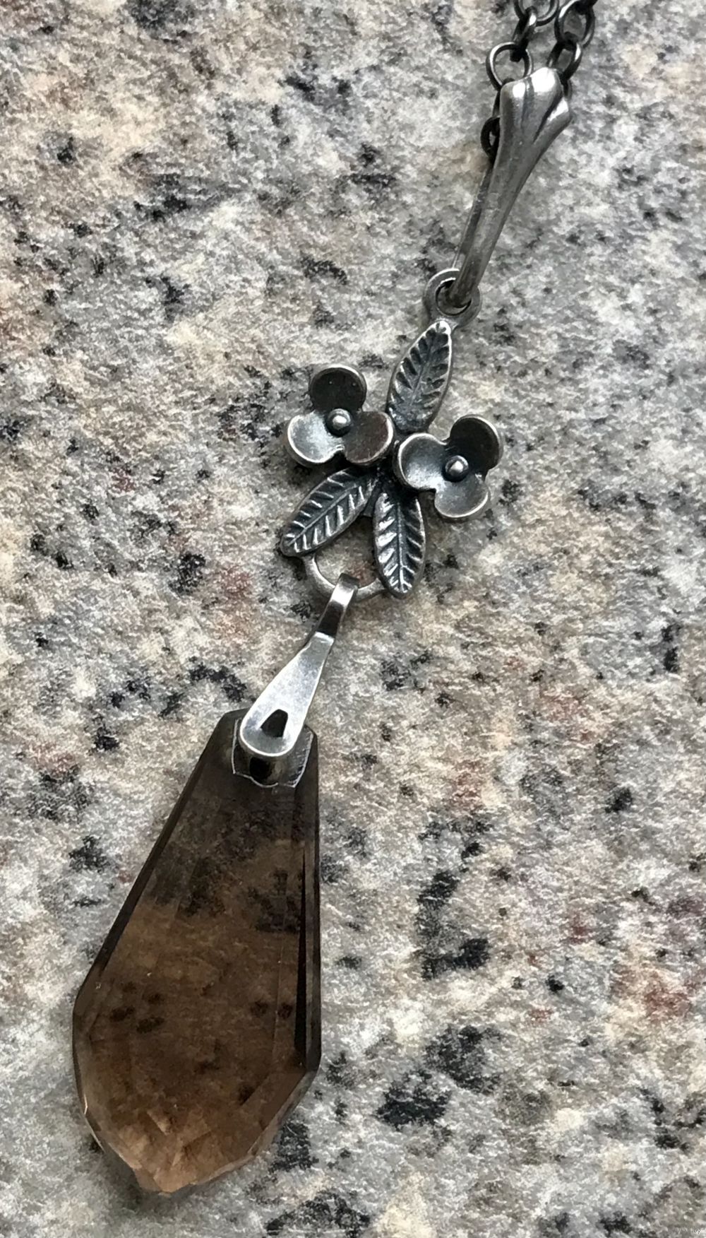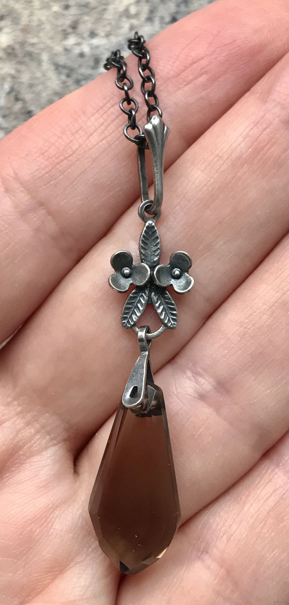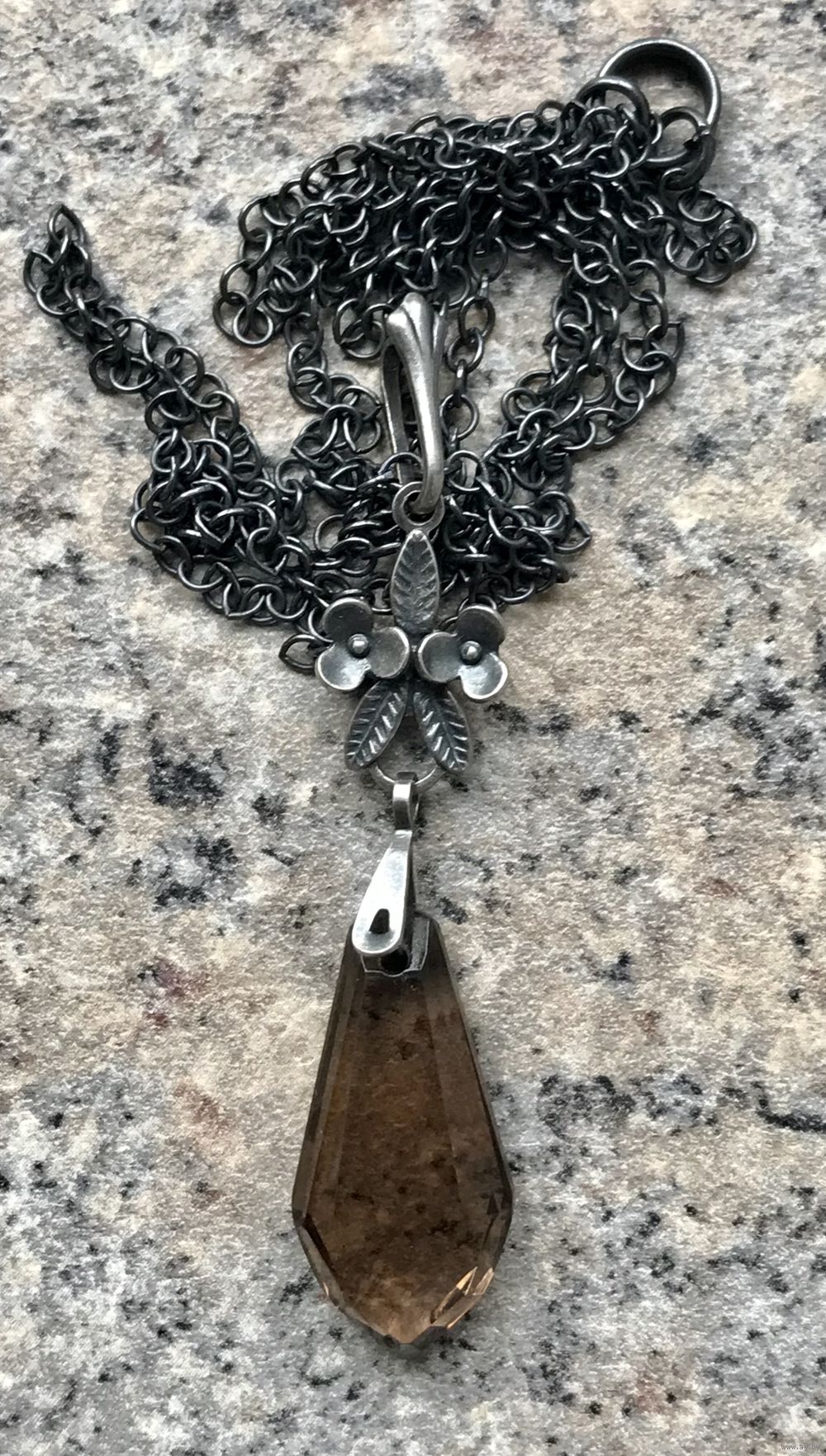 Винтажный кулон с основой из мельхиора (стоит клеймо) и вставкой из ювелирного стекла под дымчатый кварц. Кулон на родной цепочке якорного плетения. Высота 5,3см., вставка 2,2х 1,0 (в самом широком месте). Длина цепочки 60см., неразъемная. Состояние хорошее.