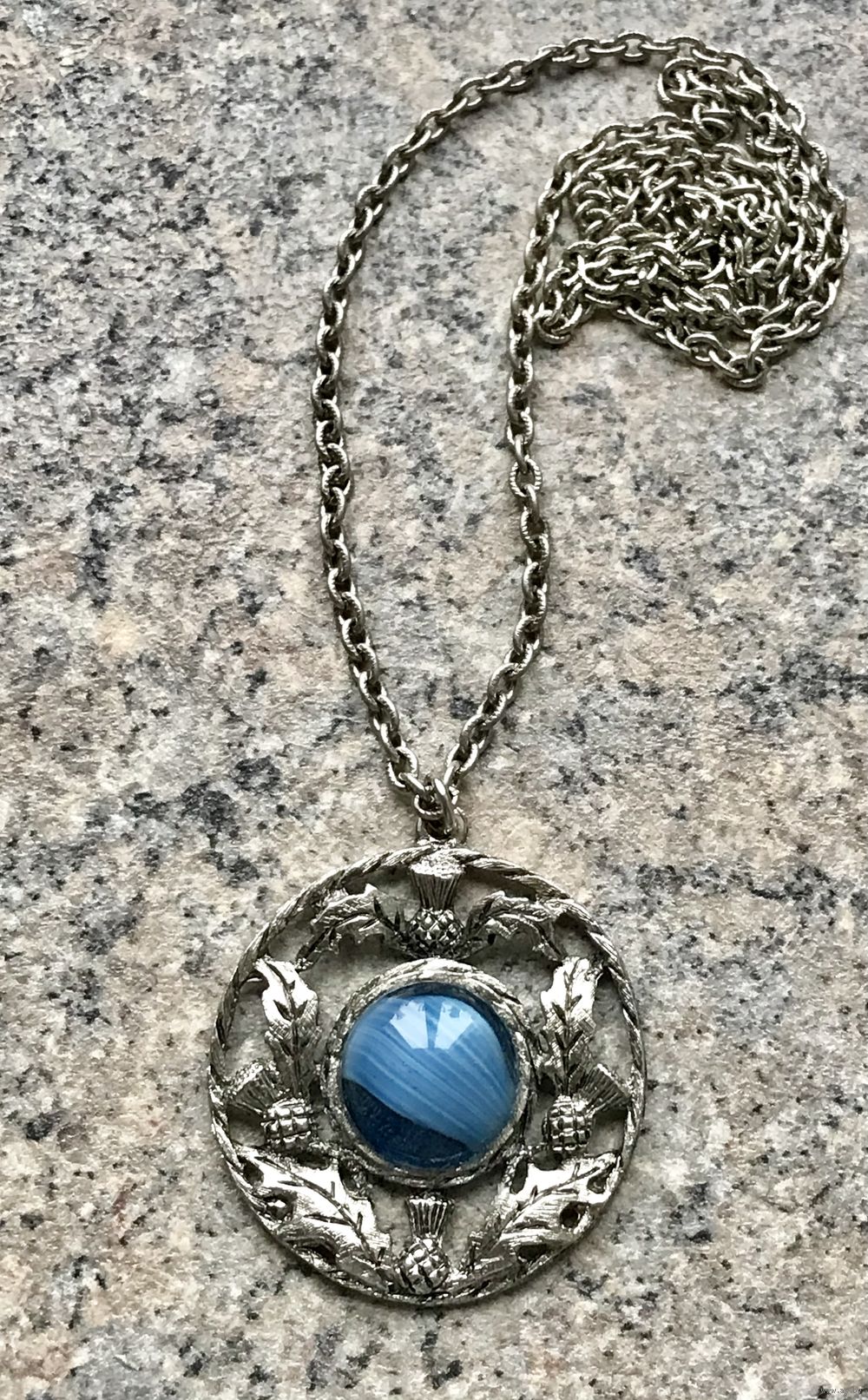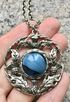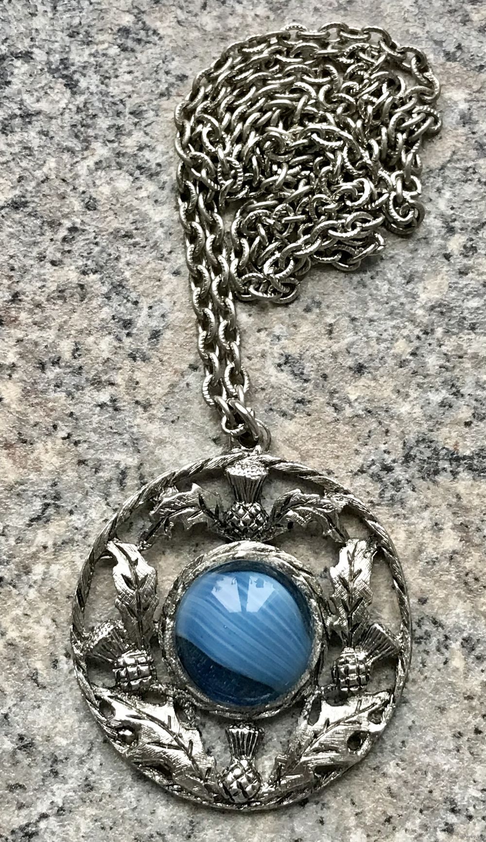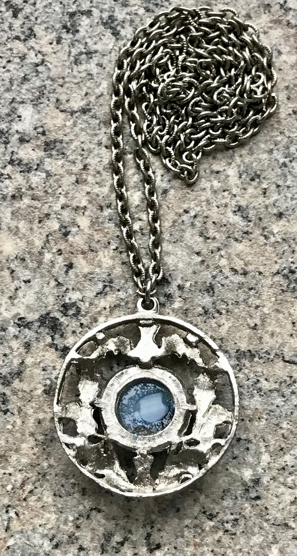 Винтажное украшение в стиле бренда Miracle (Англия 70-е гг.). Основа выполнена из пьютера, вставка из художественного стекла. Высота кулона с петлей 5см., диаметр подвески 4,5см., диаметр вставки 1,8см. Цепочка неразъемная, длина 68см. Состояние хорошее.