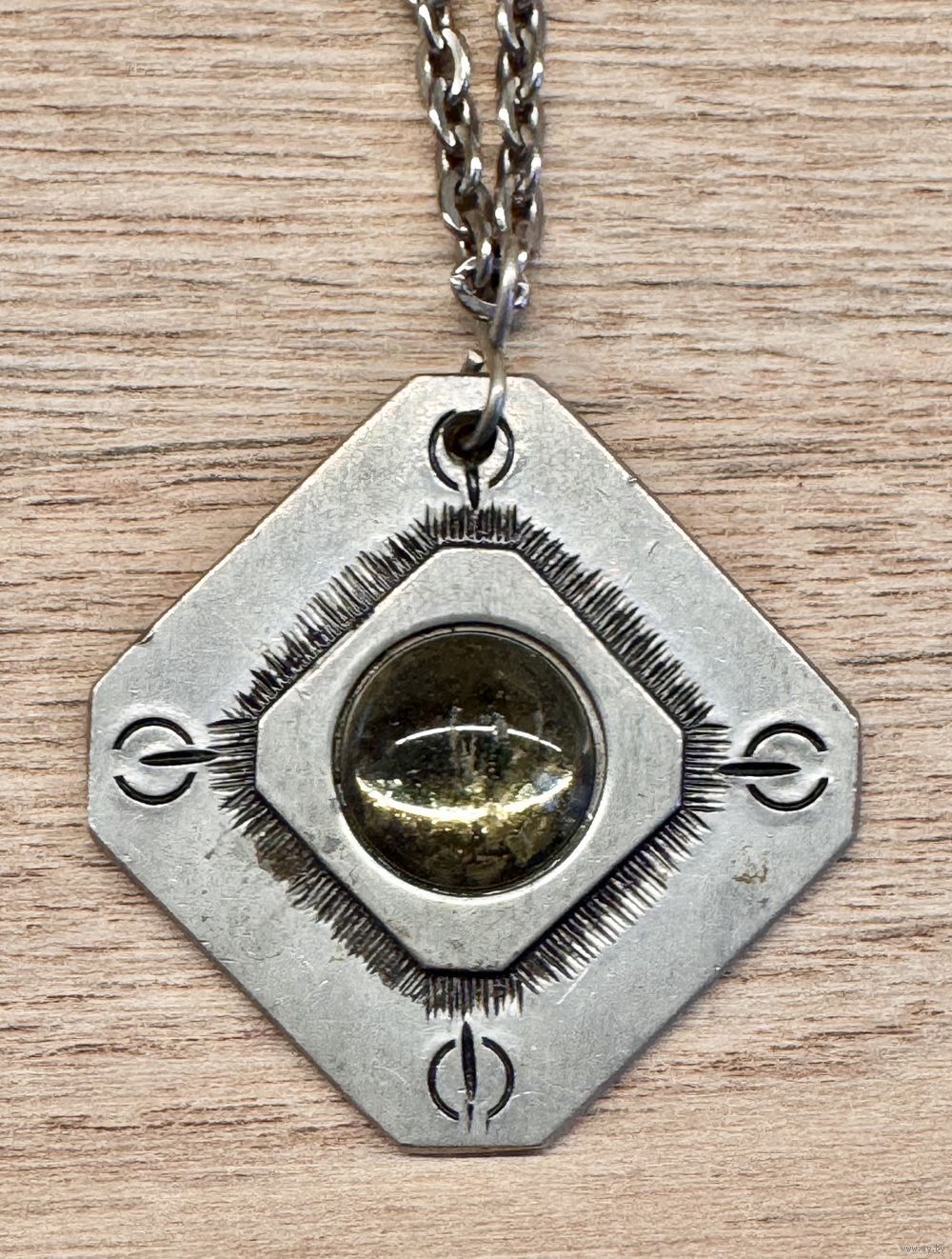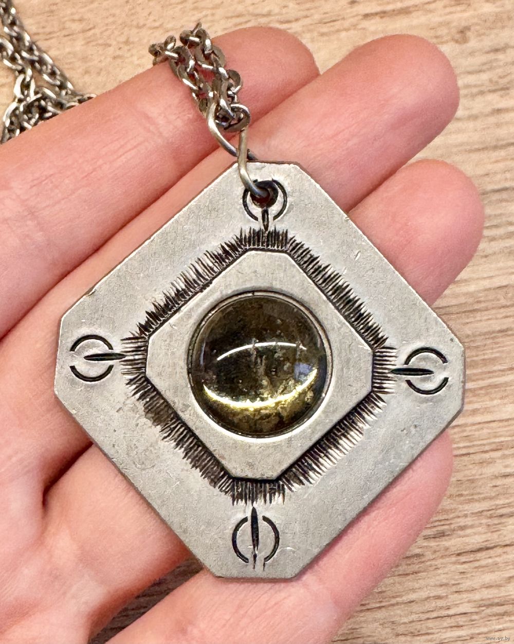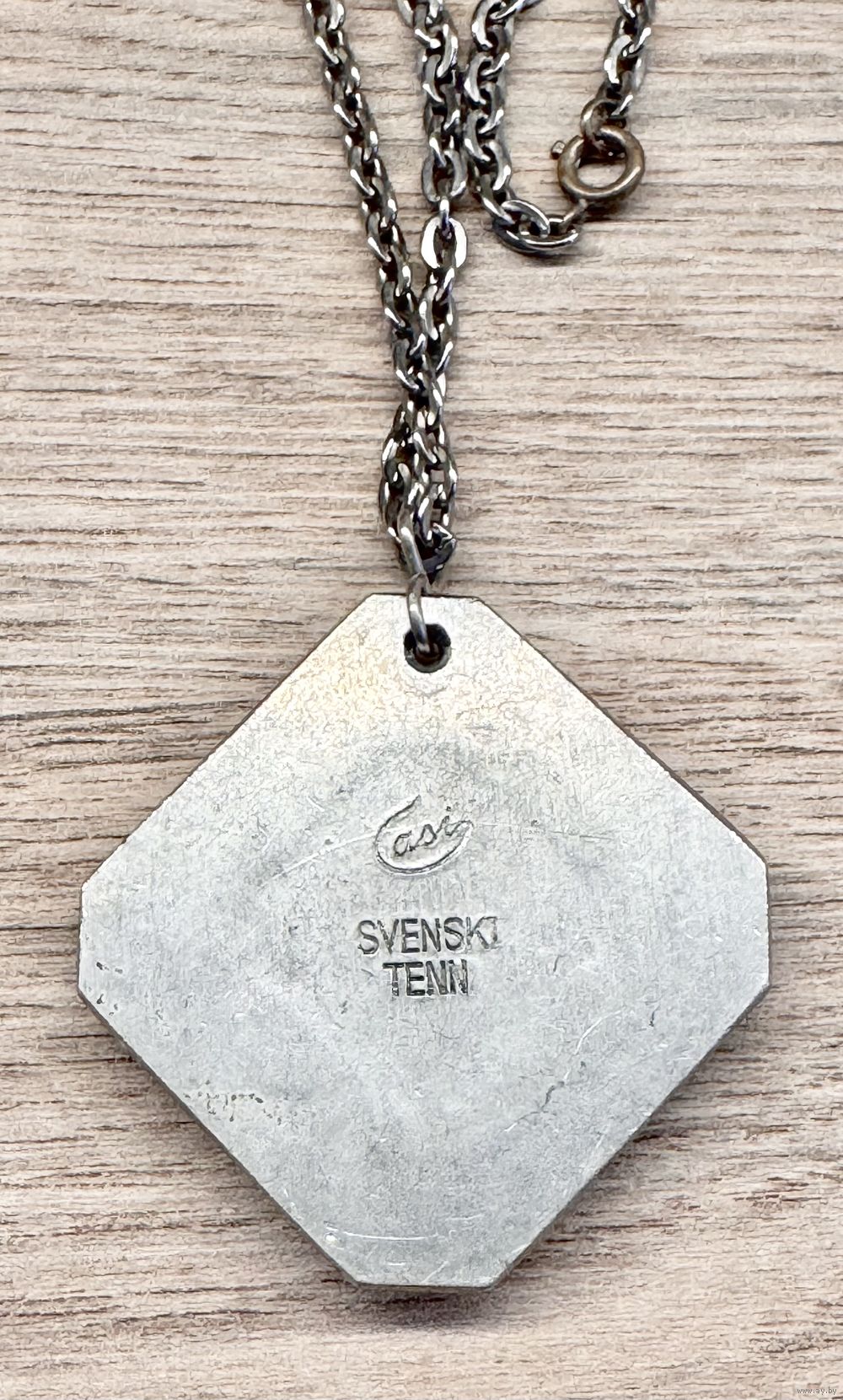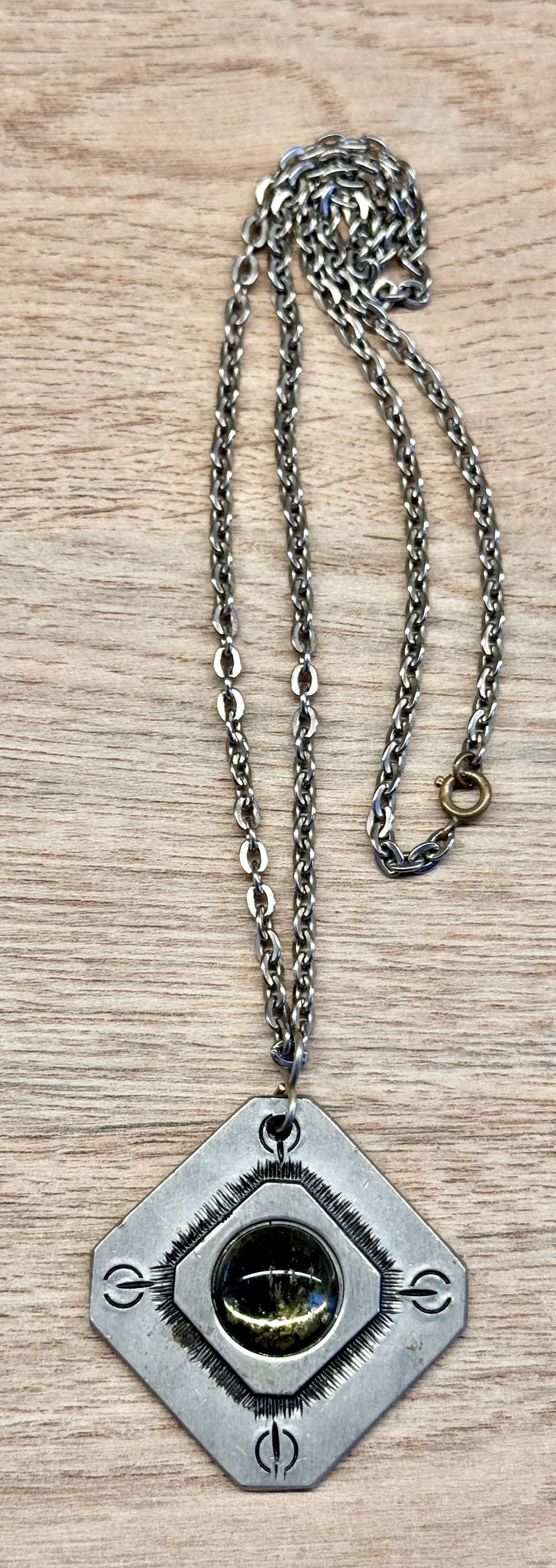 Винтажное украшение из олова шведского бренда Svenskt Tenn. Вставка из стекла, имеются царапины. Длина цепочки 60см., размер кулона 4х4см., диаметр вставки 1,5см. Маркировано.