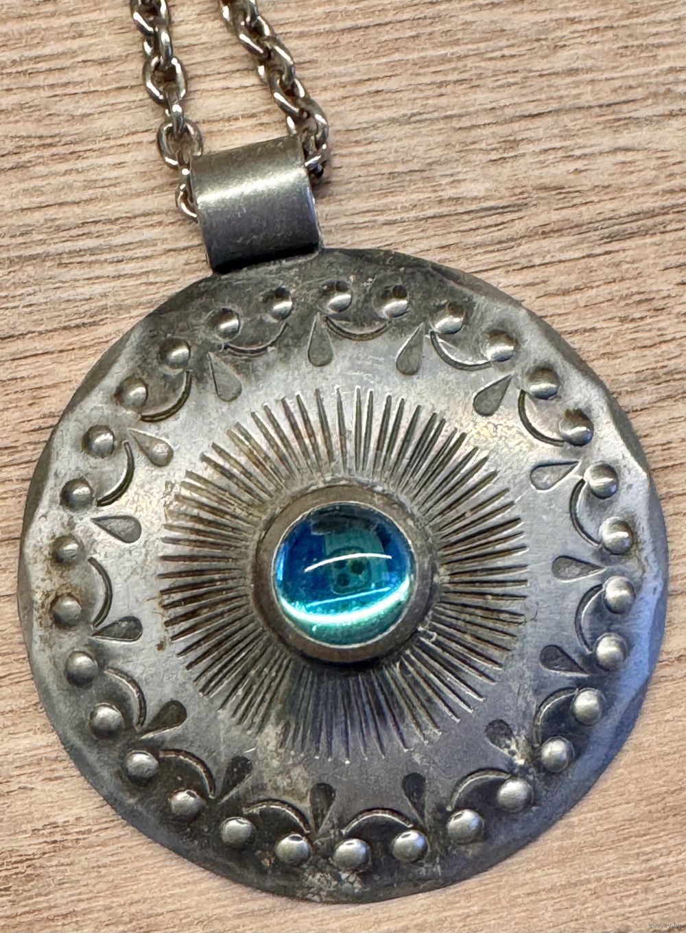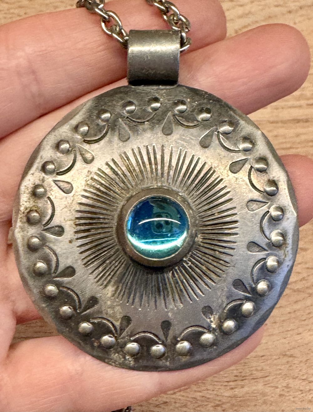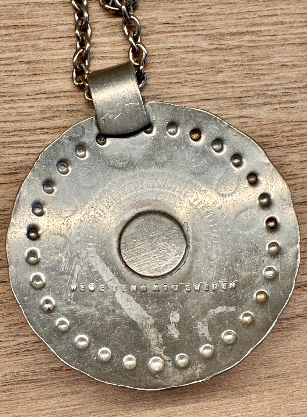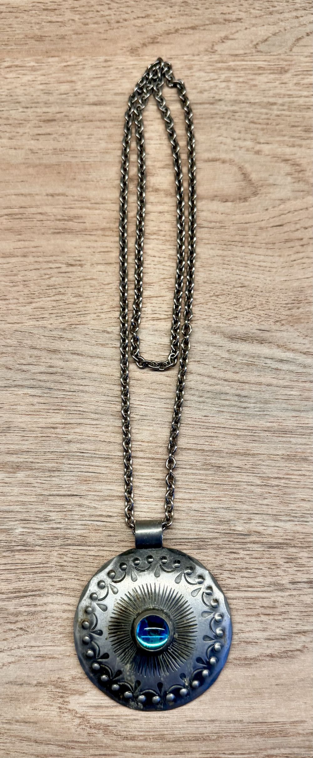 Винтажное украшение из олова шведского бренда WEGE TENN. Длина цепочки 68см., неразъемная. Крупный (диаметр 5,5см.) кулон украшен вставкой из стекла купоросного цвета. Маркировано. Состояние хорошее.