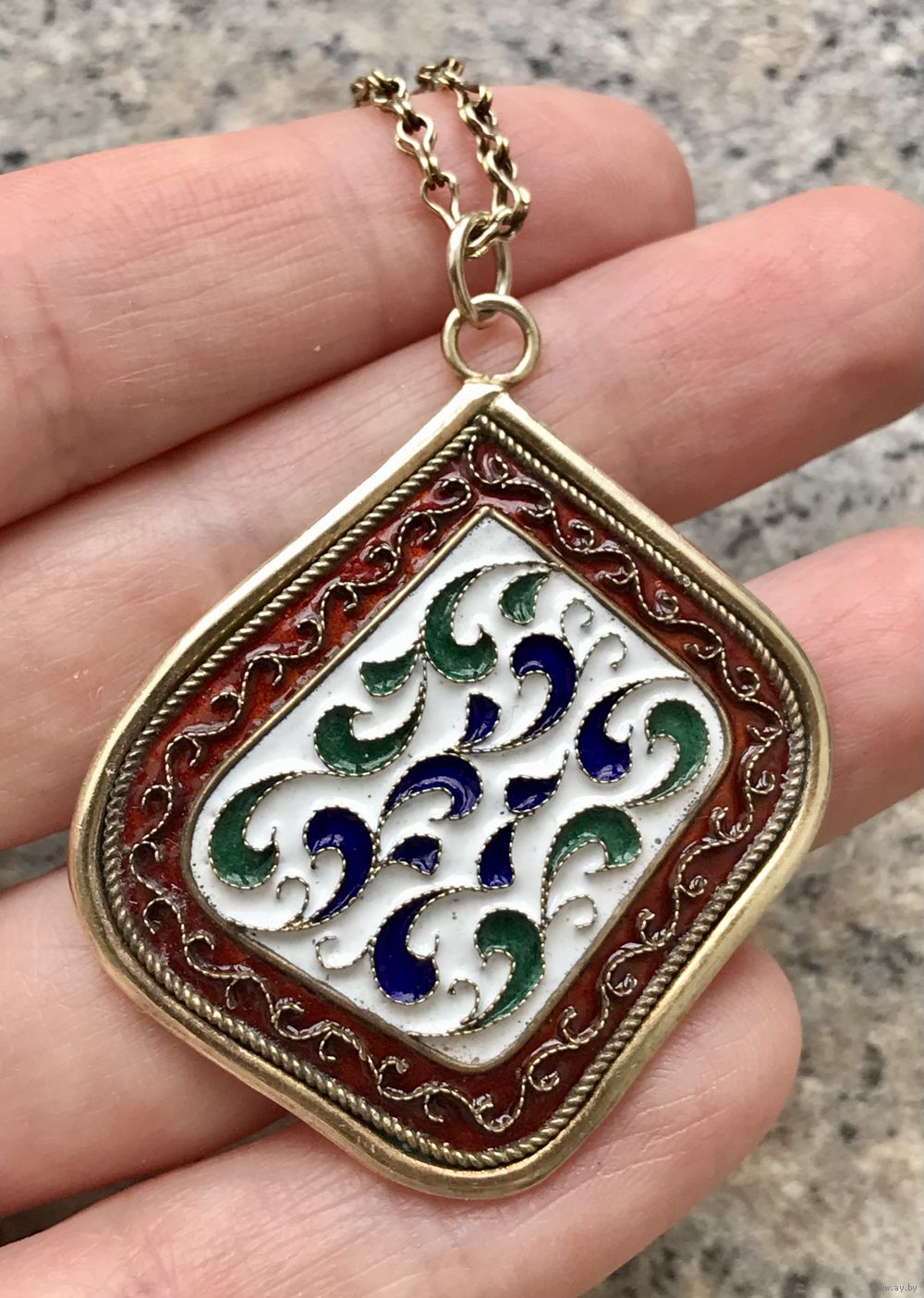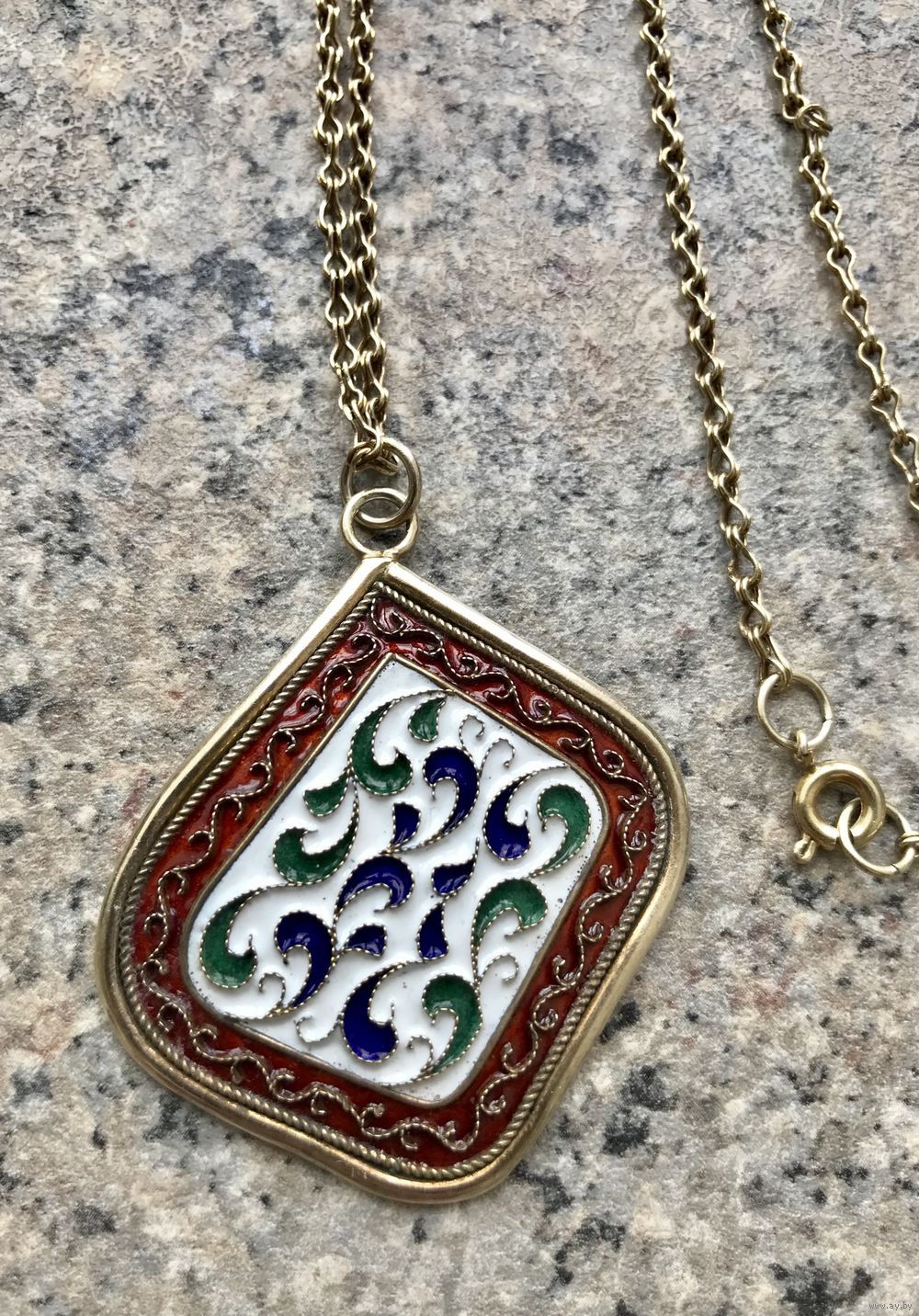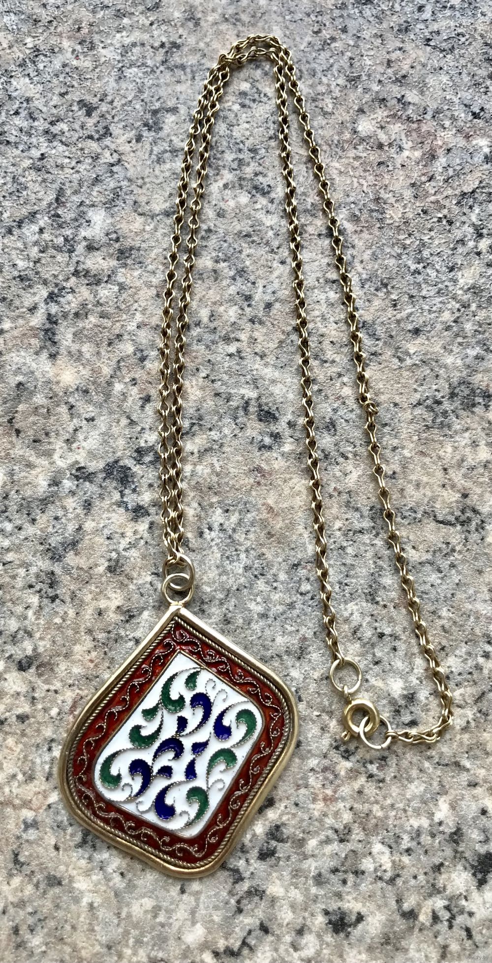 Крупный кулон с разноцветной эмалью, на цепочке. Серебро с позолотой. Отметок нет.