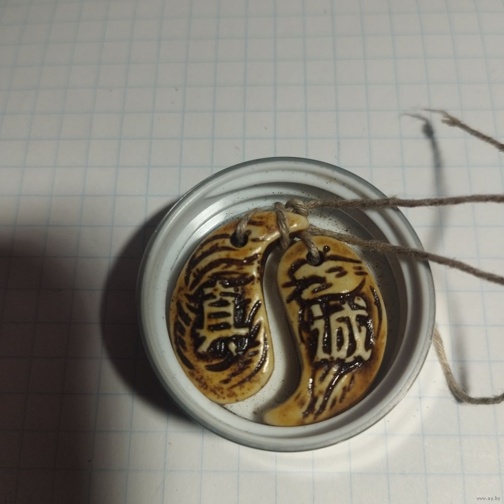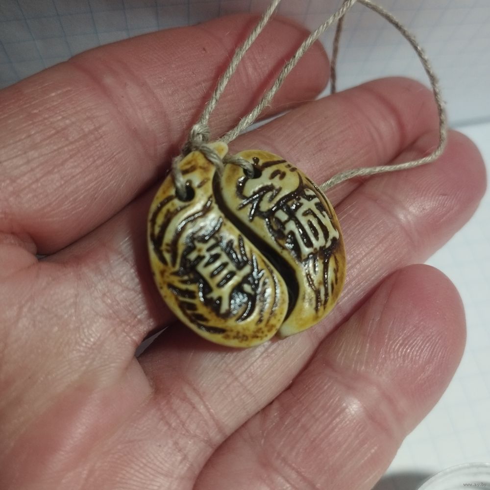 Нэцкэ или бусина Дзи, выполненная в форме символа Инь-Ян, который олицетворяет баланс противоположных сил.Изображение знаков внутри Инь-Ян часто связано с долголетием, защитой от негативной энергии и привлечением удачи. Материал неизвестен, вероятно по весу пластик, узор доработанный вручную . Используется как кулон, часть браслета или традиционное японское парное украшение.